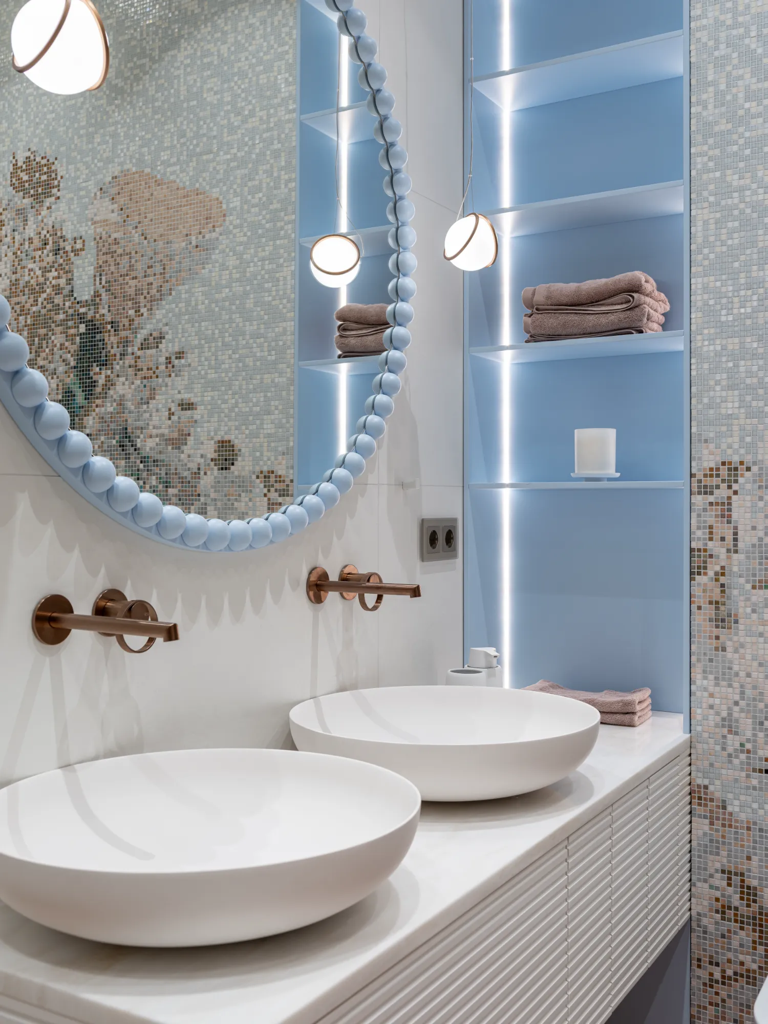 У цьому проєкті використані виключно преміальні бренди та ексклюзивні матеріали: натуральний мармур, цінні породи дерева, художнє скло та високоякісний текстиль. Багато меблів було створено за індивідуальними кресленнями, а деякі предмети розроблені капсульно спеціально для цих апартаментів, що робить інтер’єр неповторним.