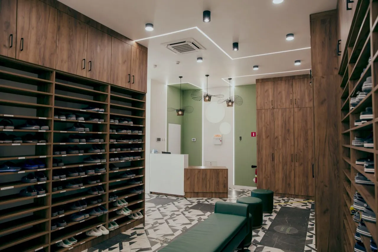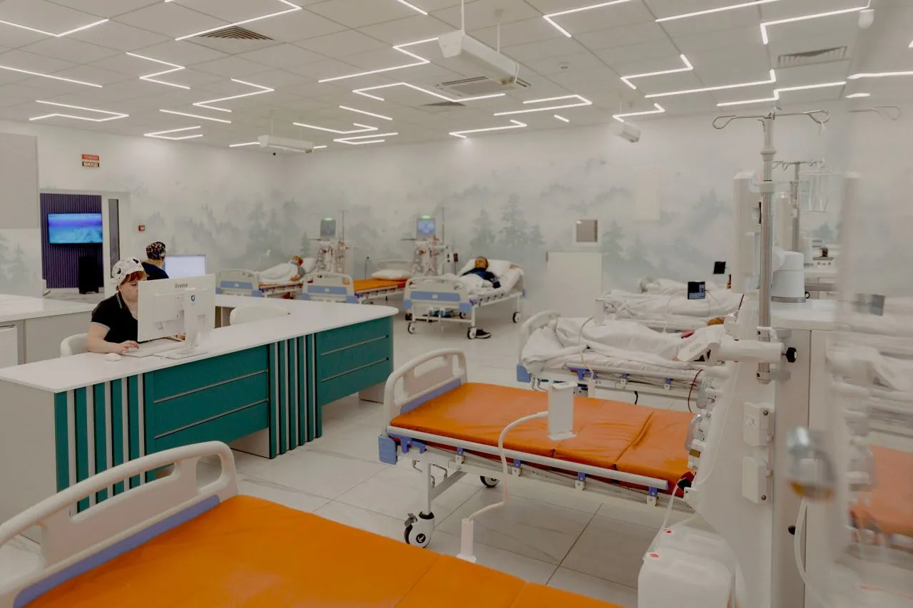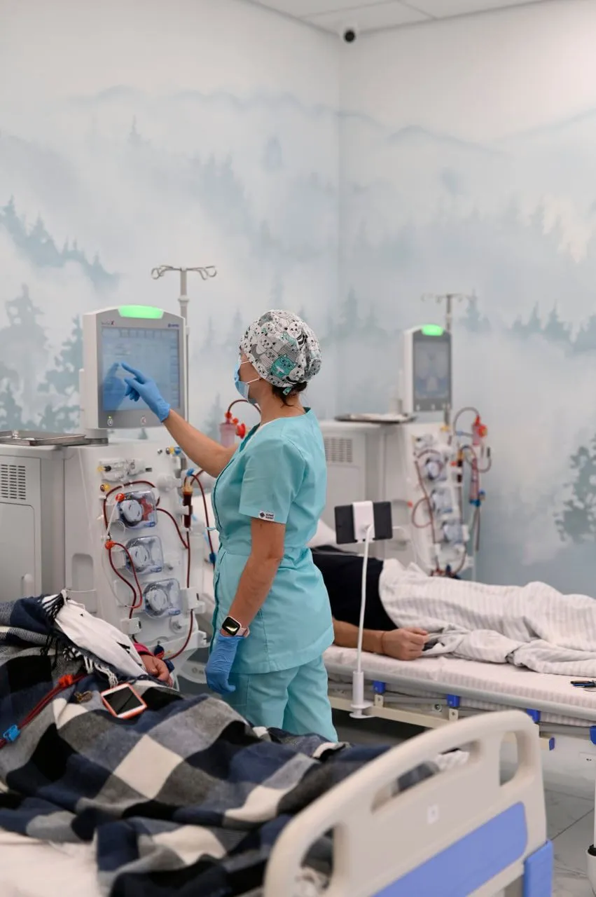 Головна зона клініки — просторі зали, кожен з 20+ сучасними апаратами для гемодіалізу. Для пацієнтів передбачено персональні місця з медичними ліжками, індивідуальним освітленням і підведенням обладнання. Все продумано для людей, які 2-3 рази на тиждень по 3 години свого життя проводять тут: вони спокійно можуть закритися спеціальними шторами, підведені зарядні пристрої, підставки для телефону та планшету, ергономіка кожного ліжка продумана для максимально комфортного перебування пацієнта на процедурі. Простір наповнений світлом завдяки великим вікнам та продуманій системі лінійного освітлення. На стінах — графічний принт із силуетами лісу, що створює асоціацію зі спокоєм і природною свіжістю.