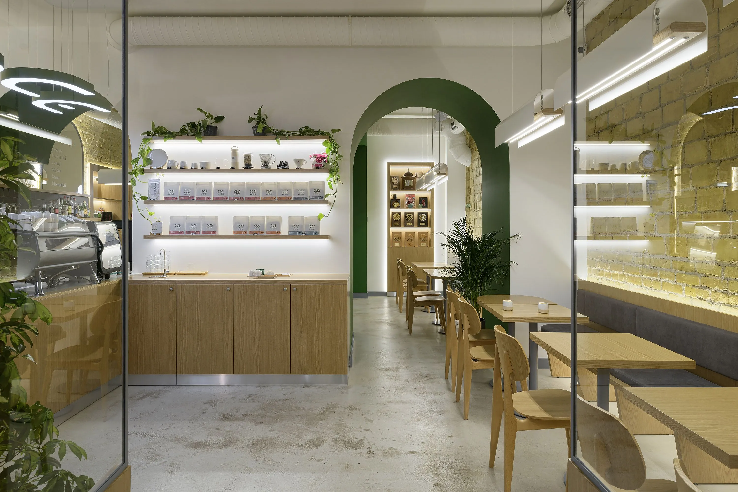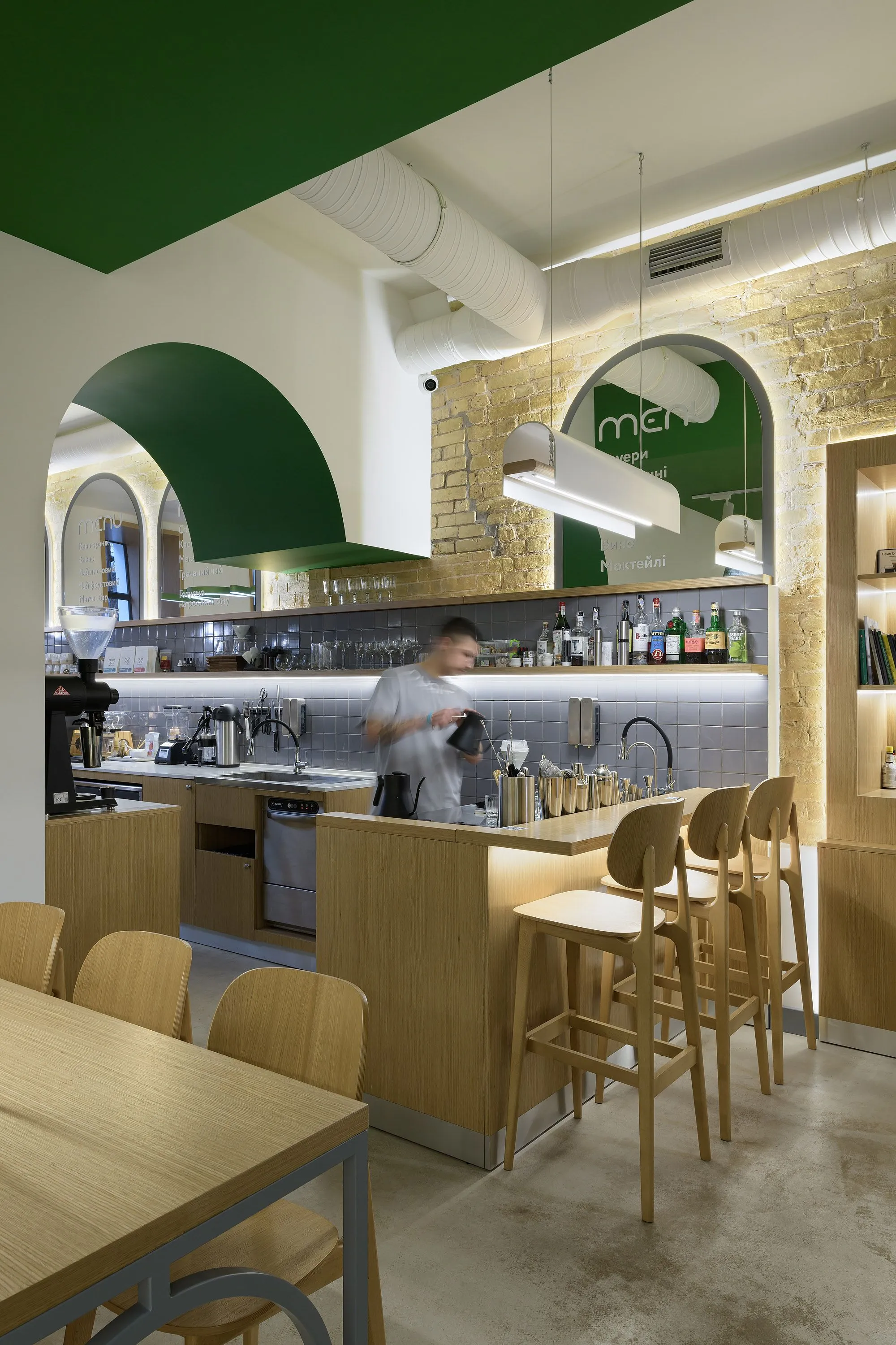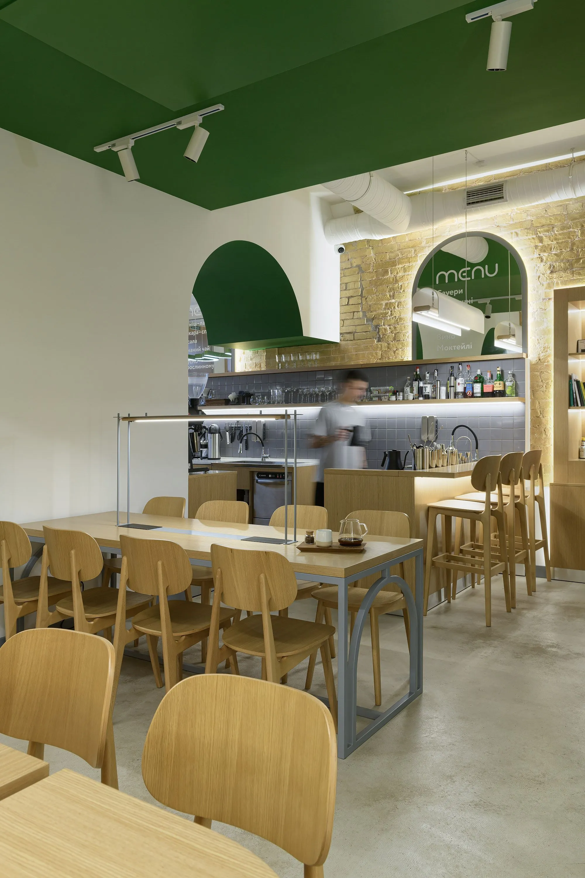 Простір кав'ярні ділиться на дві зали з арочними проходами, але їх об'єднує спільний бар, який в свою чергу ділиться на кавовий та алкогольний.