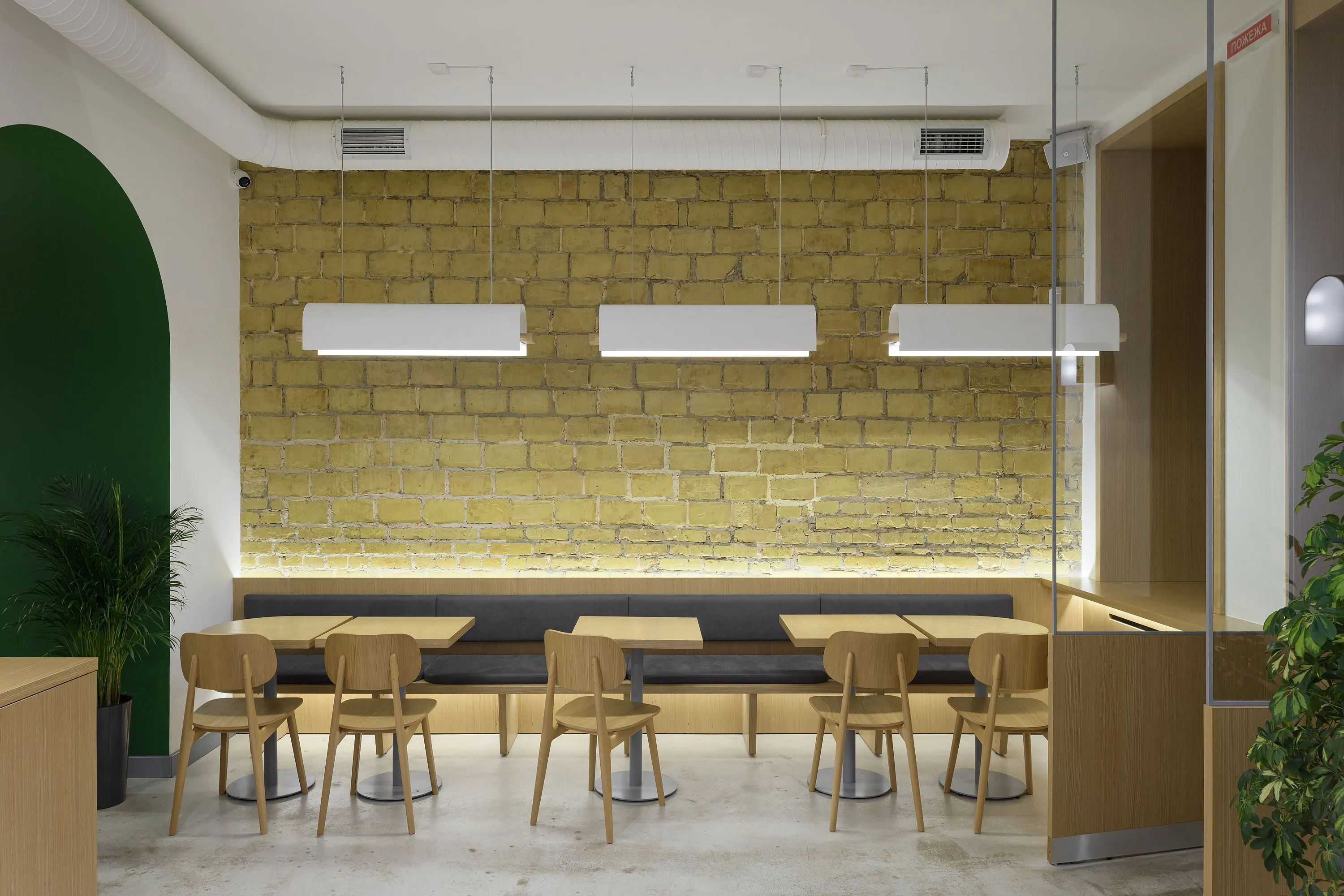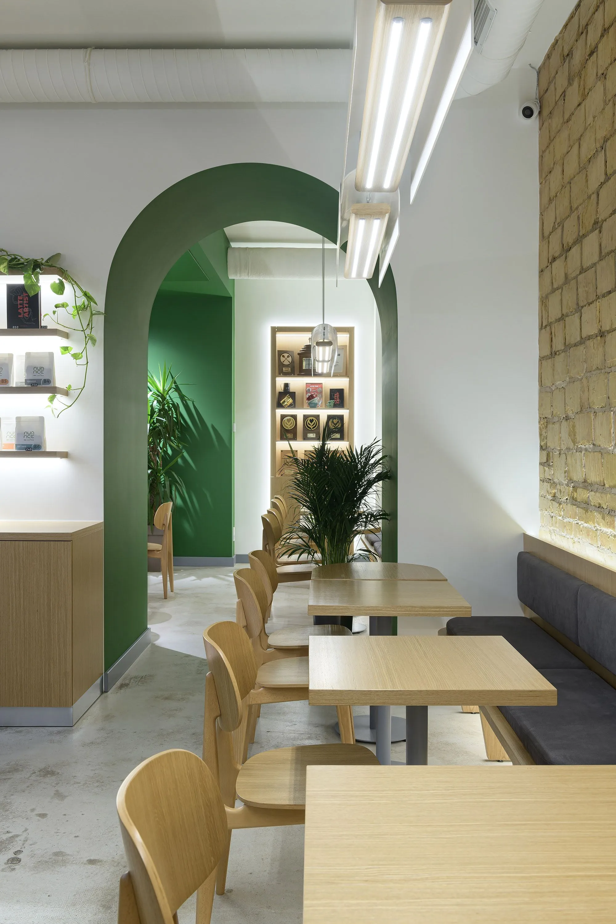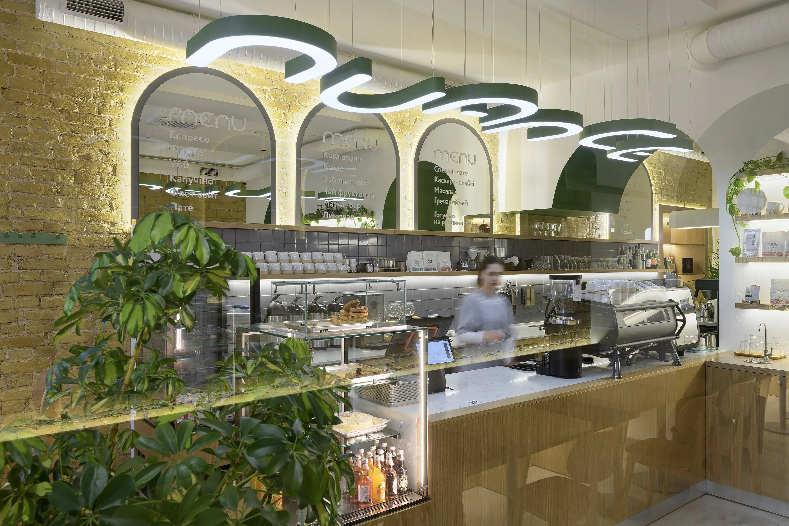 Дизайн підкреслюють індивідуальні світильники-літери як на логотипі кав'ярні, айдентика інтегрована в інтер'єр