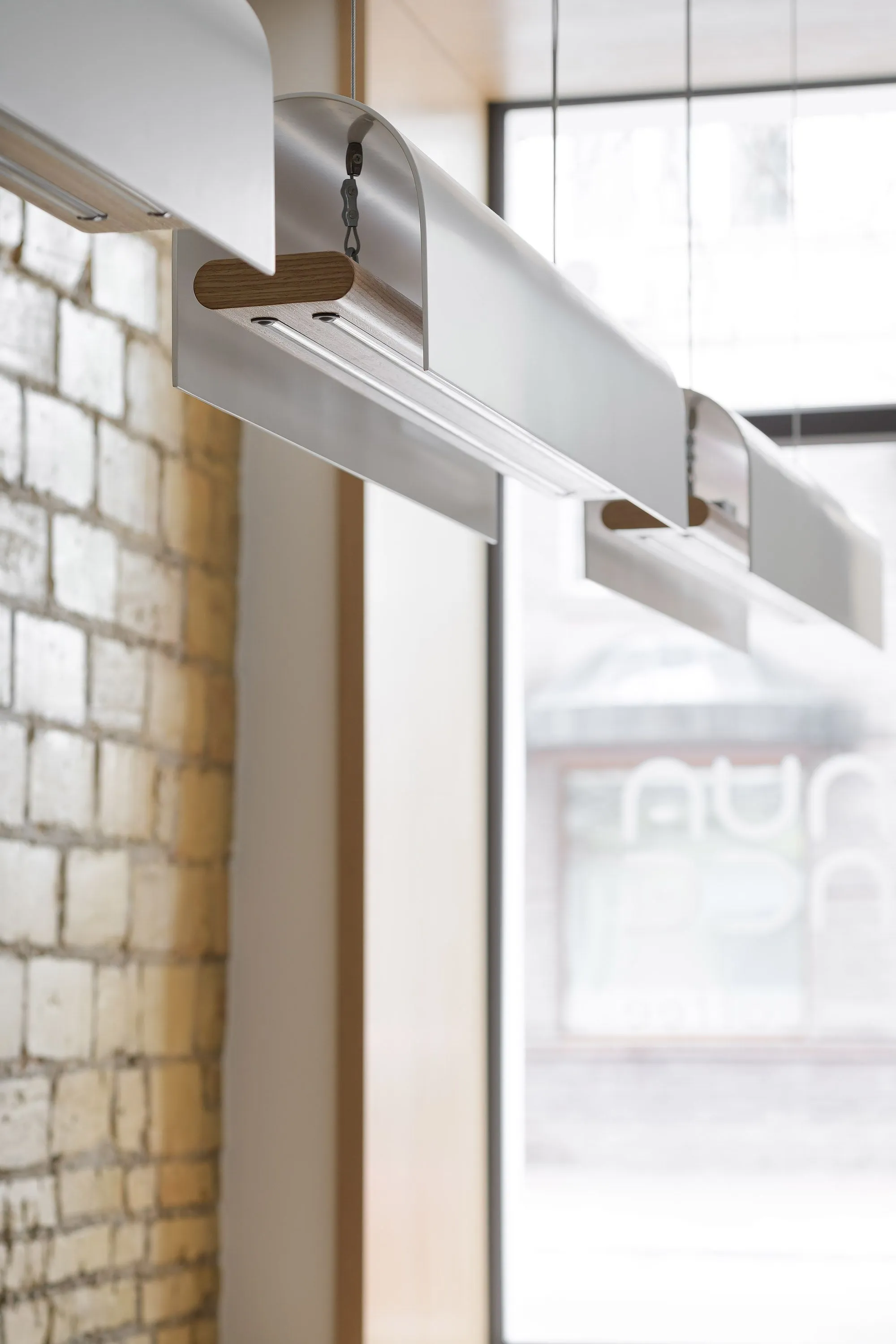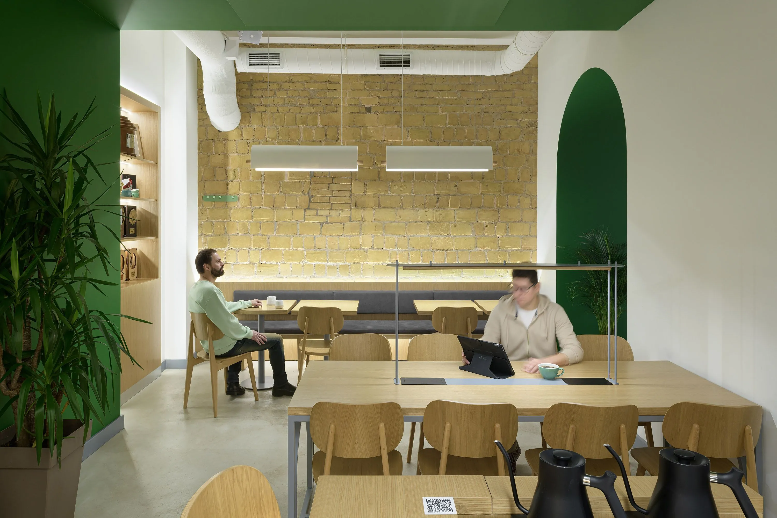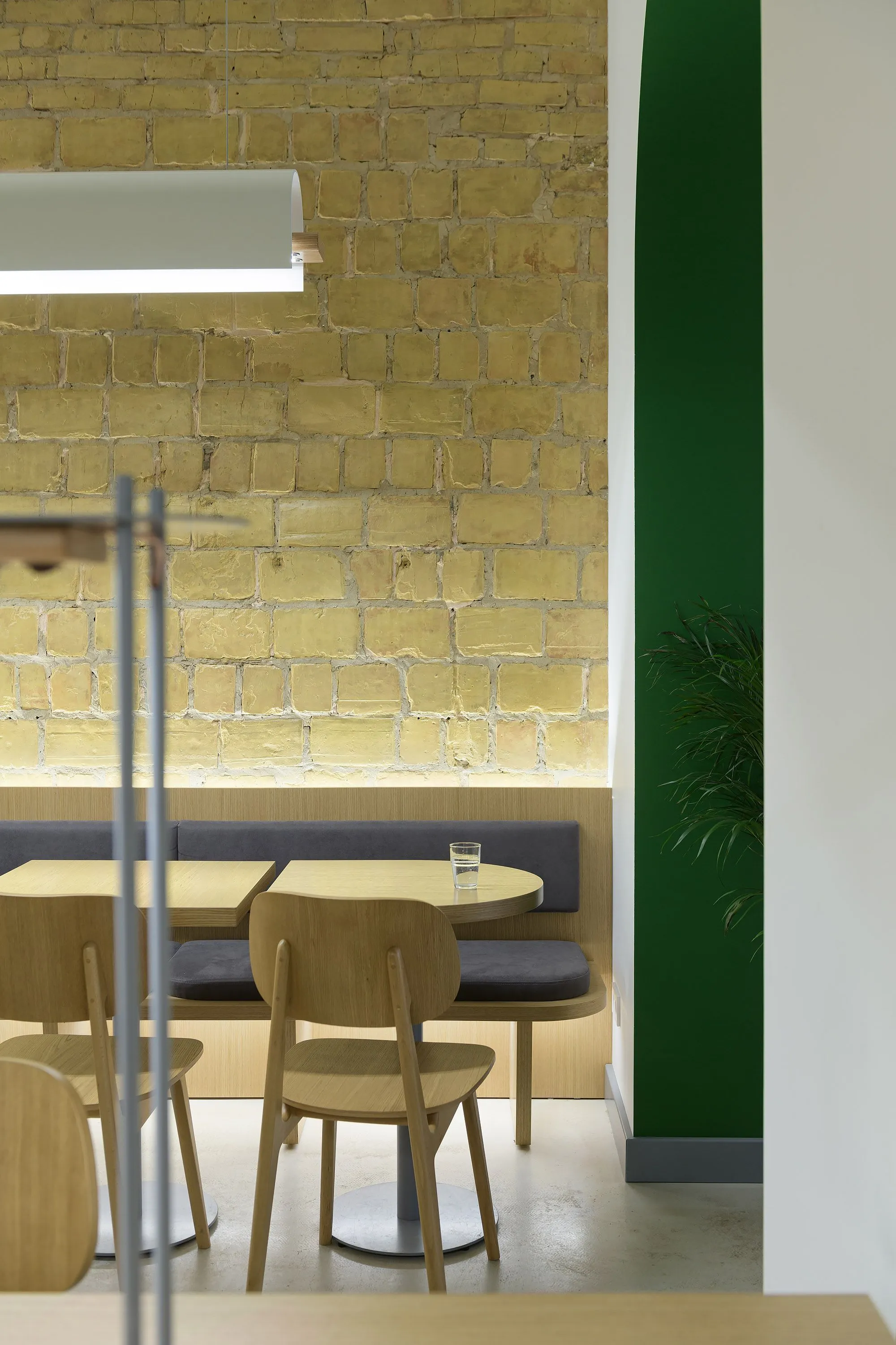 Дизайн підкреслюють індивідуальні світильники-літери як на логотипі кав'ярні, айдентика інтегрована в інтер'єр