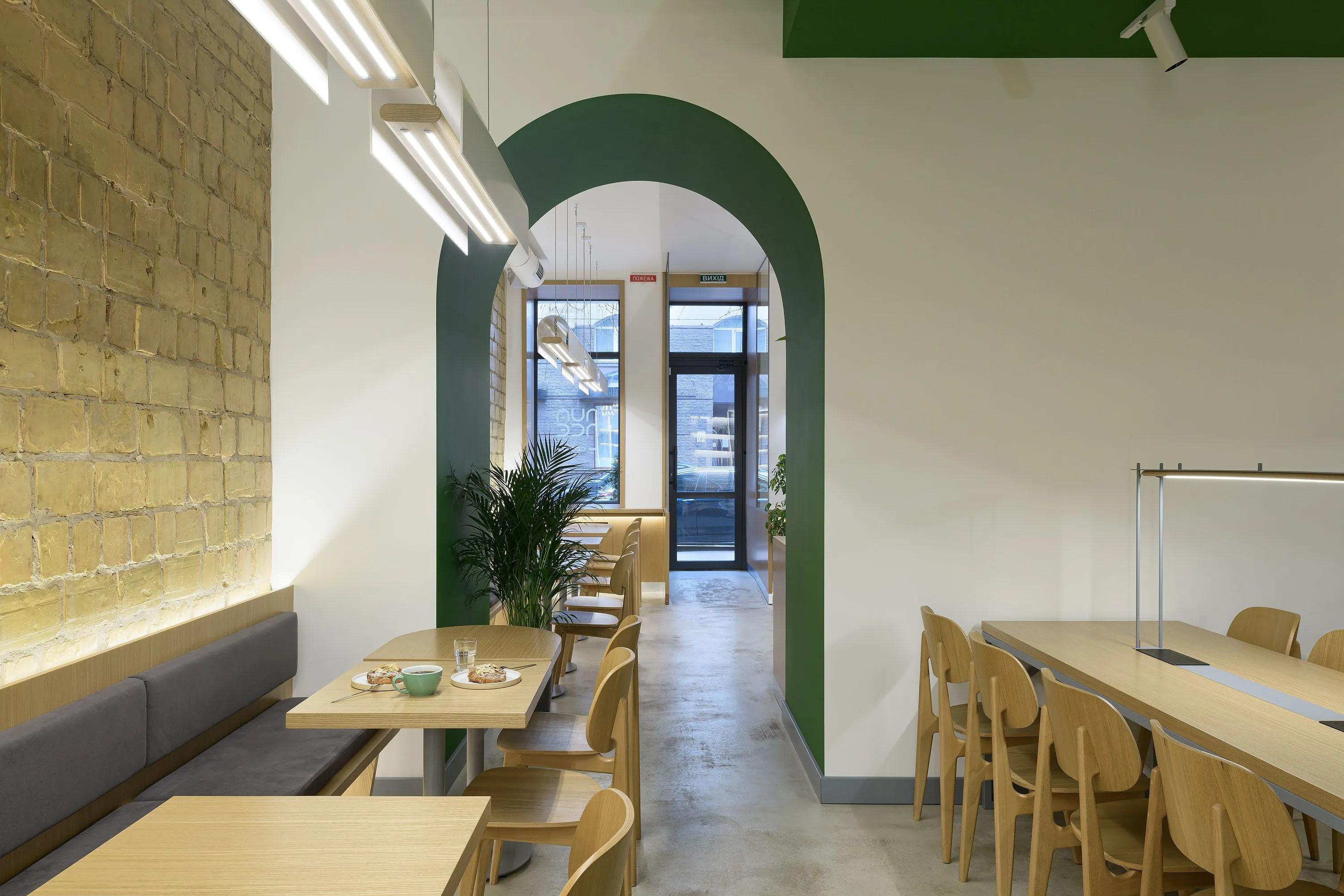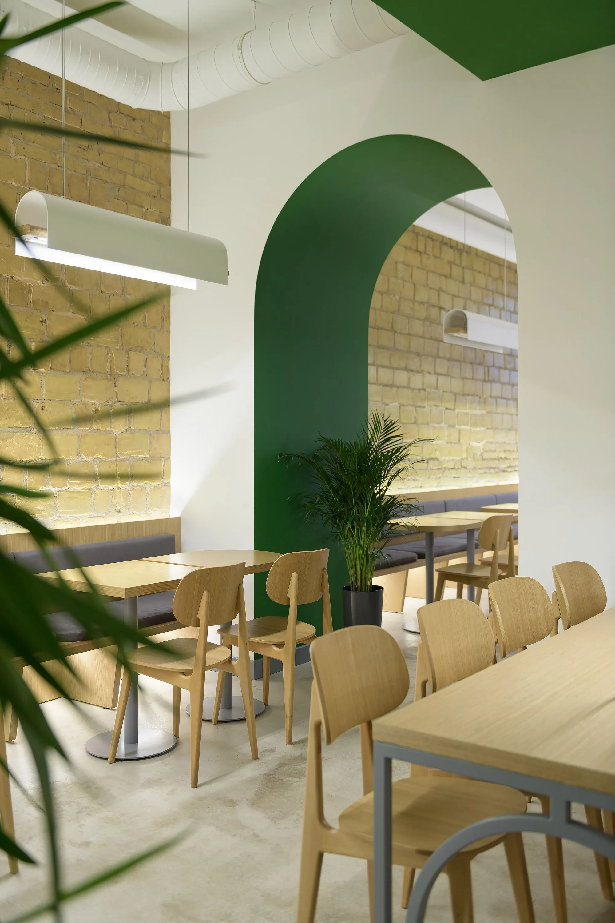 Логотип-душки, фірмовий паттерн, арки в інтер'єрі, світильники, спинка стільців та навіть вішак для одягу, нагадують деталі логотипа!
