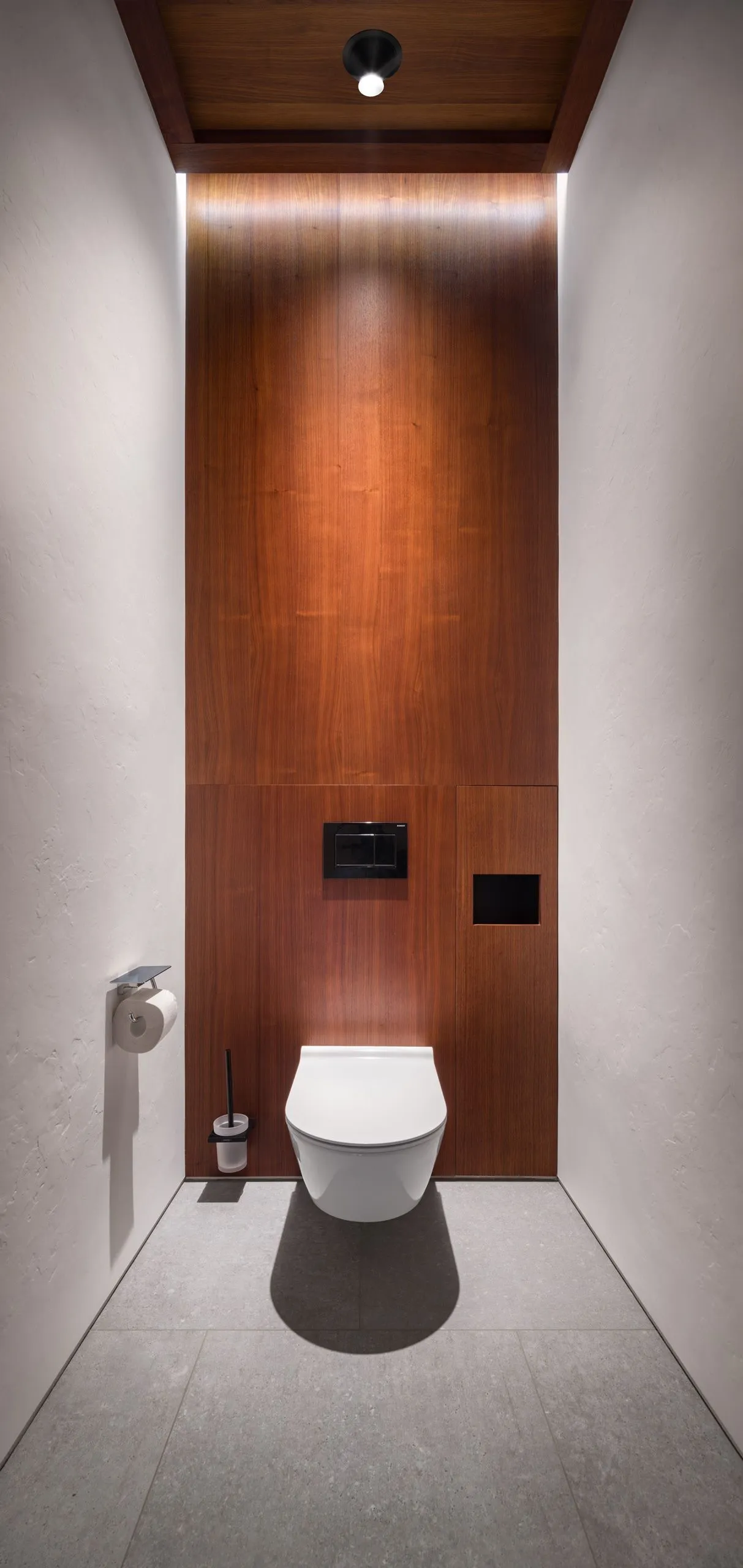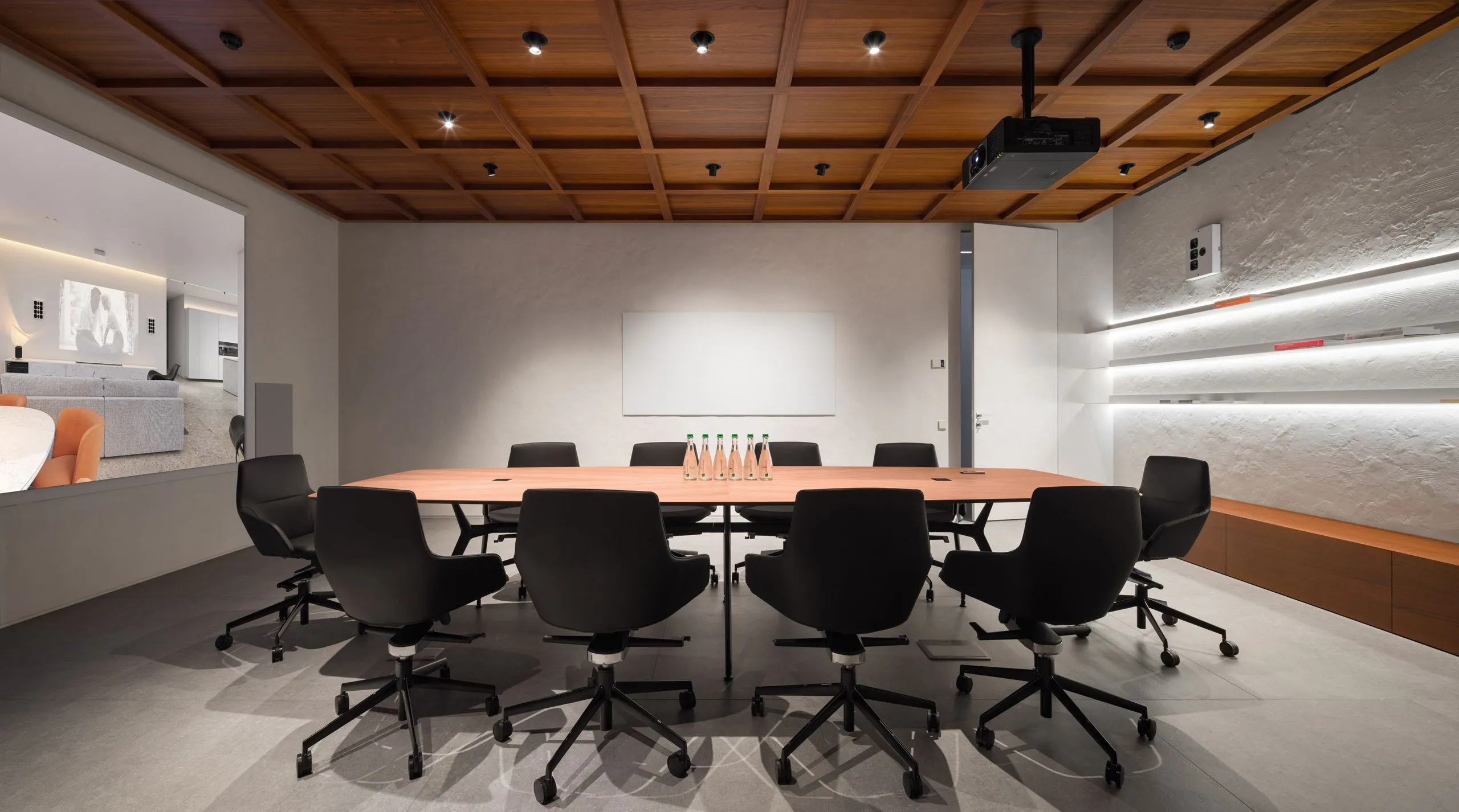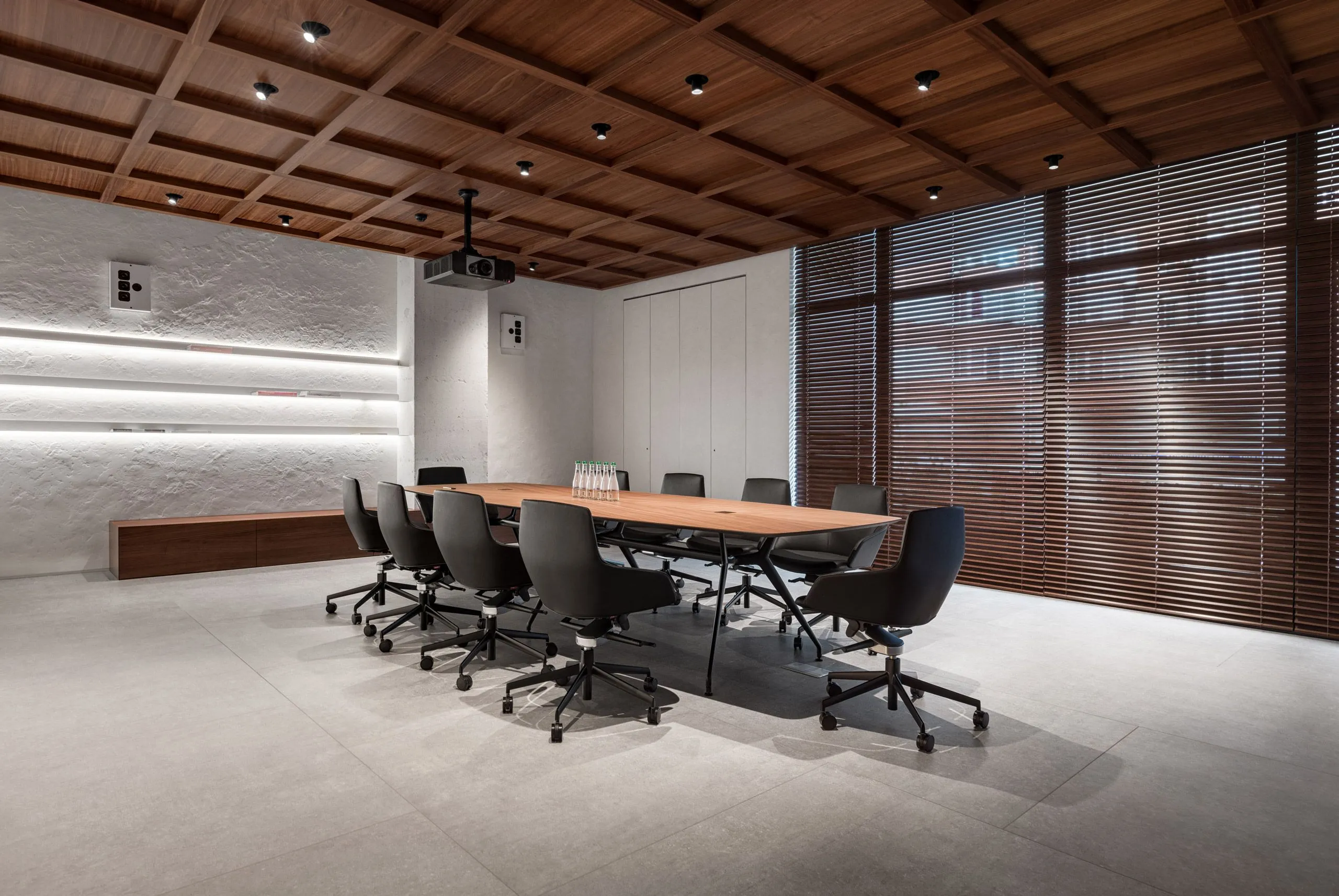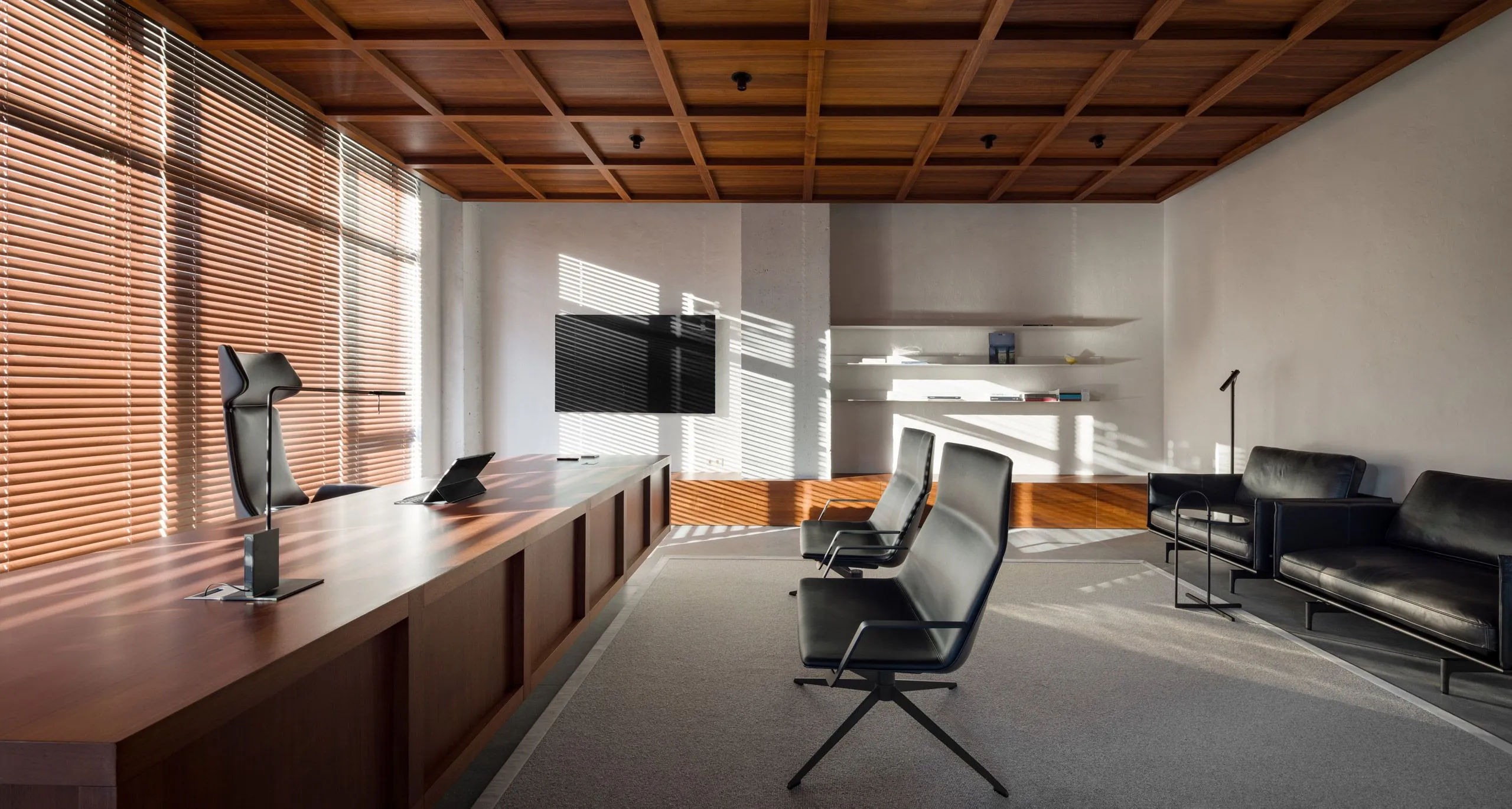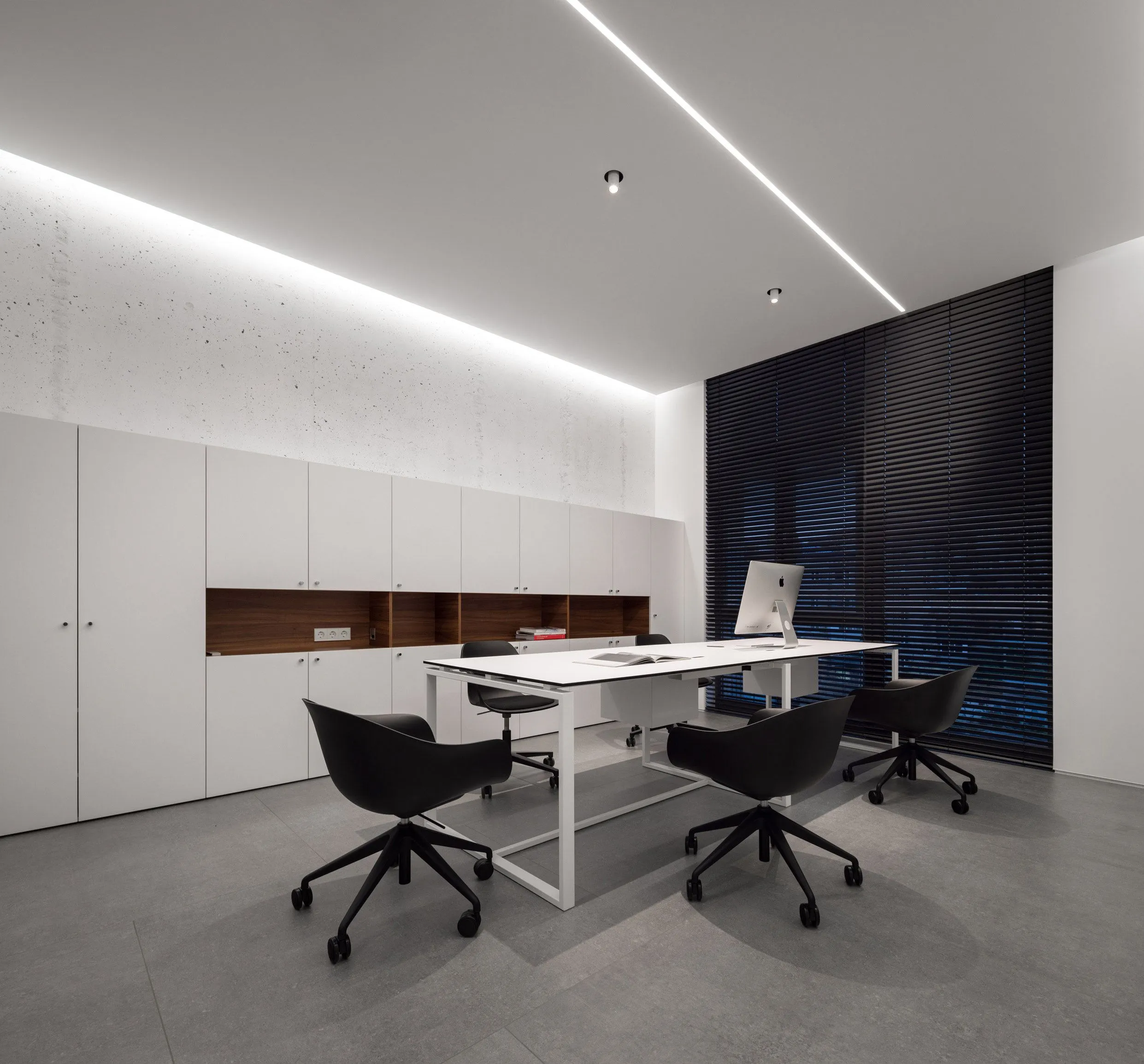 Кольорове рішення інтер'єру базується на балансі світлих та насичених темних тонів, які врівноважуються візуальним теплом дерев'яних панелей зі шпону американського горіху.