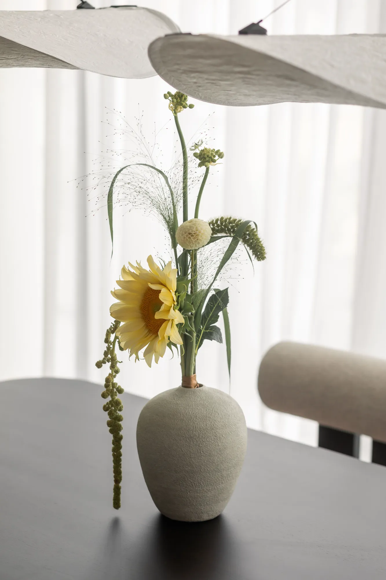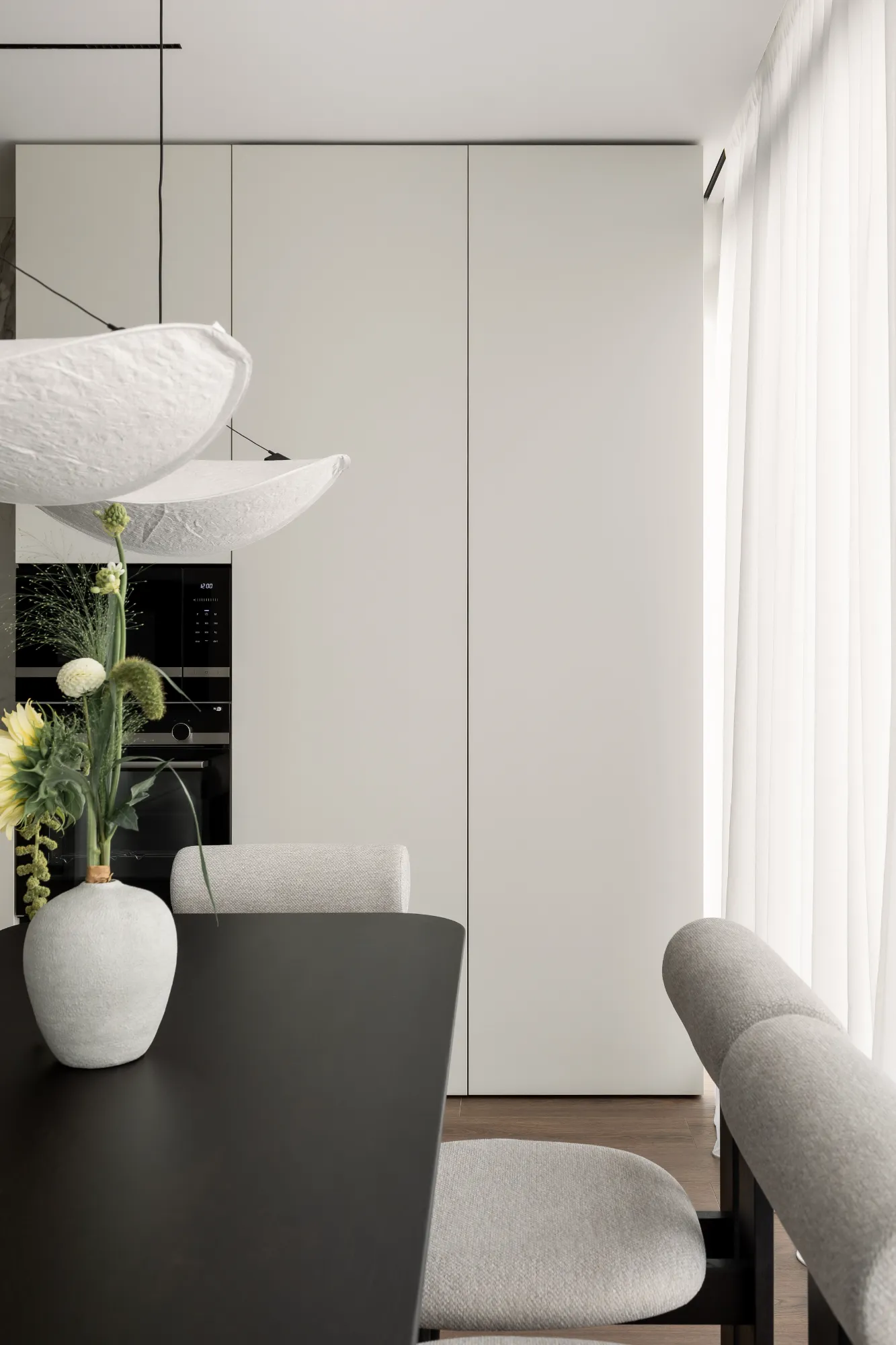 Кухня завершується розсувною системою Blum Revega, яка приховує робочий стіл, і створює ілюзію однієї площини. Напроти неї великий масивний кухонний стіл, що контрастує на фоні світлих стін та кухні, а тепло його підсвічують лампи від NewWorkers.