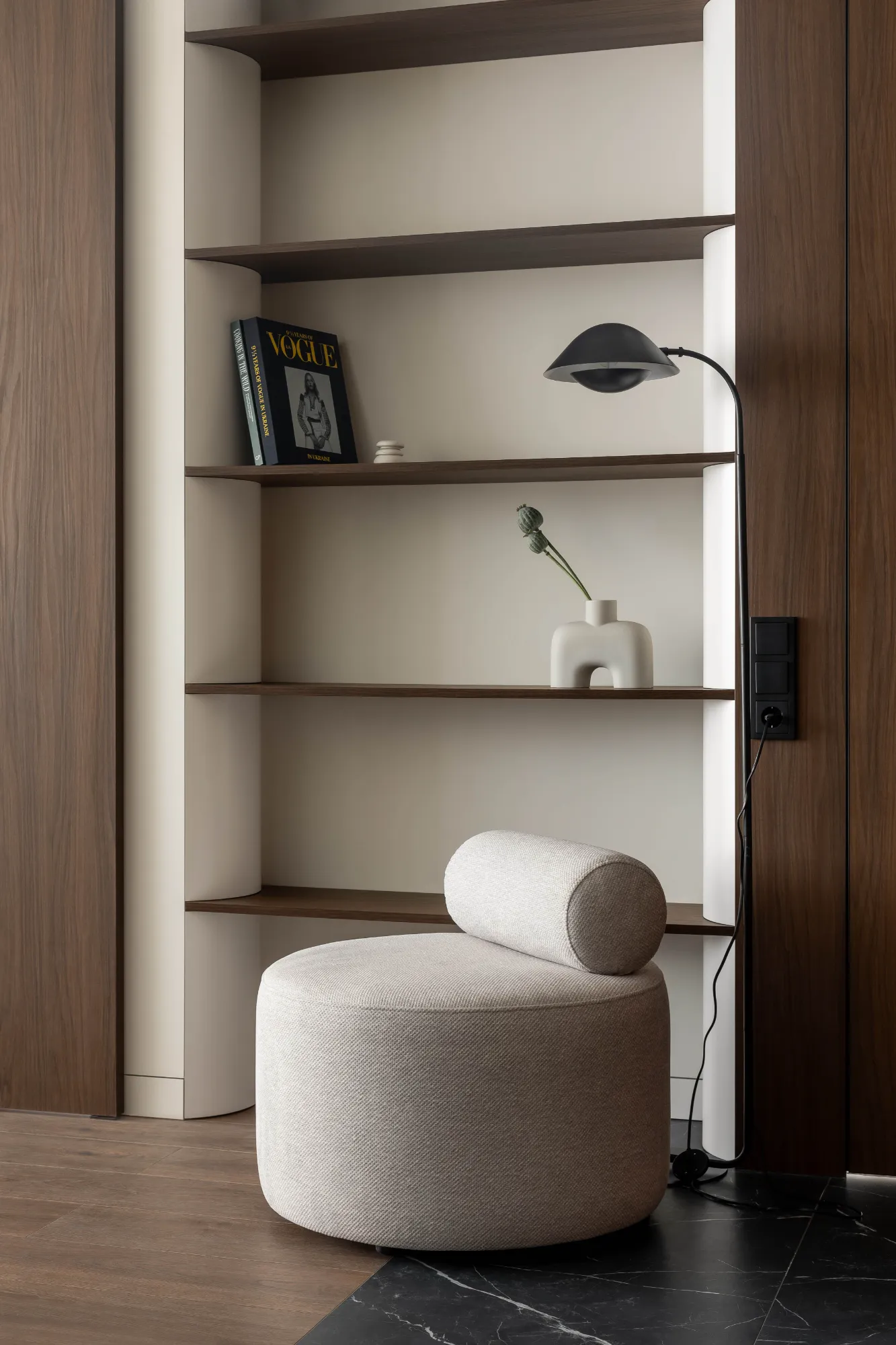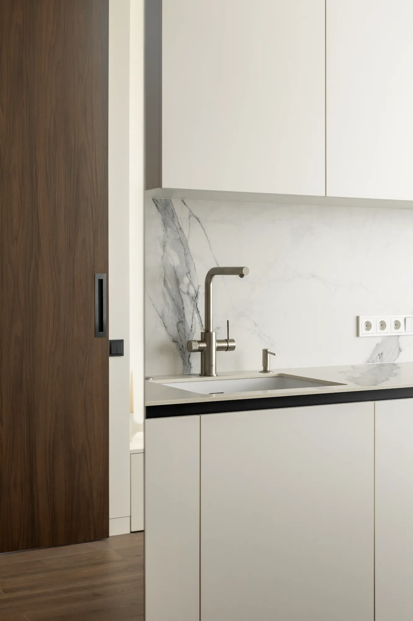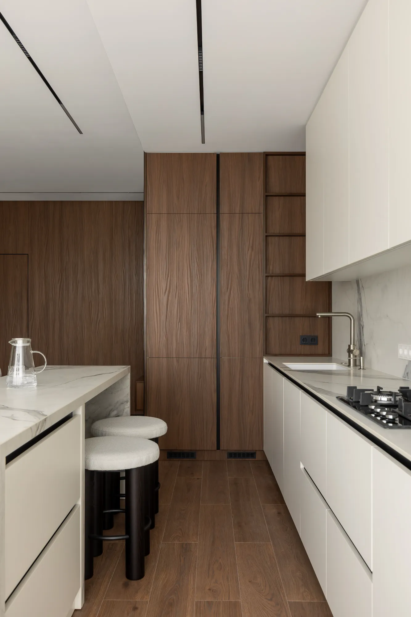 В основі проєктування закладено ідею не створювати додаткових об’ємів, а вписувати меблі в один рівень зі стінами. Таким чином, щоб одна площина перетікала в іншу максимально плавно та створювала зрозумілу та зручну геометрію. А технічні рішення інтегрувались легко та не створювали візуального шуму.