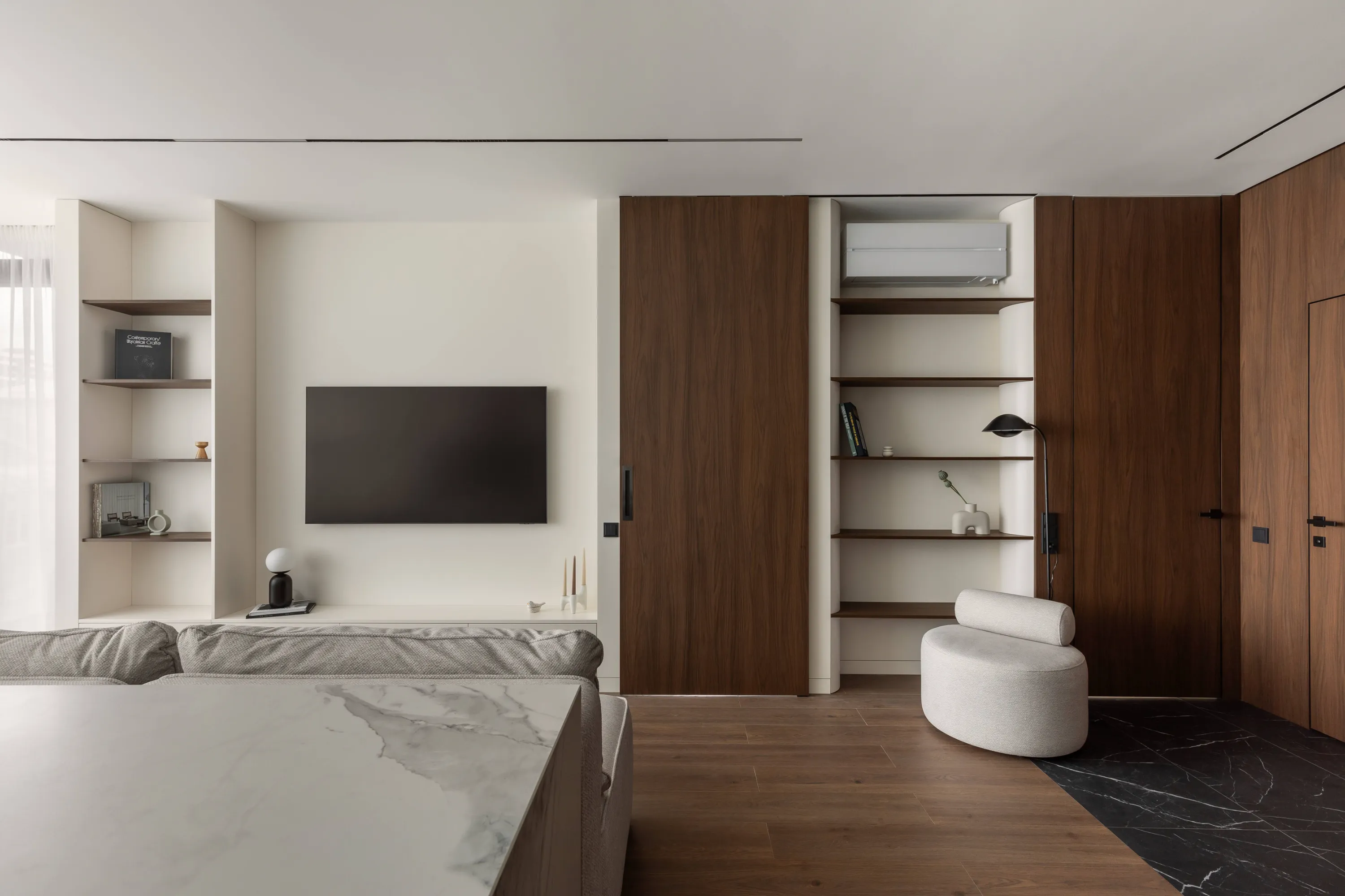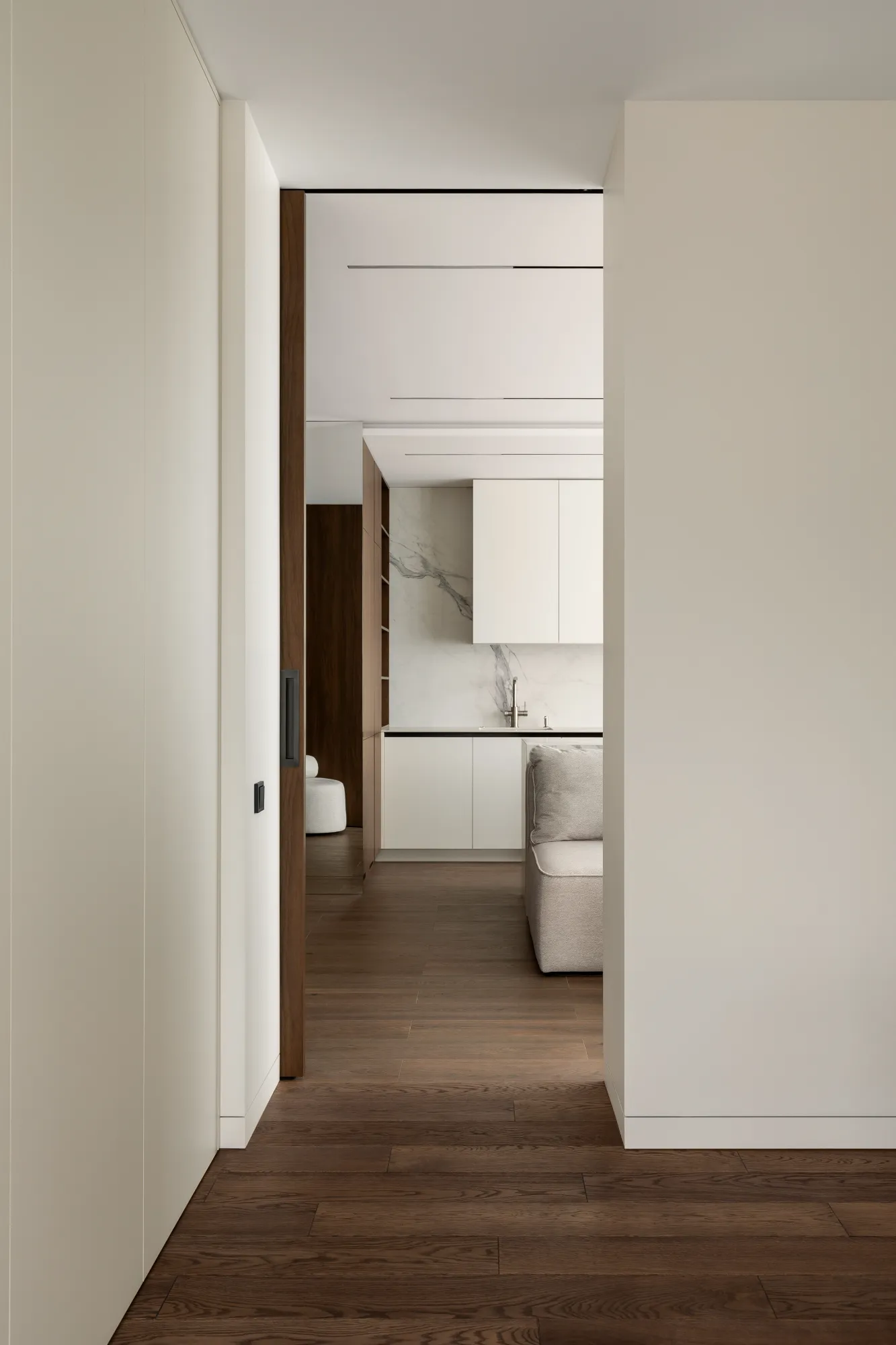 Спальню та вітальню розділяють розсувні двері, прихованого монтажу, з того ж матеріалу, що кухня та меблеві панелі коридору, які інтегровані в одну площину з дверима санвузла та гардеробної. Кімната є невеликою, але сприймається просторою, через дзеркала у зоні ліжка та великого вікна. Акцентом простору є прихований проєктор з ліфтом у стелі, що при опуску світить на фасади шафи та звукова система у стелі.