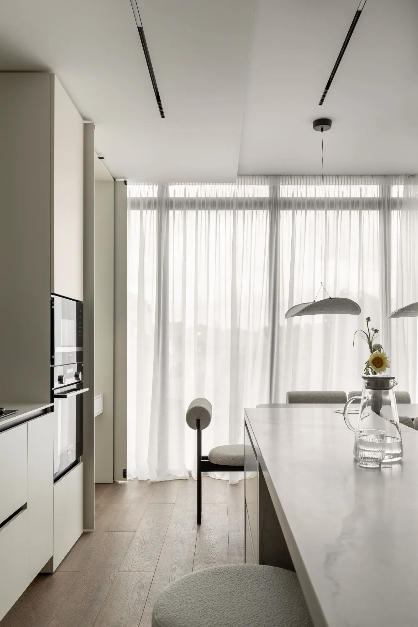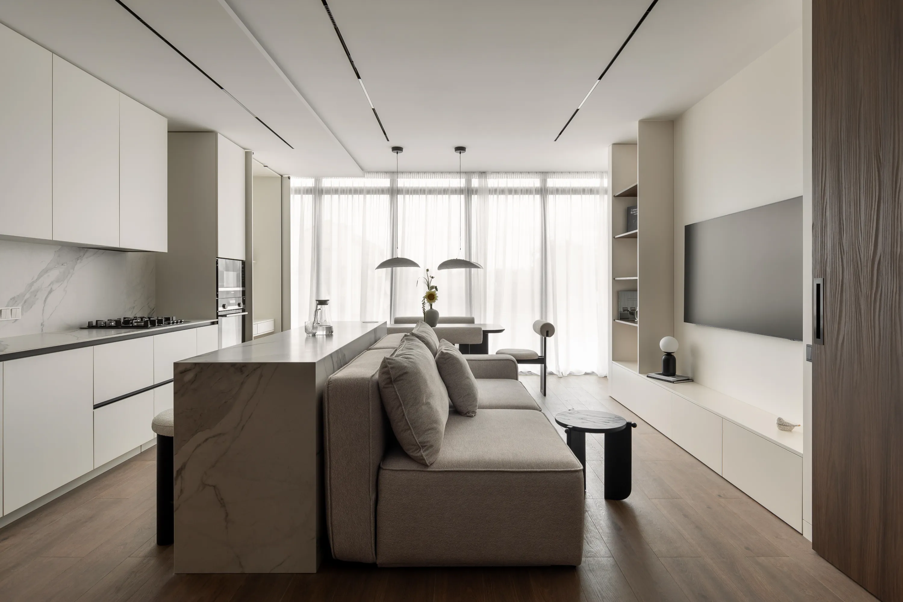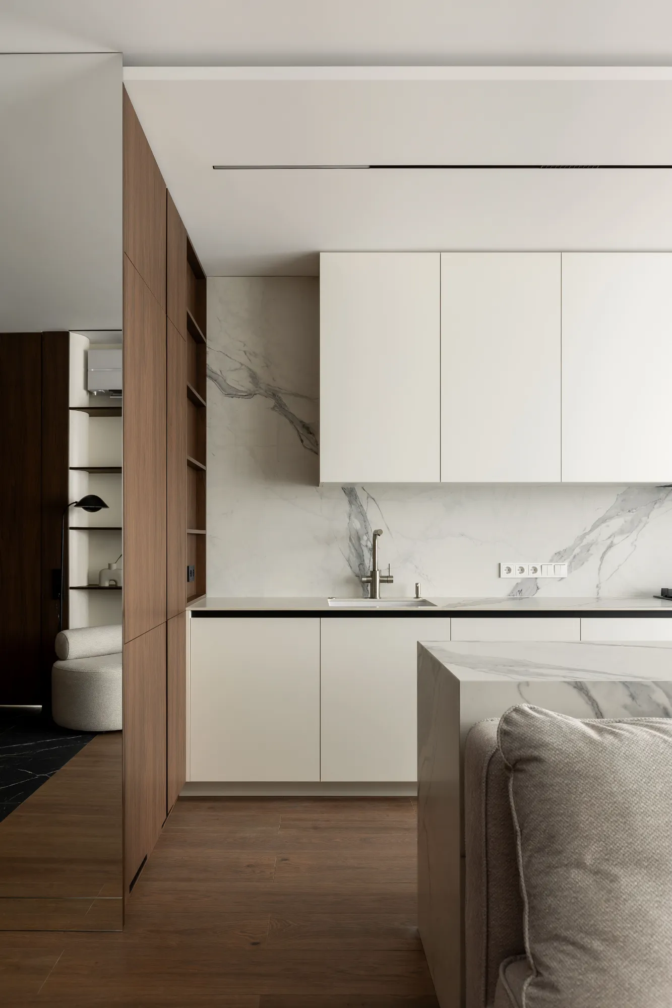 Зайшовши, у кухню-вітальню основною композицією є острів з керамограніту Torano Statuario, що повторюється на стільниці та фартусі та розмежовує їх між собою. Він має функцію зберігання, зони для сніданку зі стільцями Cenc(Wood Colection) та можливість зарядити телефон на виїзній розетці.