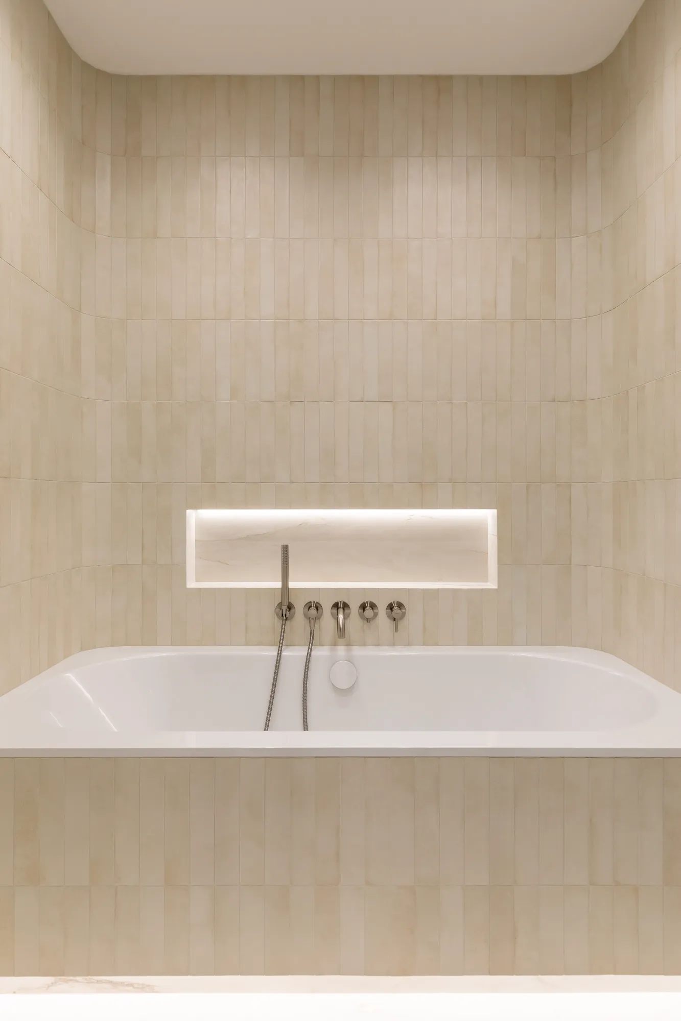Санвузол цього проєкту має незвичний кубічний умивальних з тієї ж плитки, що і стіни та поєднання зони душу та ванни в одне ціле, що відмежоване скляною перегородкою. Заокруглені кути ванни та форма дрібної плитки Ragno додають затишку цьому простору.
