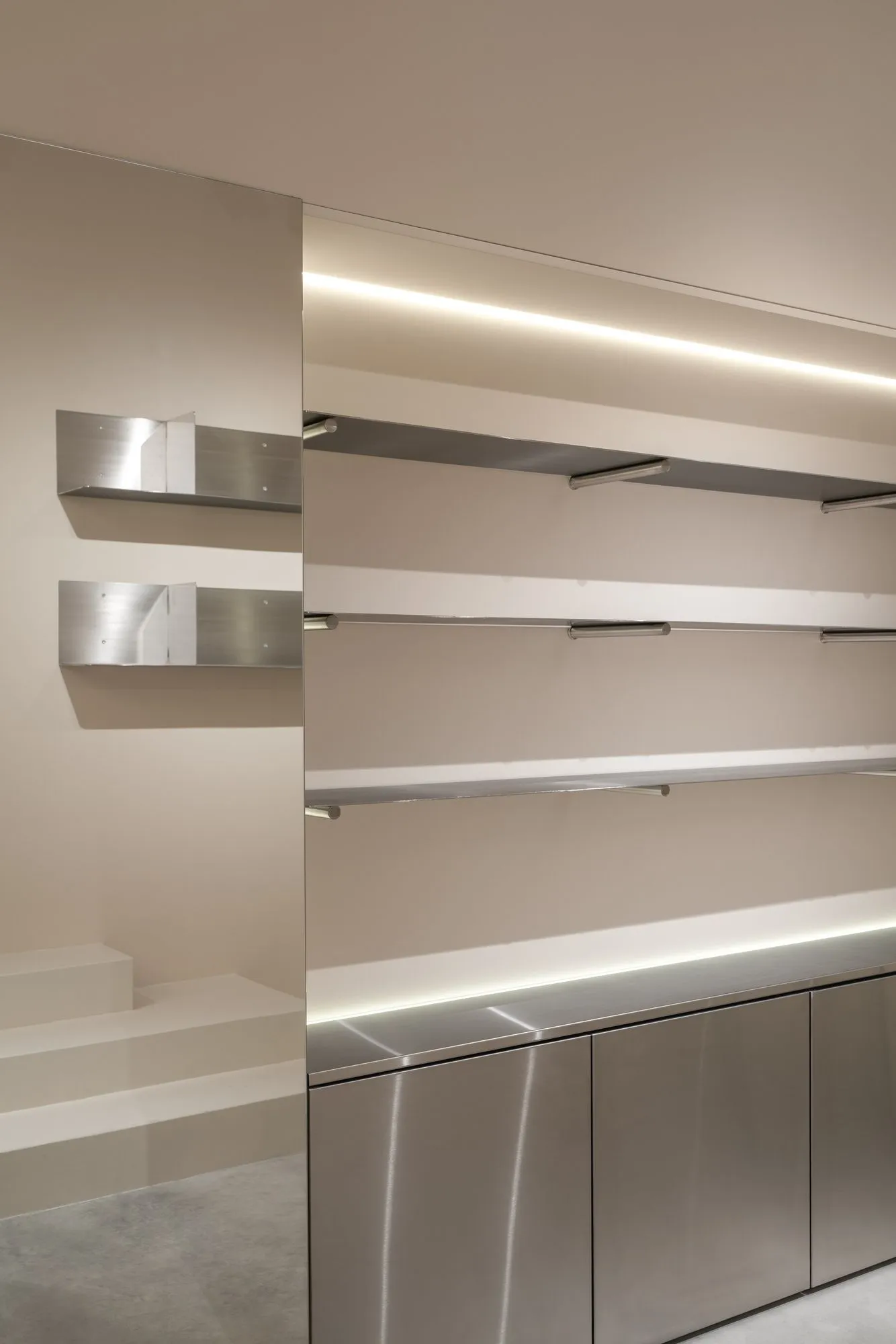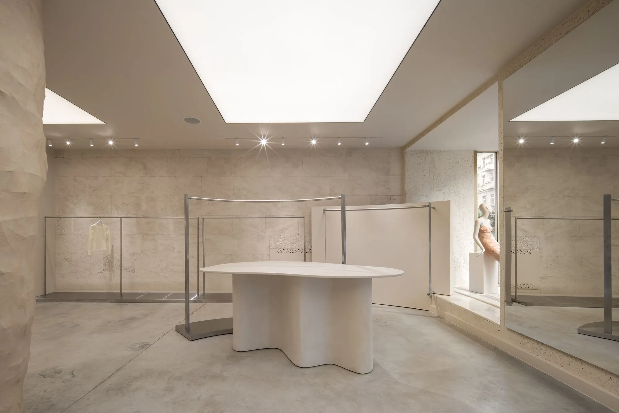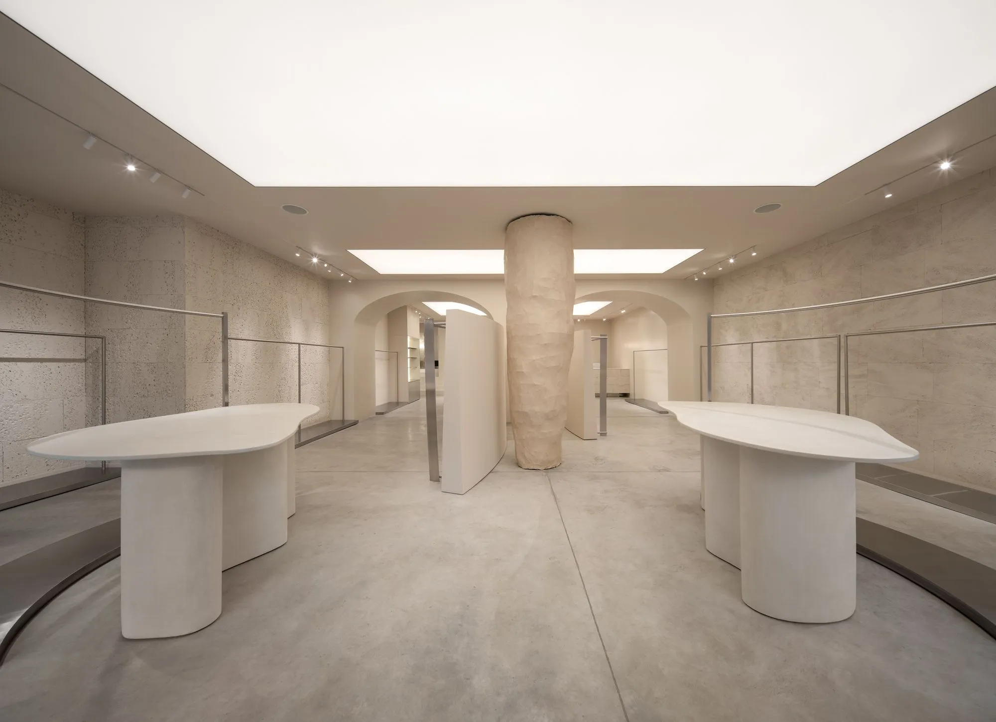 Дизайн базується на поєднанні природних матеріалів і чітких геометричних форм. Полірована бетонна підлога створює відчуття монолітності, а стелі зі світловими панелями забезпечують м'яке розсіяне освітлення, що підкреслює текстури матеріалів. Основою меблевих рішень стали індивідуально виготовлені вішалки з матового металу, що повторюють пластику наявних арок — їхня форма водночас скульптурна і функціональна, нагадуючи природні утворення та творчо переосмислюючи скульптурну мову Річарда Серри.
