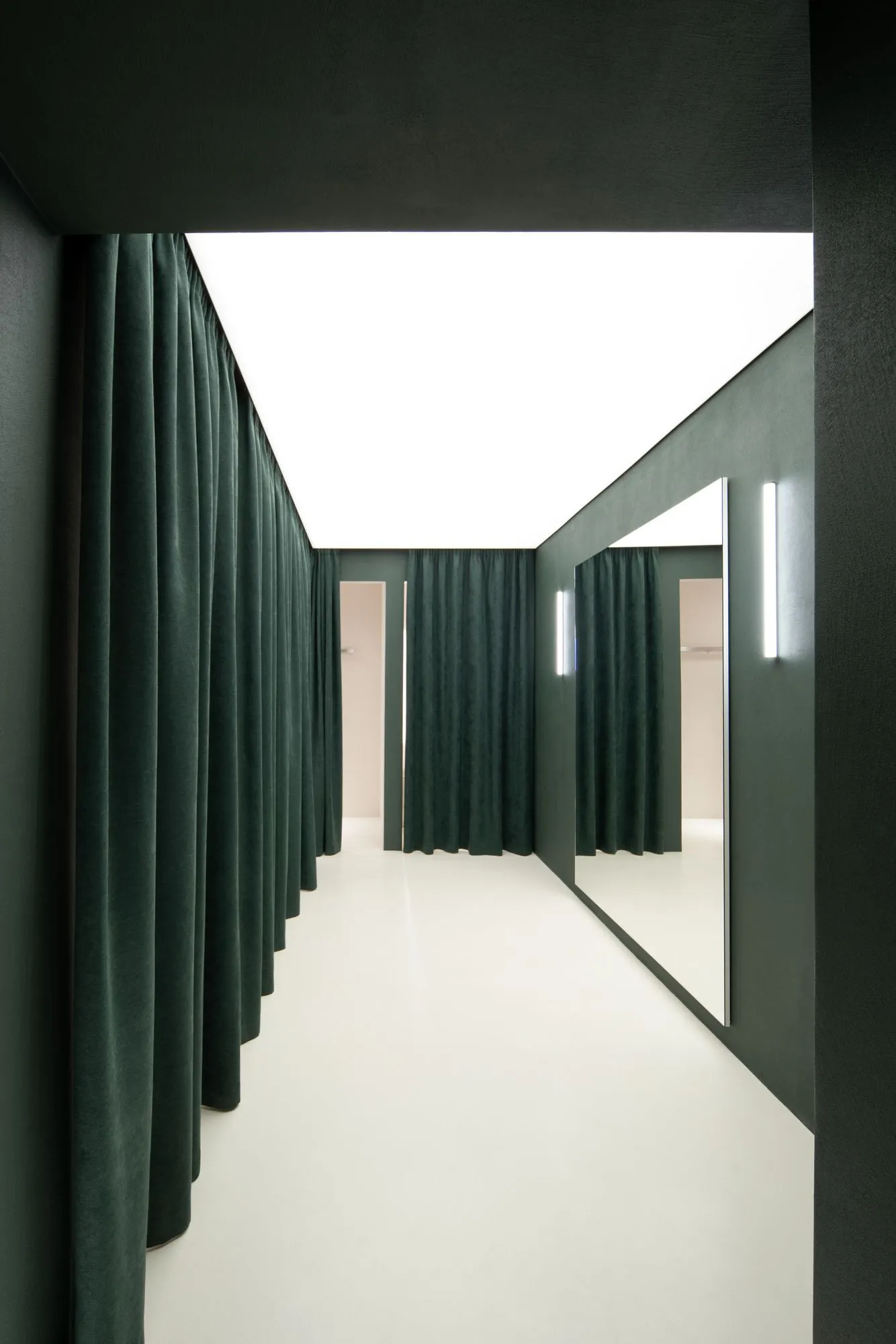 В окремій зоні, оздобленій насиченими зеленими оксамитовими шторами, розташовані примірочні. Колірний контраст створює глибину та візуальну інтригу, дозволяючи зосередити увагу на відображенні в дзеркалах у повний зріст. Перед входом до примірочної зони стоїть диван, оббитий тканиною Dedar, чий відтінок гармонійно поєднується з глибоким тоном оксамитових штор, а поряд — підлогова лампа Vitra дизайну Ісаму Ногучі, що продовжує концепцію м'яких хвилеподібних форм і теплих піщаних кольорів.