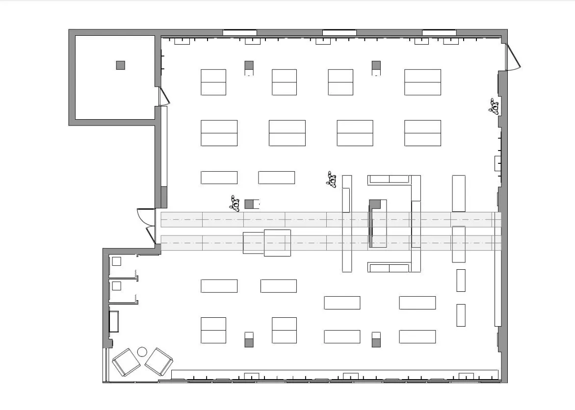 Окрему роль у формуванні атмосфери відіграє освітлення. Ми використали декілька його сценаріїв: трекові світильники для акцентування товару, декоративні підвіси над касовою зоною, що додають камерності, та LED-стрічки, які створюють графічні акценти та підкреслюють архітектурні лінії. Завдяки цьому інтер’єр отримав багатошаровість і можливість гнучкого налаштування атмосфери.