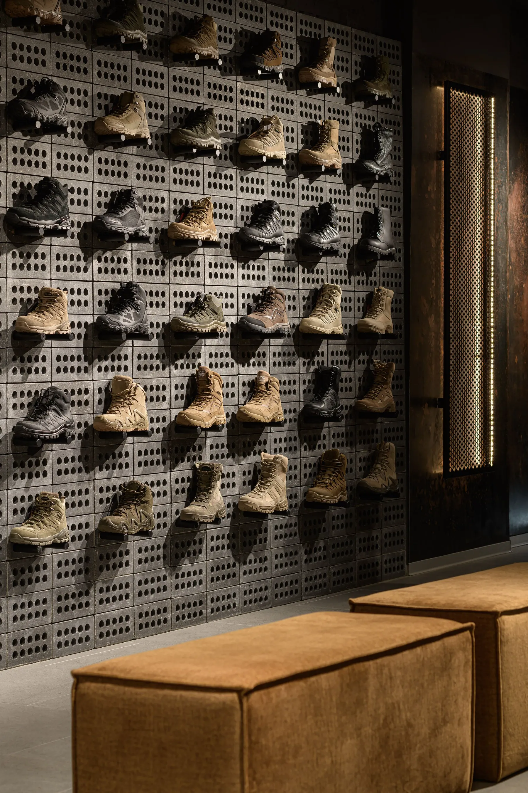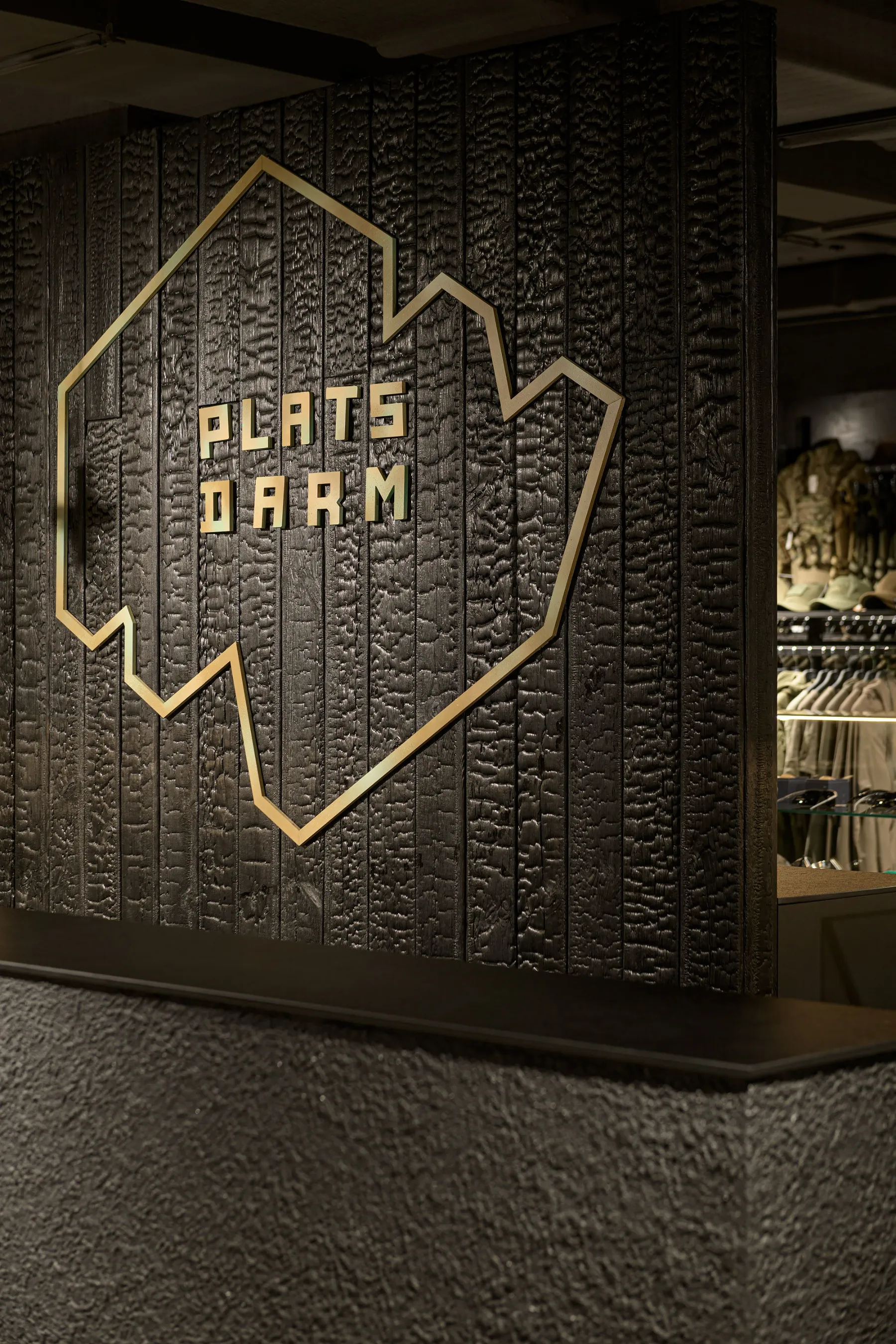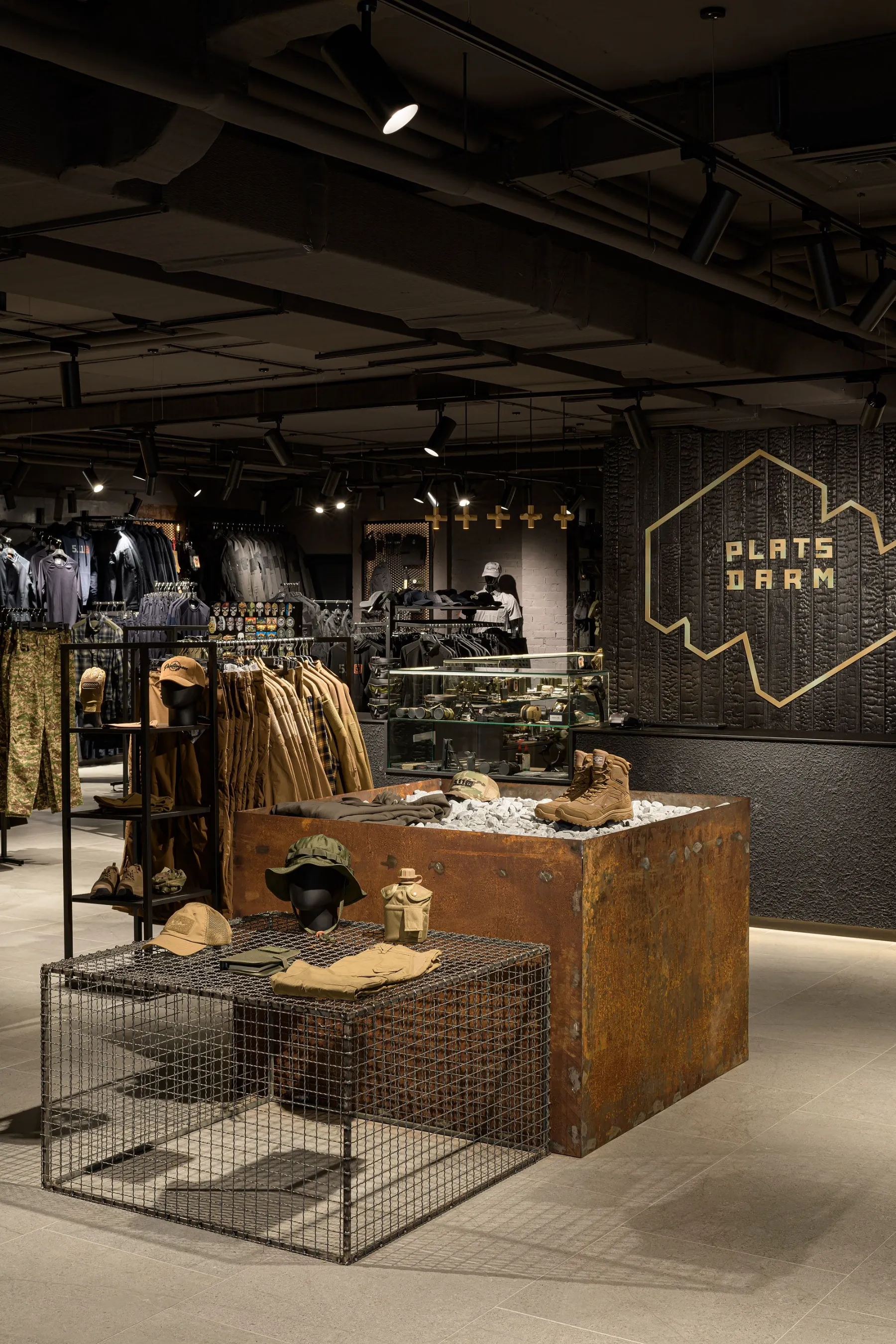 Дизайн магазину Plazdarm відображає силу, витривалість та справжність, закладені у філософії бренду. Концепція побудована у темній кольоровій гамі, яка формує атмосферу міцності та водночас створює контраст для демонстрації продукції.