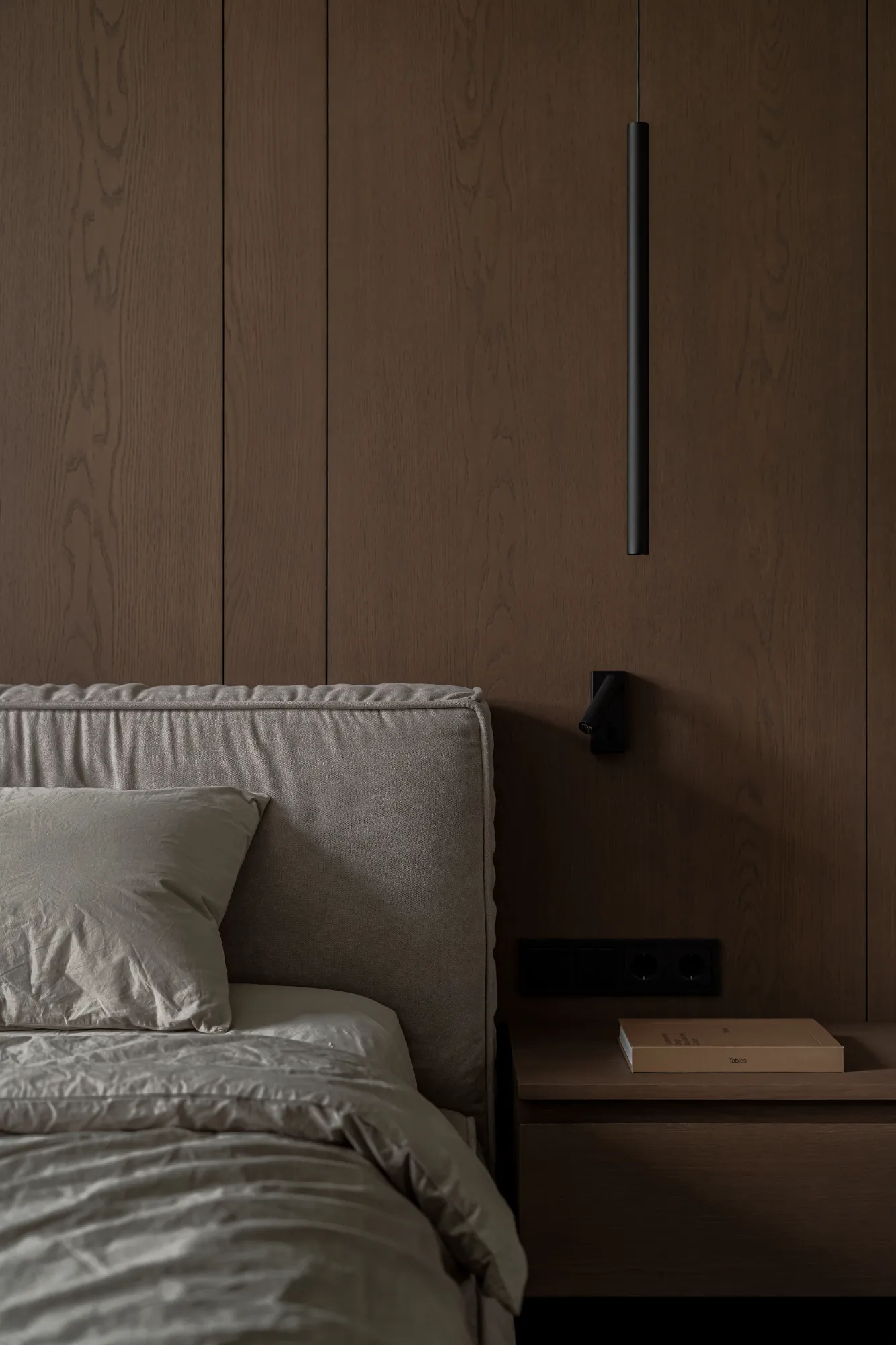 Господарська спальня досить мінімалістична і містить лише найнеобхідніше, а дерев’яні елементи додають ще більшого затишку та тепла.