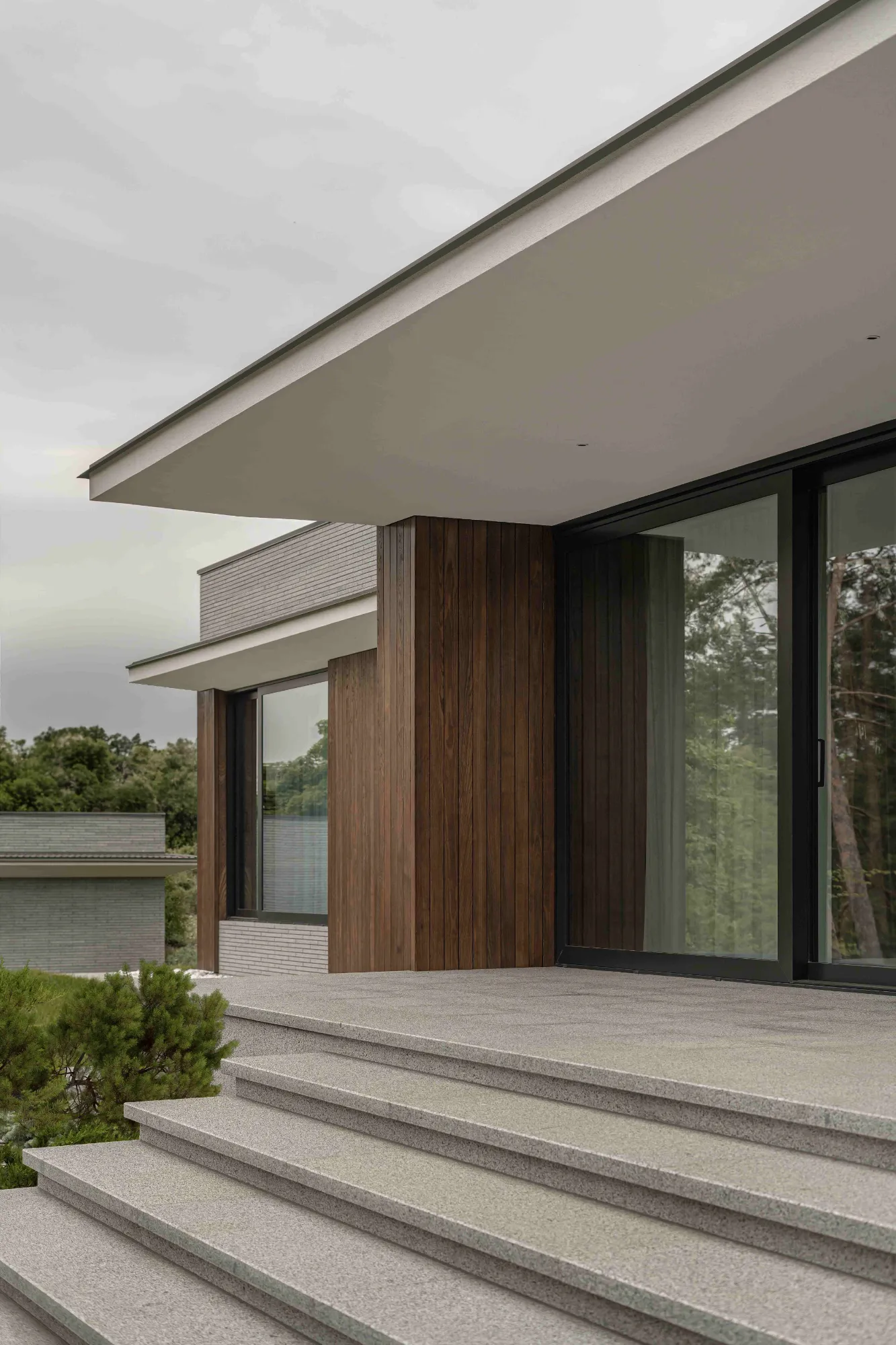 Використання панорамних вікон об’єднує екстер’єр та інтер’єр, відсікаючи бар’єр між зовнішнім та внутрішнім простором, що робить його єдиним цілим. Більшість приміщень зорієнтована на ліс, а велика кількість природнього світла, що заповнює усі приміщення, створює атмосферу тепла та затишку.