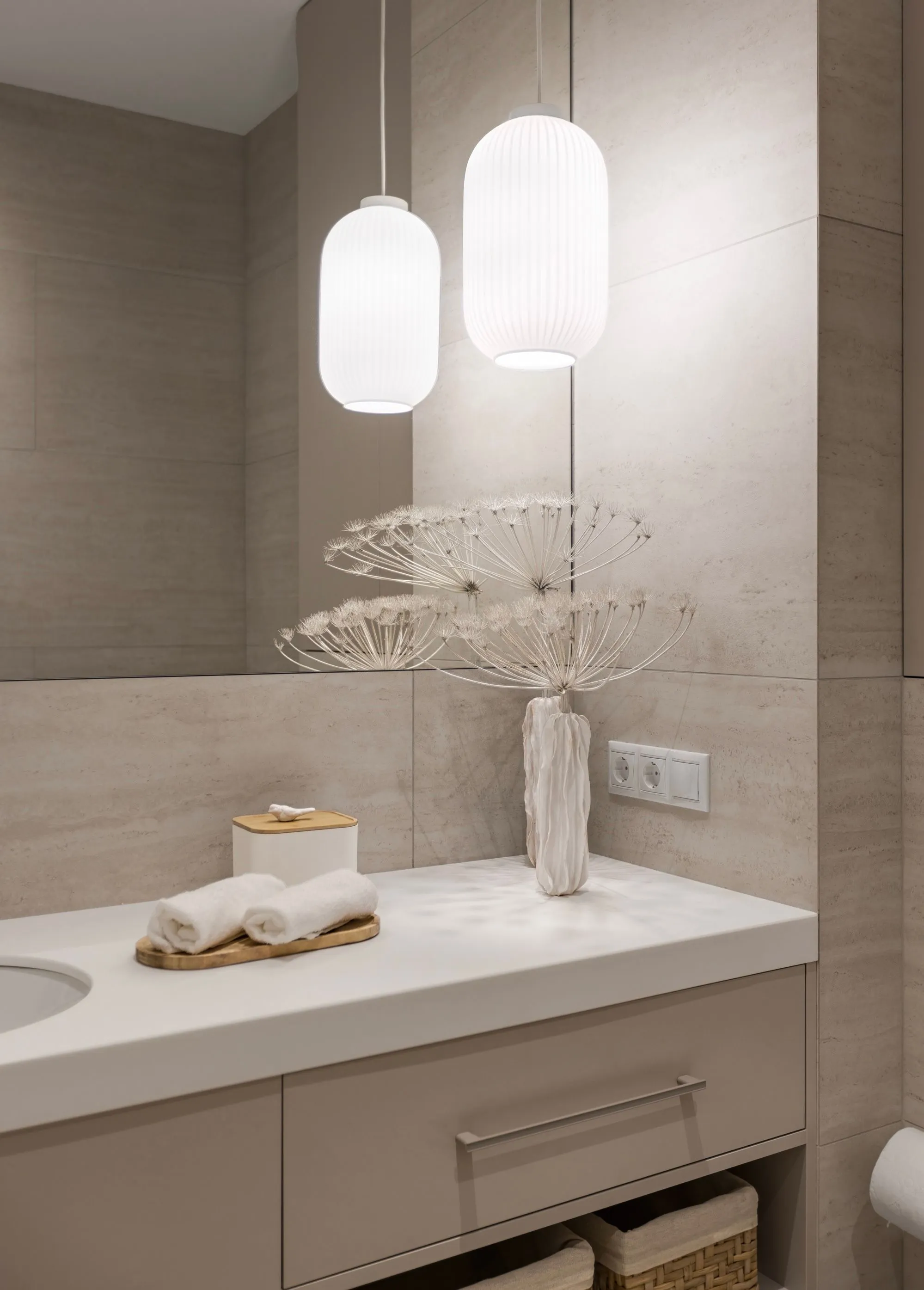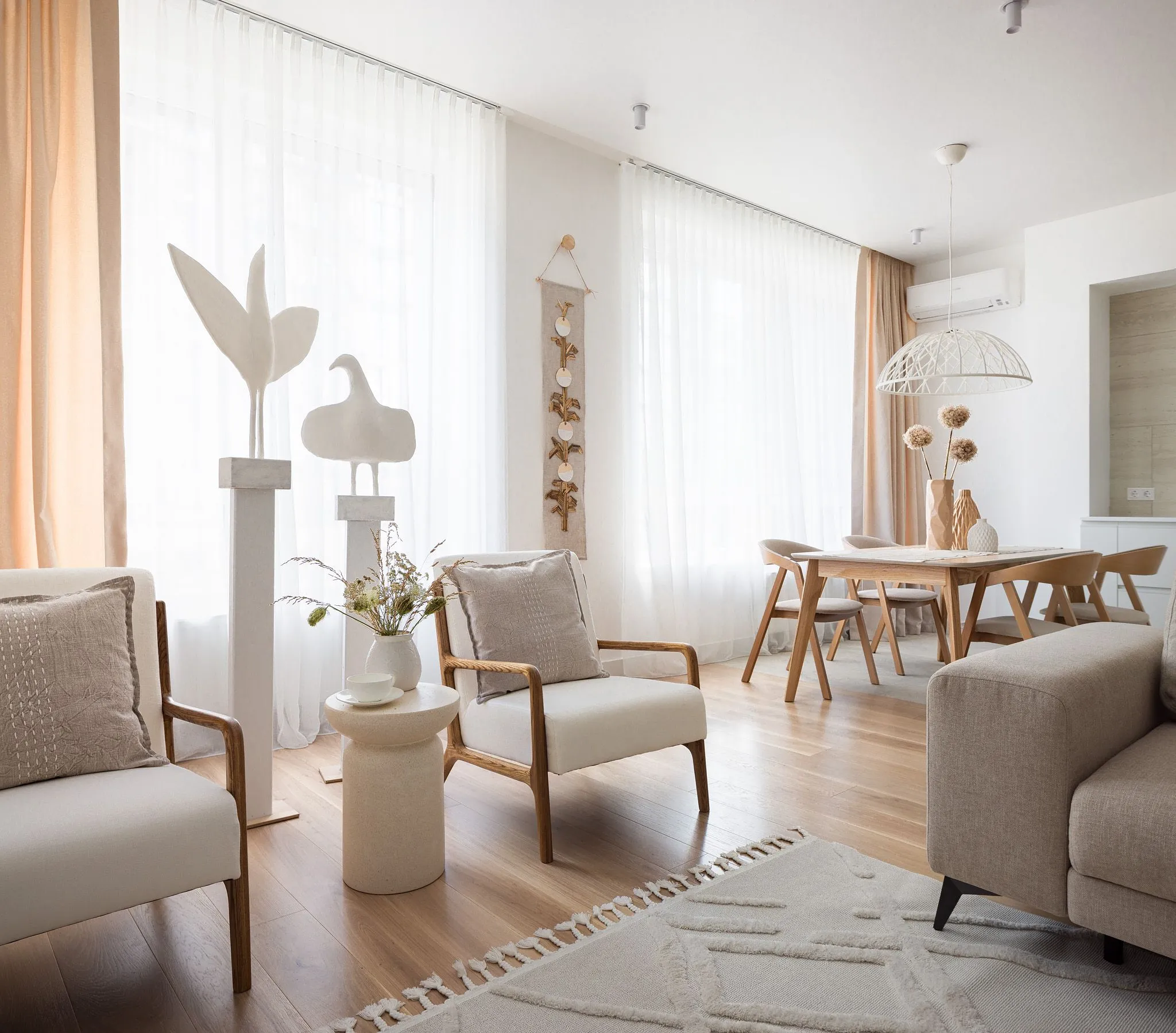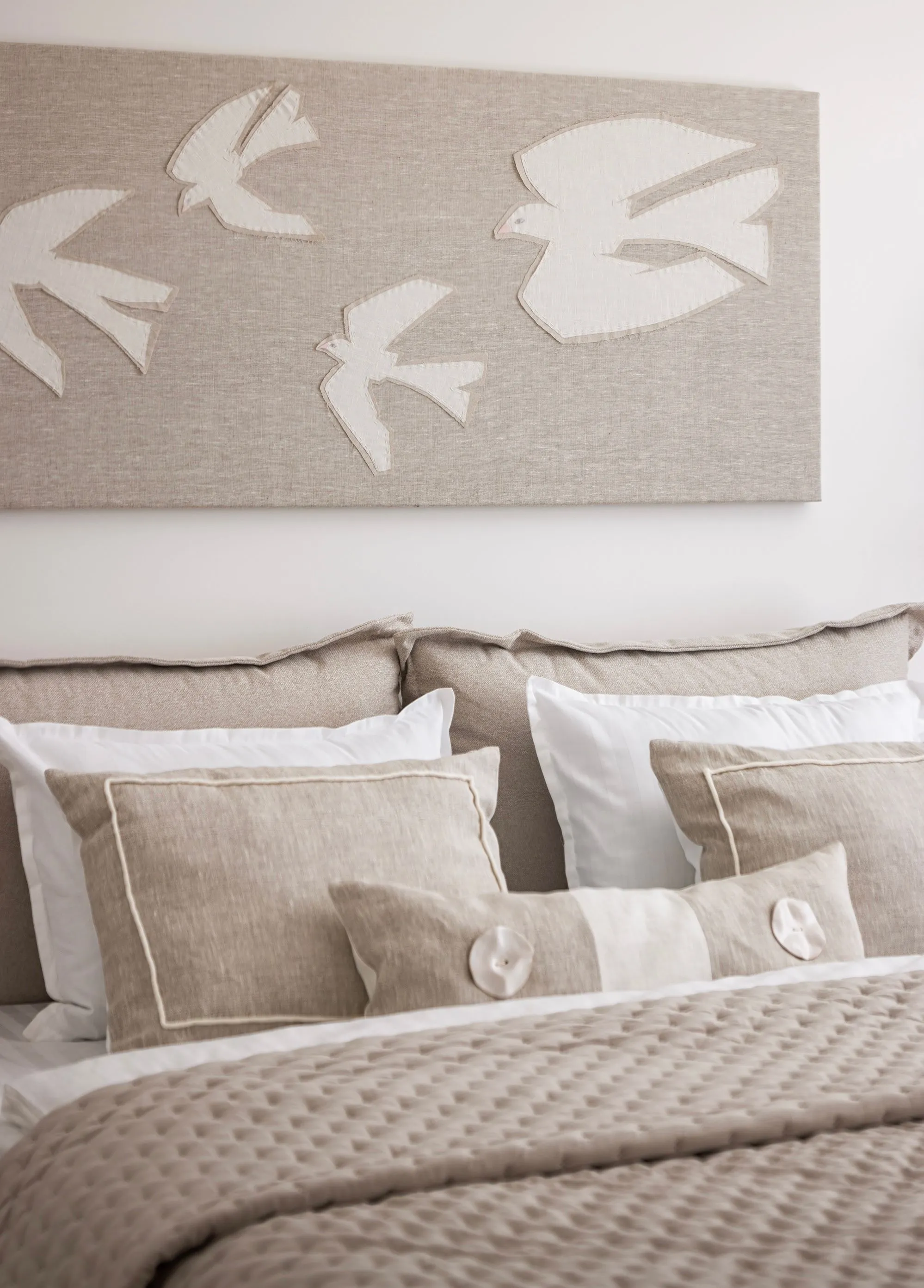 Світла природна палітра, грубі текстури й контрасти матеріалів — прохолода льону й кераміки поруч із теплом дерева, котону — створюють чуттєвий досвід, у якому кожен предмет викликає бажання доторкнутись.