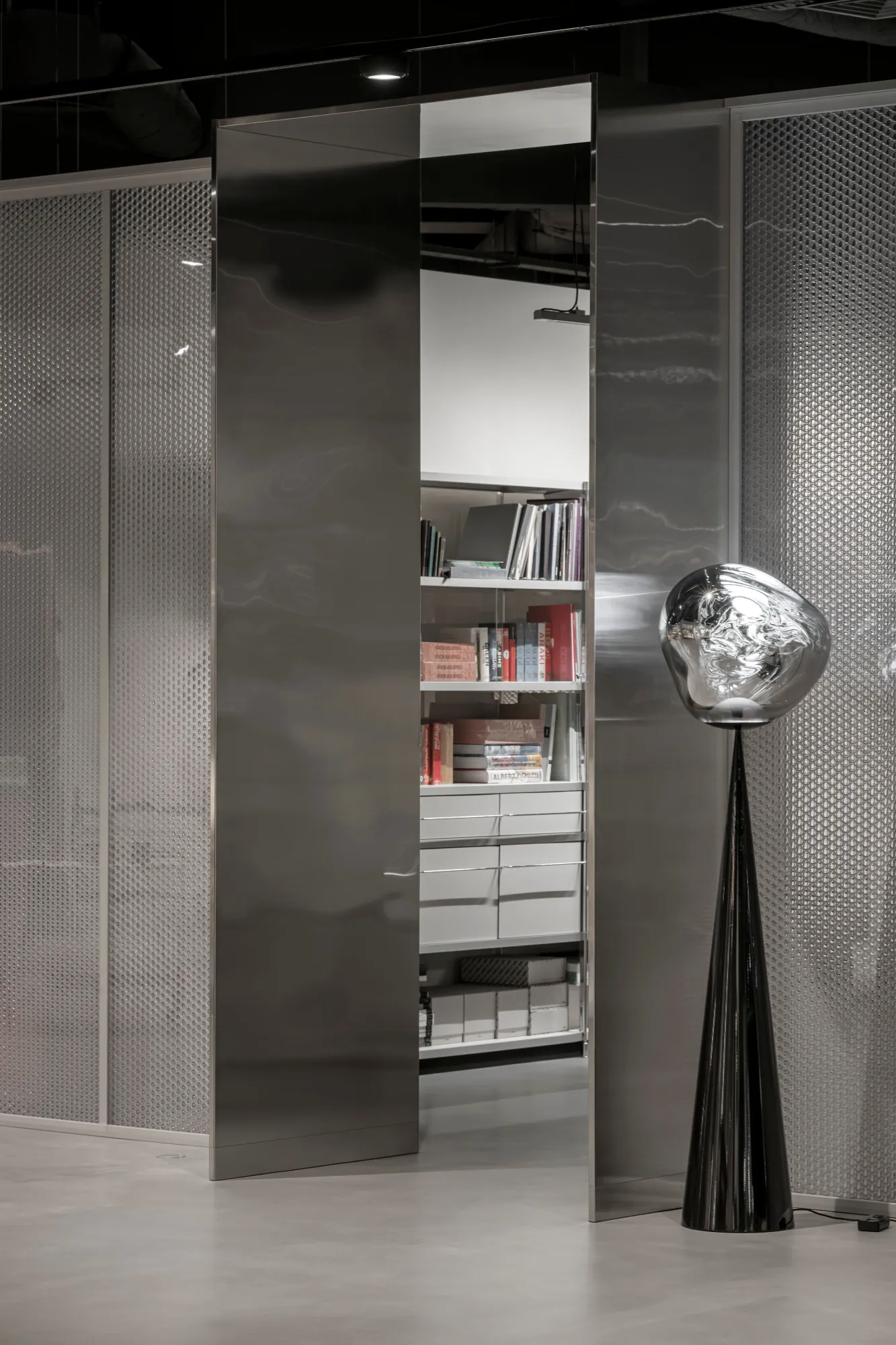 at the Heart of the Showroom. A dedicated hub zone was designed for architects and designers — a comfortable environment for work, client meetings, idea exchange, and moodboard creation. This creative space is equipped with all the necessary materials, catalogs, and samples for shaping future interior solutions. A storage system by Alias serves as a large-scale design library.