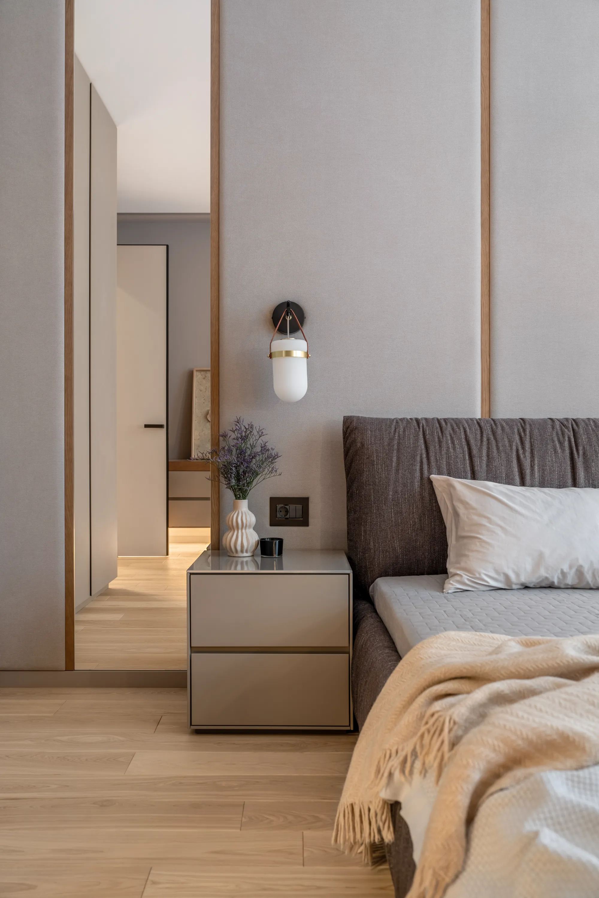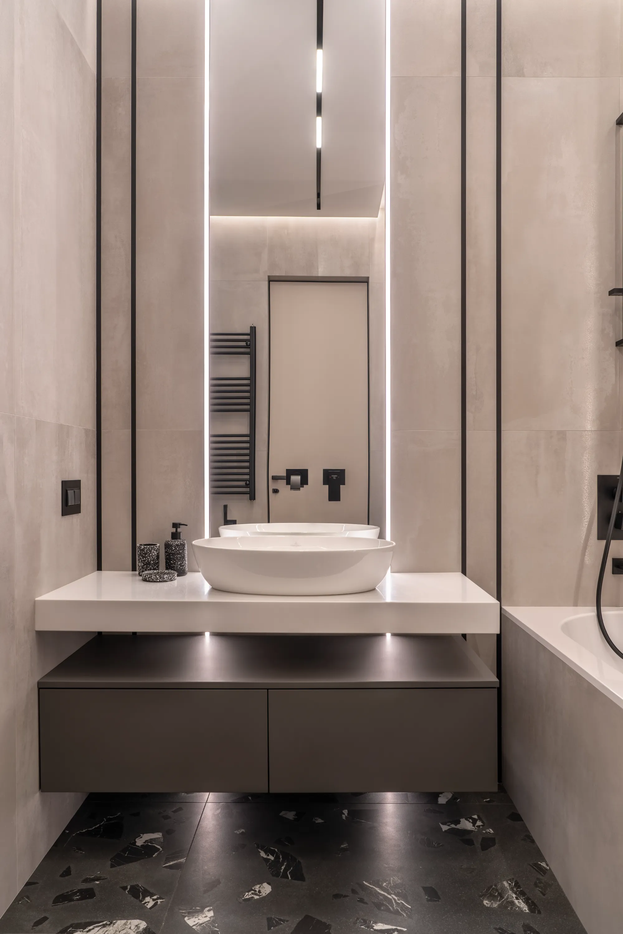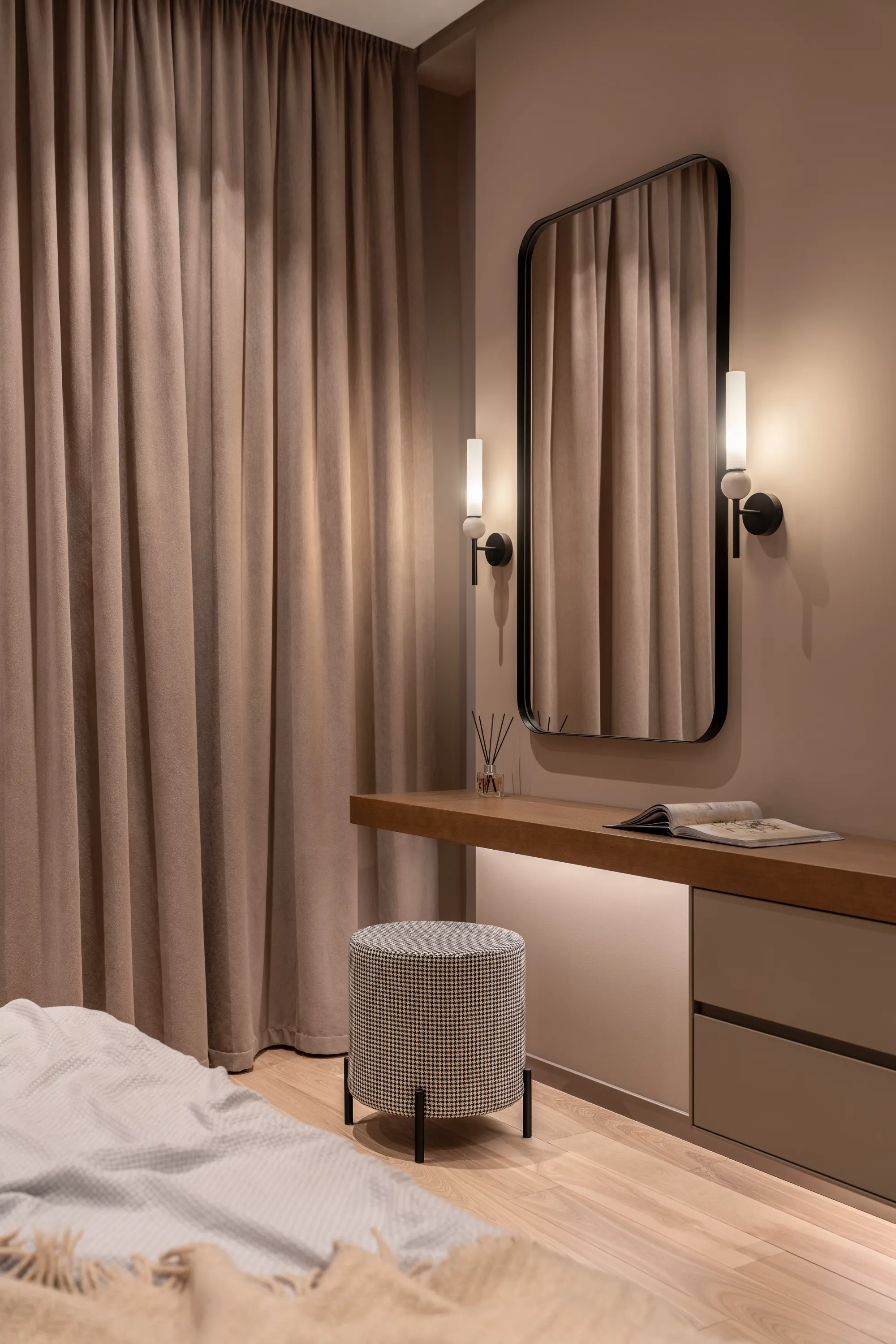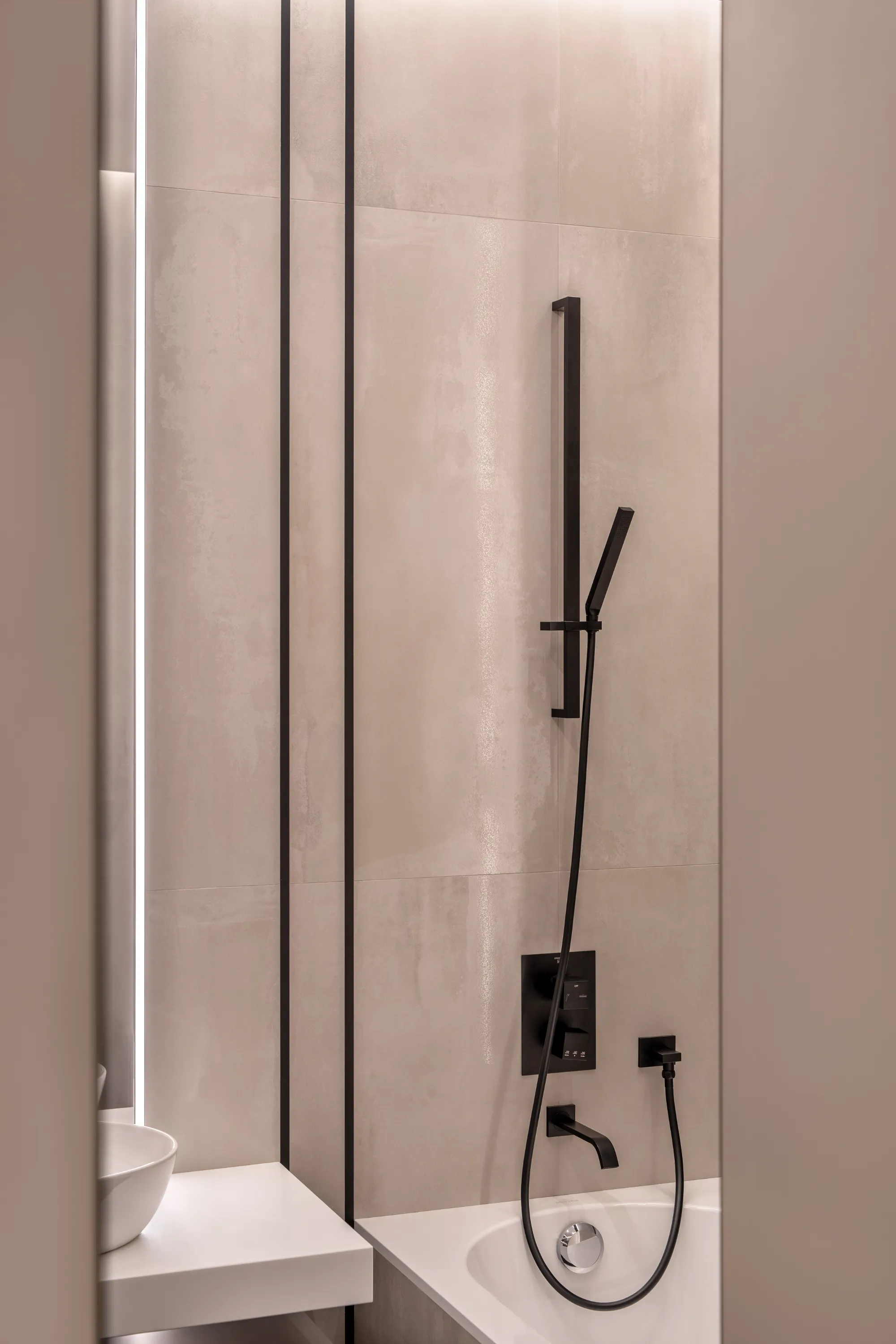 Власники квартири – надзвичайно активні та позитивні люди. Вони енергійні, більшу частину свого часу проводять в мегаполісі на зустрічах з клієнтами, у нескінченних телефонних розмовах та вирішенні тисячі питань. Тому ключовим запитом було створення приватного оазису спокою, в якому вони могли б зануритися в комфорт і гармонію із собою. Єдиною яскравою частиною інтер’єру мала стати ванна кімната чоловіка, оскільки для нього важливо починати день бадьоро, з улюбленою музикою та гарним настроєм.