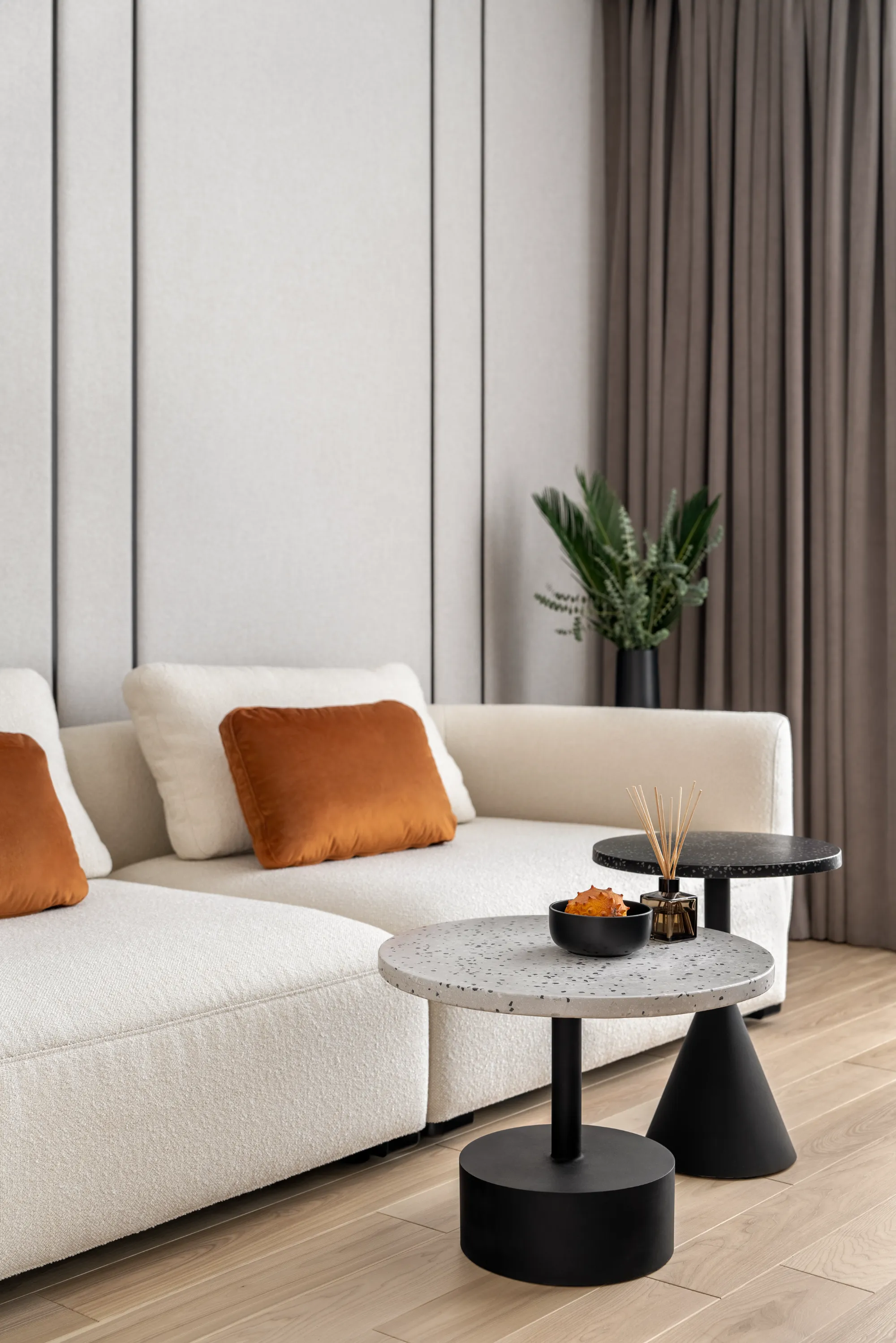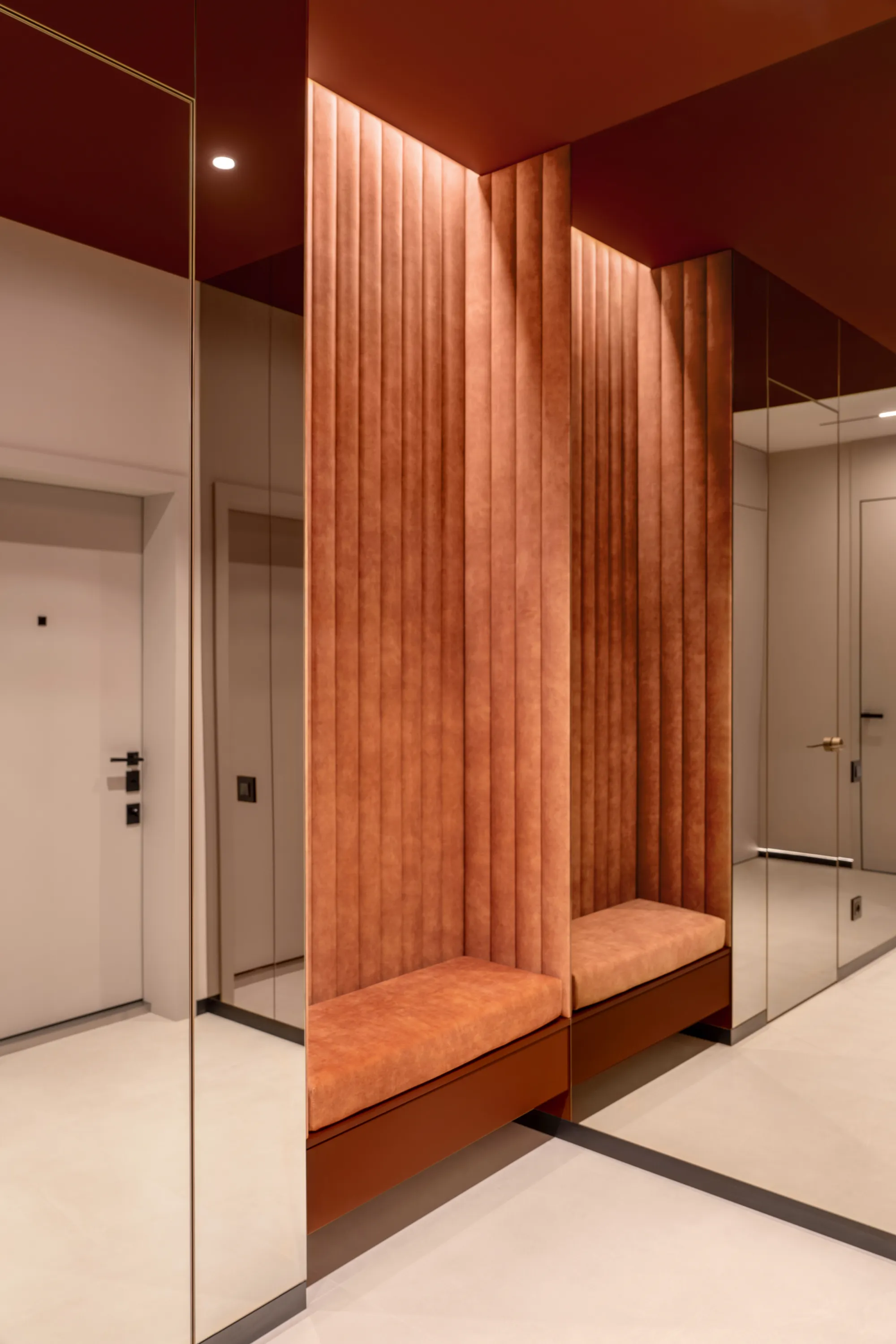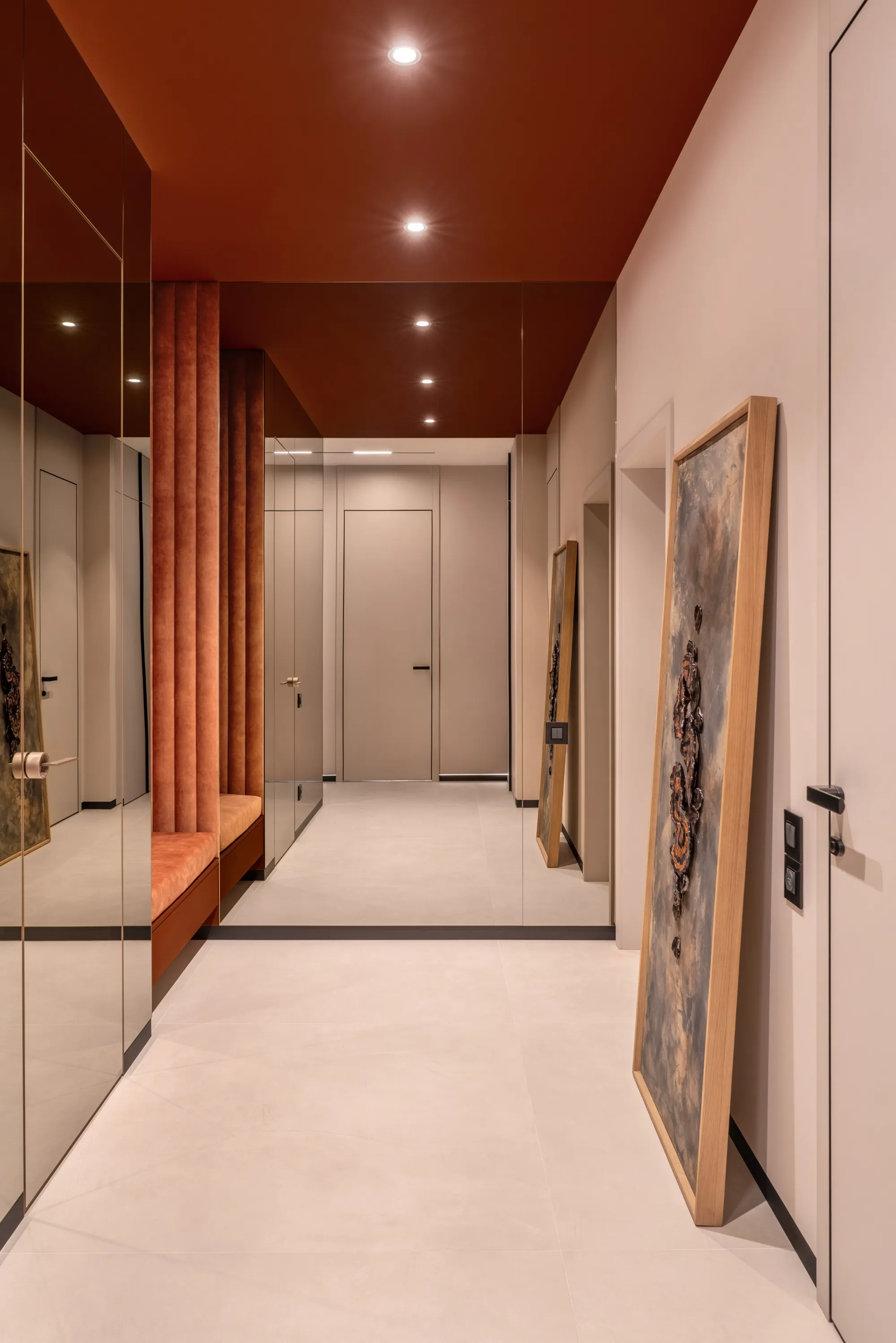 Ми обрали гармонійну природну гаму кольорів, але розбавили її акцентами насиченого теракотового відтінку. М'які текстильні панелі на стінах у вітальні та спальні наповнюють простір приємними тактильними відчуттями. Високі стелі дозволили встановити у вітальні прихований підвісний екран для домашнього кінотеатру, а також додаткові точкові світильники та колонки по всій квартирі.