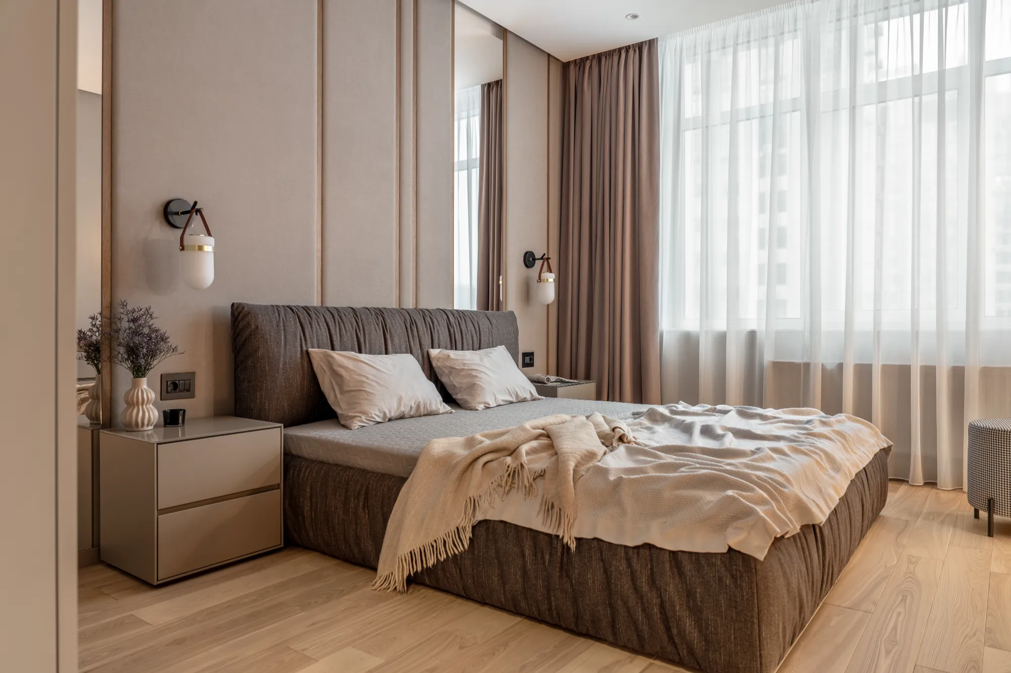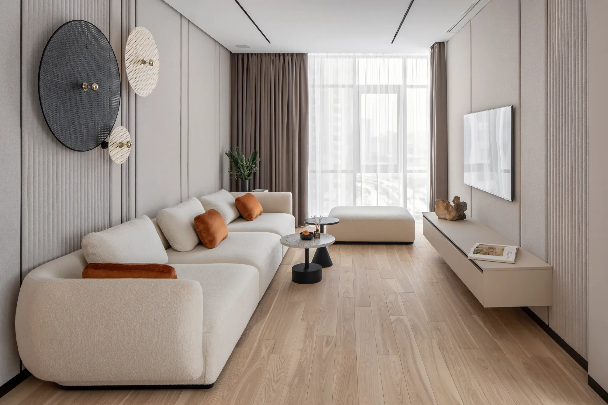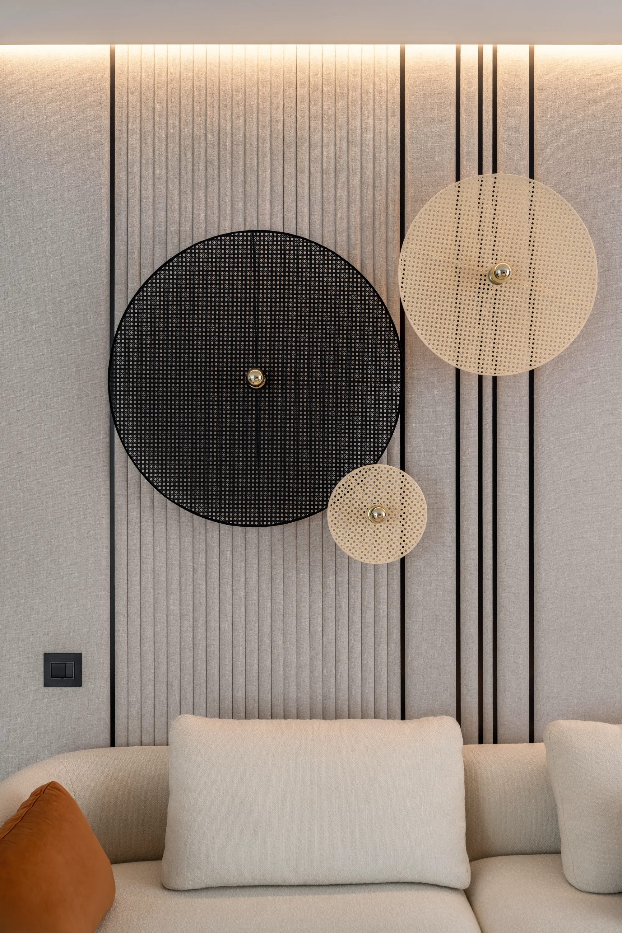 Ми обрали гармонійну природну гаму кольорів, але розбавили її акцентами насиченого теракотового відтінку. М'які текстильні панелі на стінах у вітальні та спальні наповнюють простір приємними тактильними відчуттями. Високі стелі дозволили встановити у вітальні прихований підвісний екран для домашнього кінотеатру, а також додаткові точкові світильники та колонки по всій квартирі.