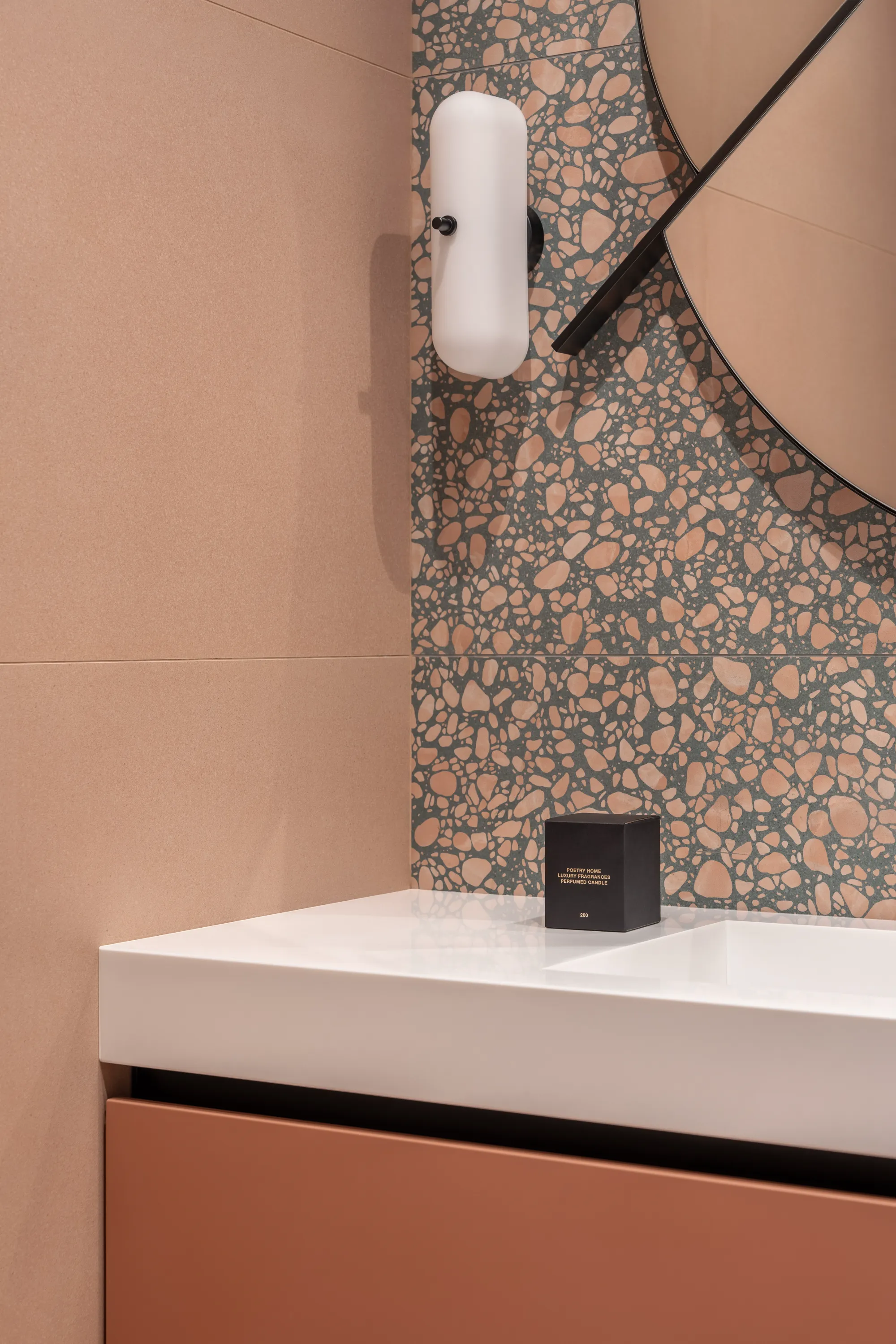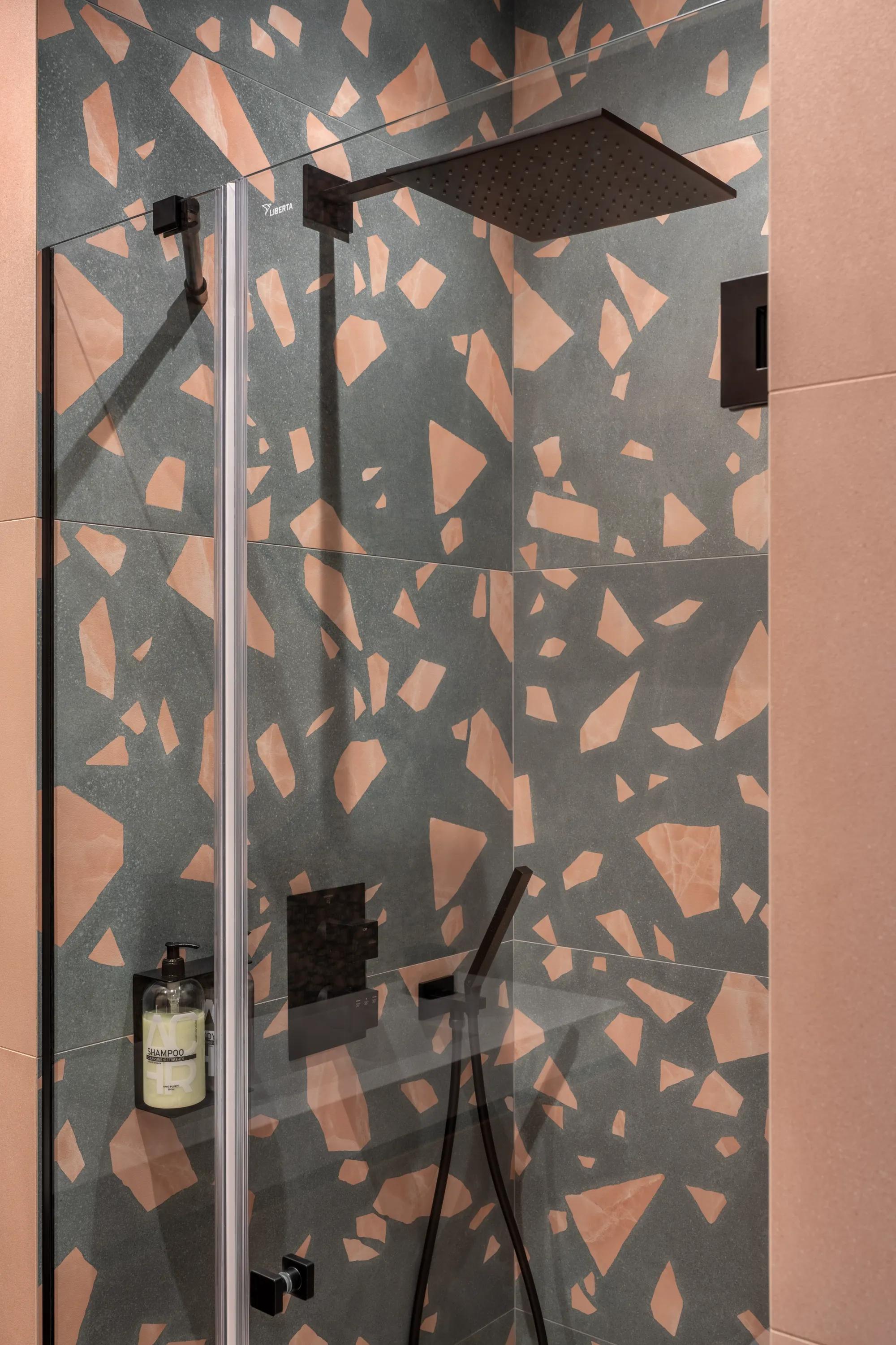 Душова кімната та передпокій створюють яскравий контраст у цьому інтер’єрі. Життєрадісні теракотові відтінки додають легкого настрою та позитиву. На противагу їм ванна кімната доволі стримана й аскетична, вона заспокоює та огортає ментальною тишею. Однак, у цих двох різних ванних кімнат є спільна риса: плитка з кам’яною крихтою.