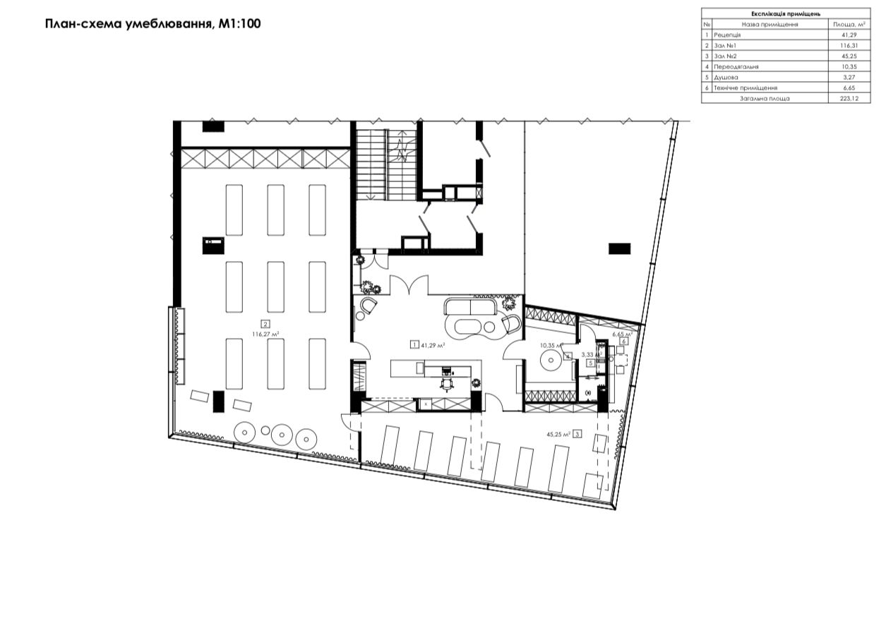 Підлога виконана з якісного вінілового покриття, що додаєпрактичності та довговічності зоні очікування. Стіни прикрашені панелями зДСП під дерево дуб, що додає тепла та натуральності інтер'єру. Длязручності клієнтів передбачені мінімалістичні меблі, а на поличкахрозташована продукція.У залі для заняття використана паркетна підлога, яка забезпечує комфорт підчас тренувань. Колони в інтер'єрі оздоблені декоративною плиткою ручноїроботи, яка додає унікальний акцент. Велика кількість дзеркал на стінахстворює ідеальні умови для оглядовості, дозволяючи клієнтам стежити заправильною технікою виконання вправ. Також в залі передбачені шафиприміщення для зберігання інвентарю, які органічно вписані в загальнийпростір.