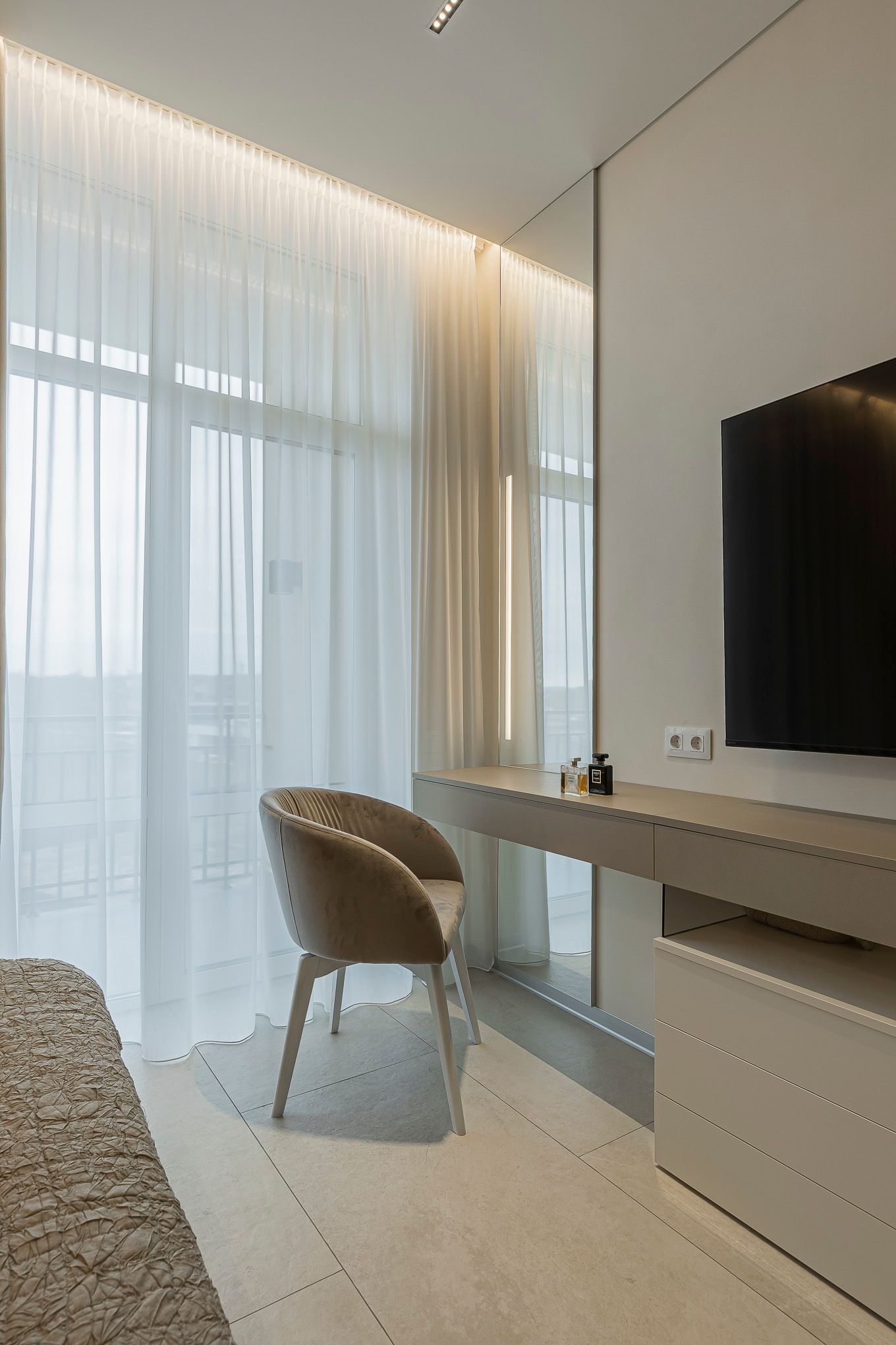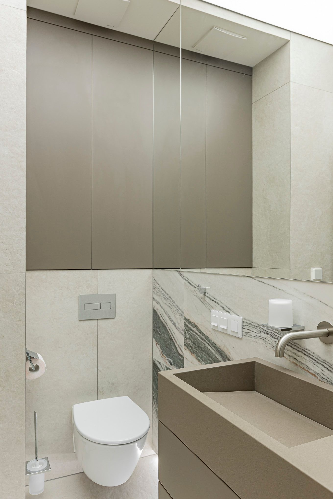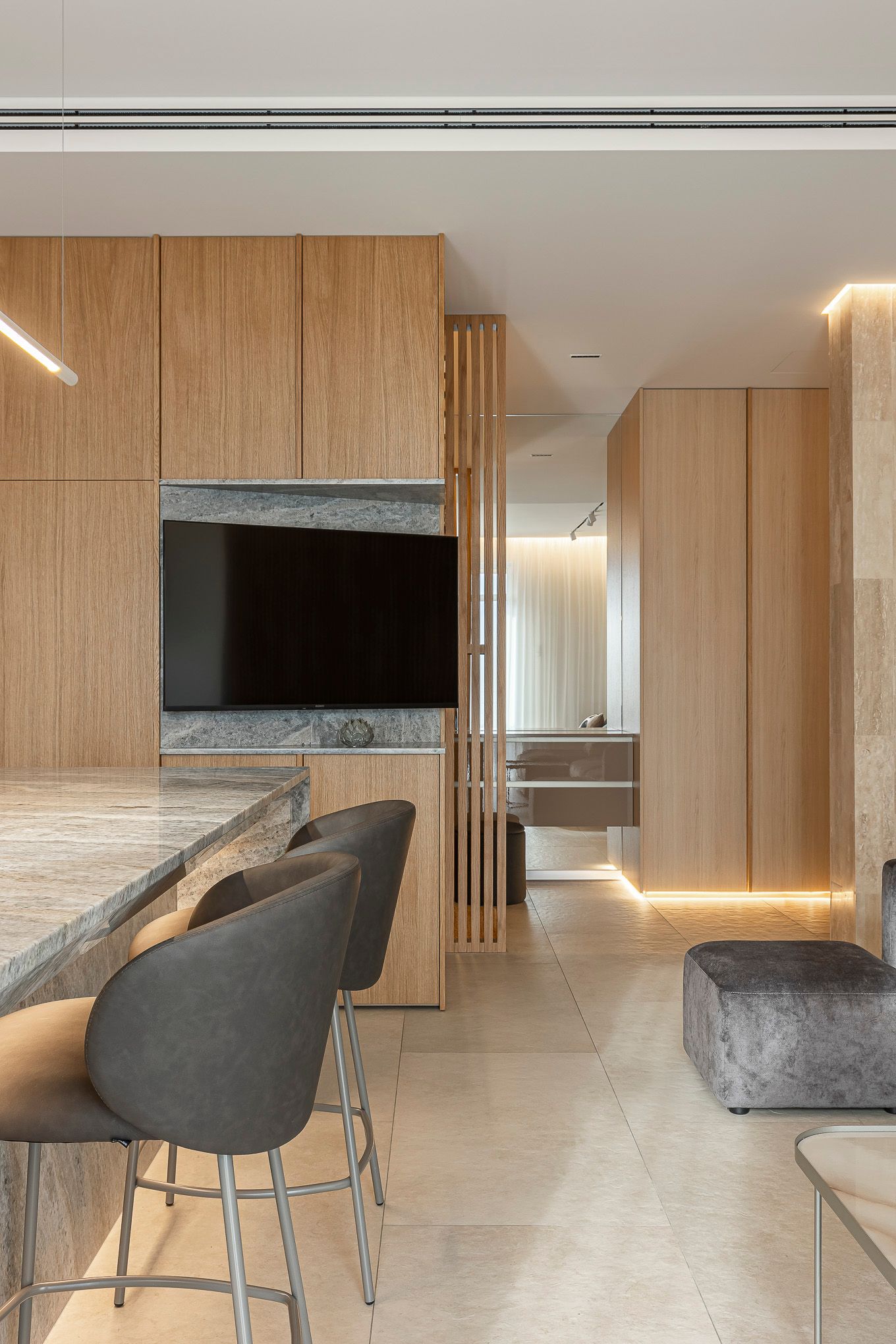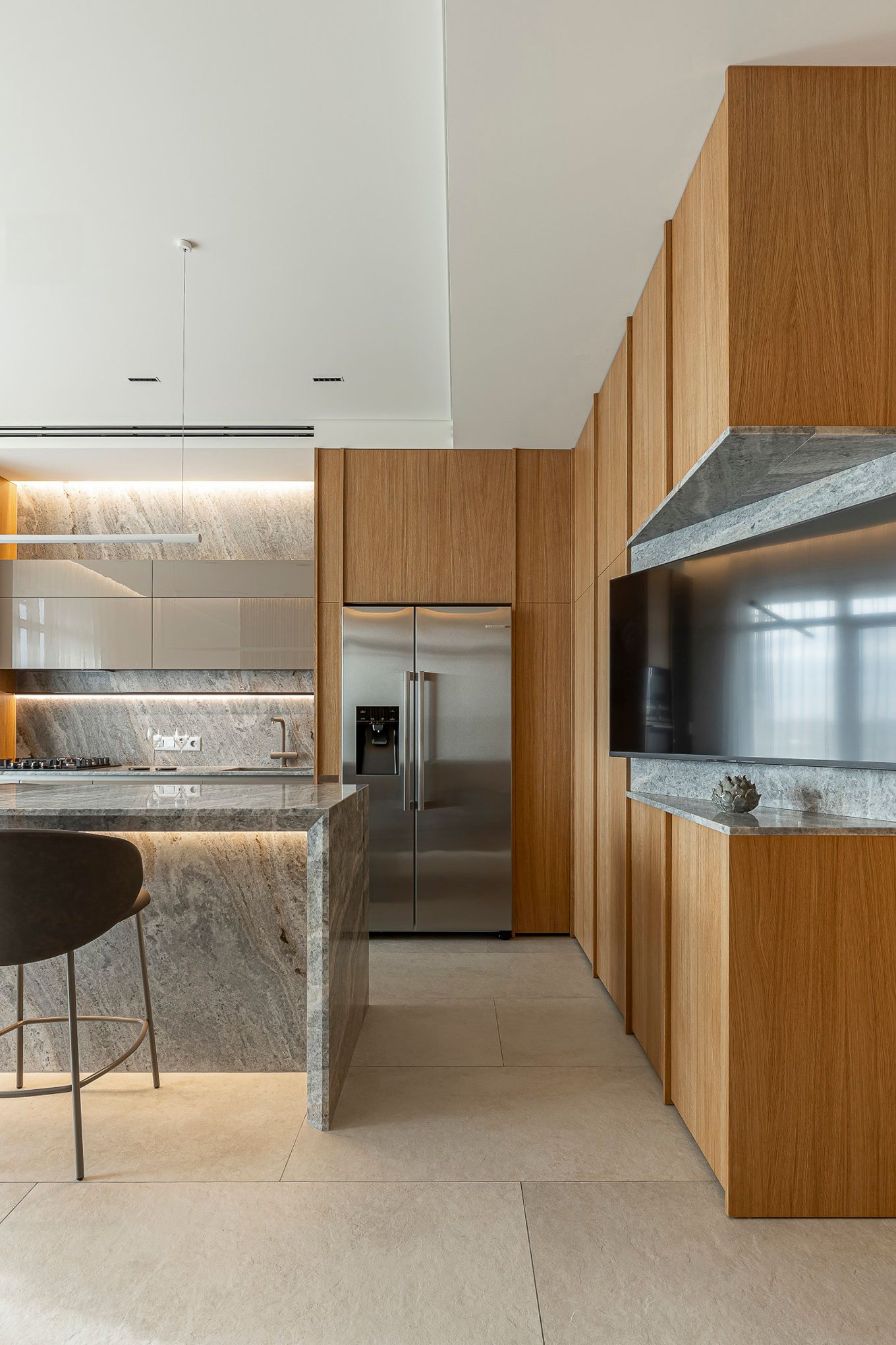 Квартира в заміському будинку для родини де цінують затишок та комфорт. В інтер’єрі використано багато дерева, а також натуральний камінь. Сіро-зелені природні кольори, дзеркала кольору бронзи та сатиновий метал додають акценти у композицію простору.