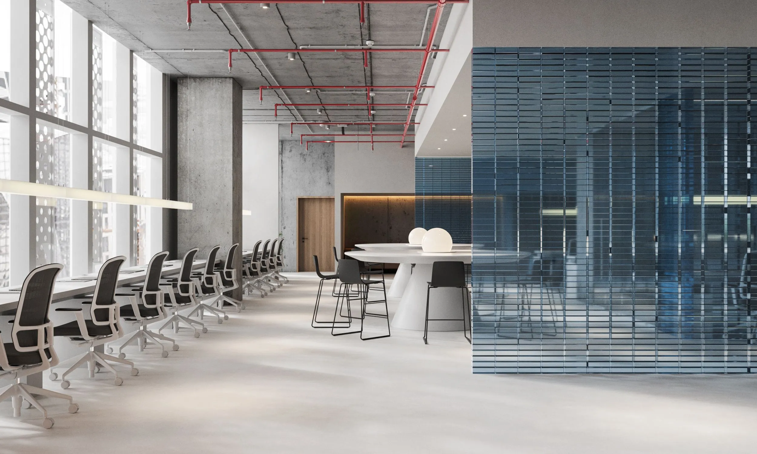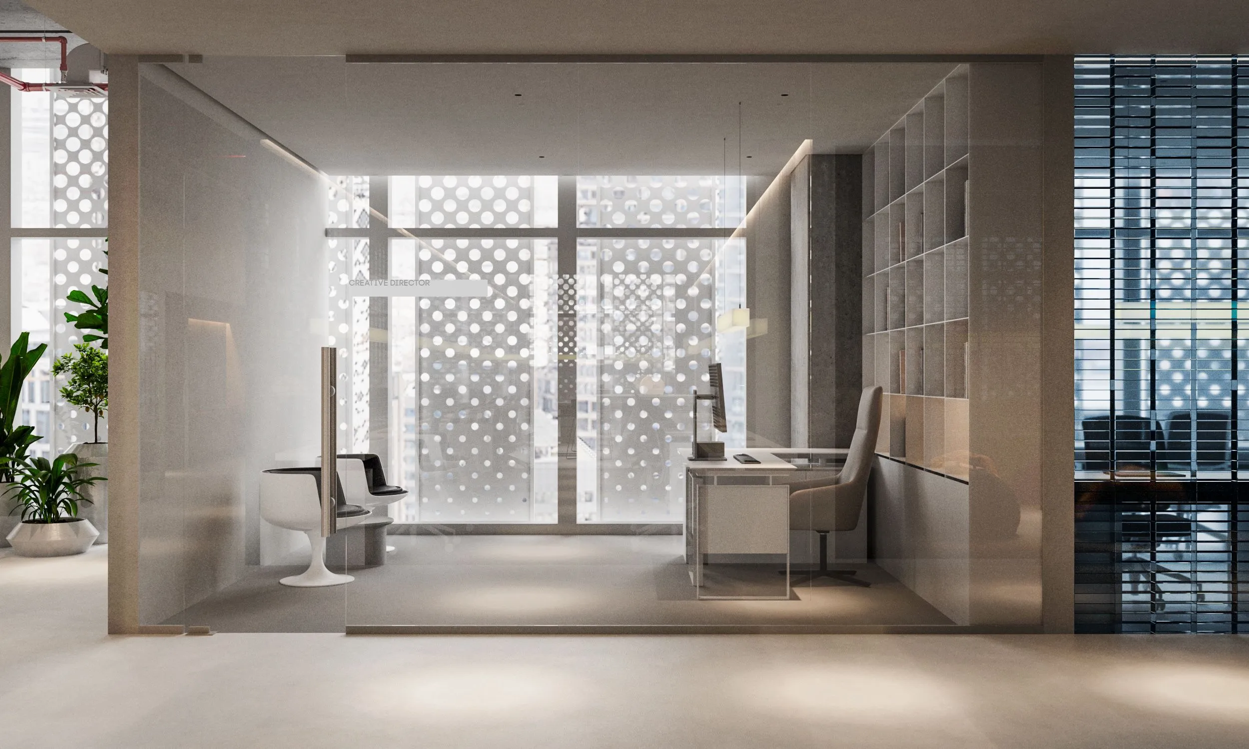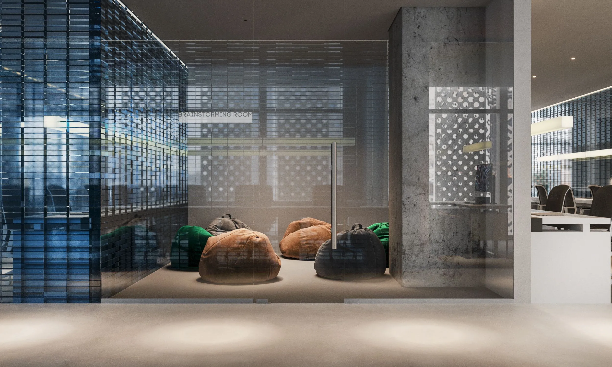 В основі проєкту лежить продумана стратегія зонування. Прозорі скляні перегородки з унікальною текстурованою обробкою м’яко поділяють простір, формуючи делікатні межі без втрати світла чи візуальної цілісності. Такий підхід створює атмосферу співпраці, водночас забезпечуючи умови для зосередженої роботи.