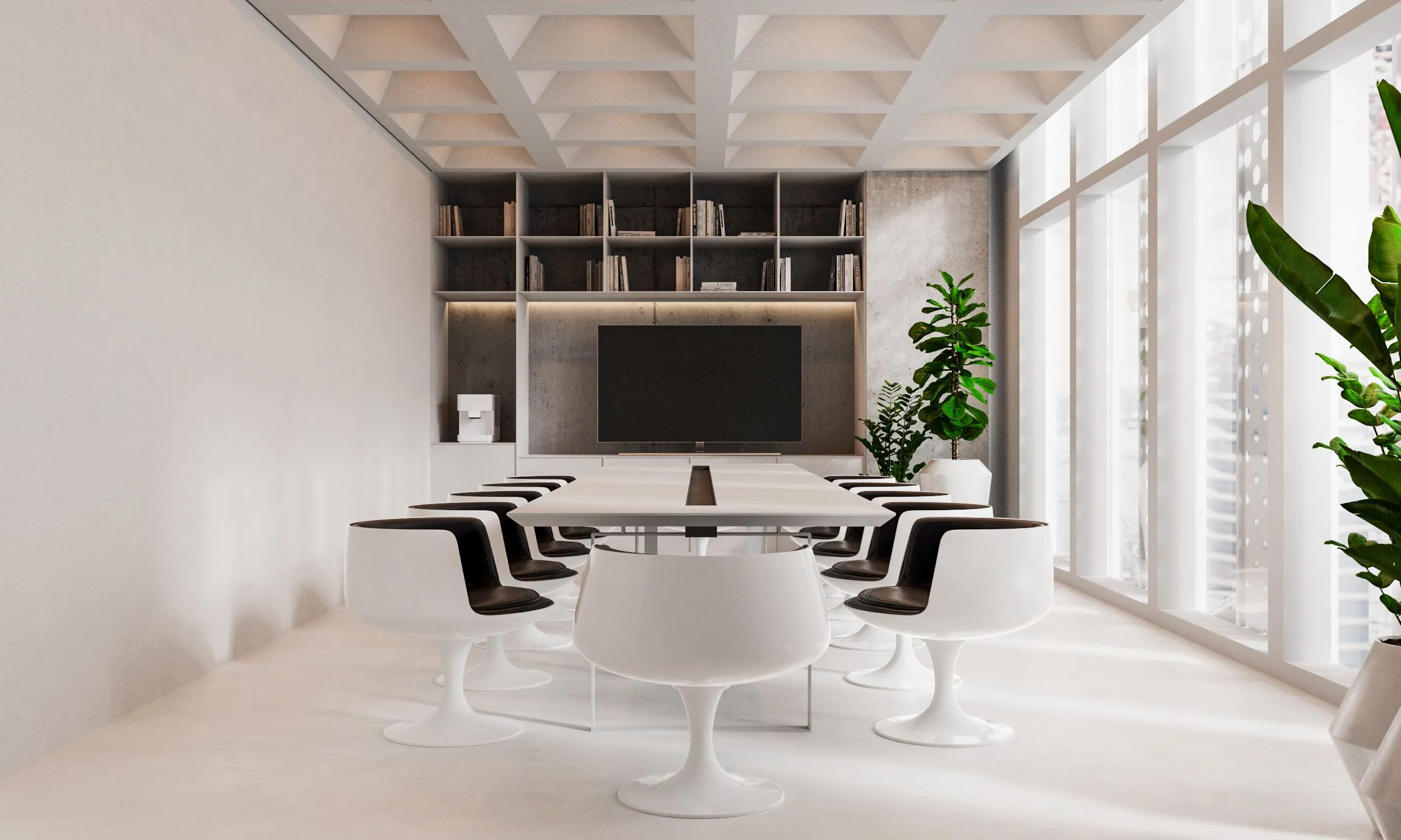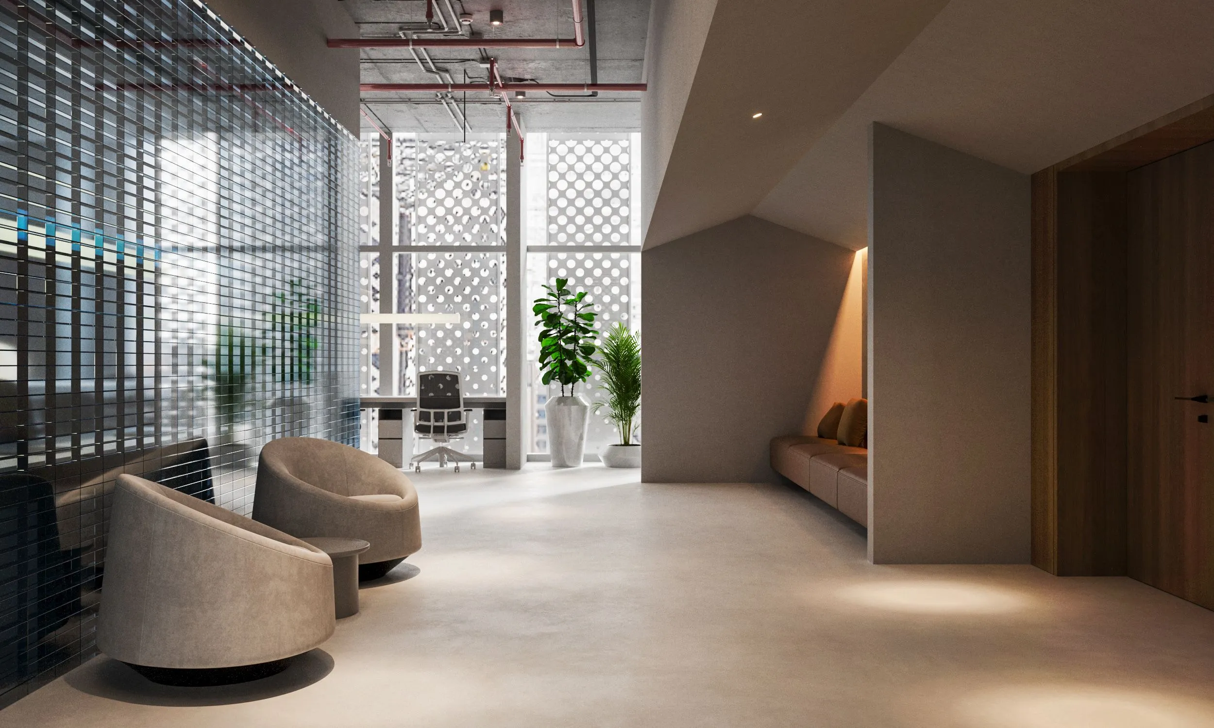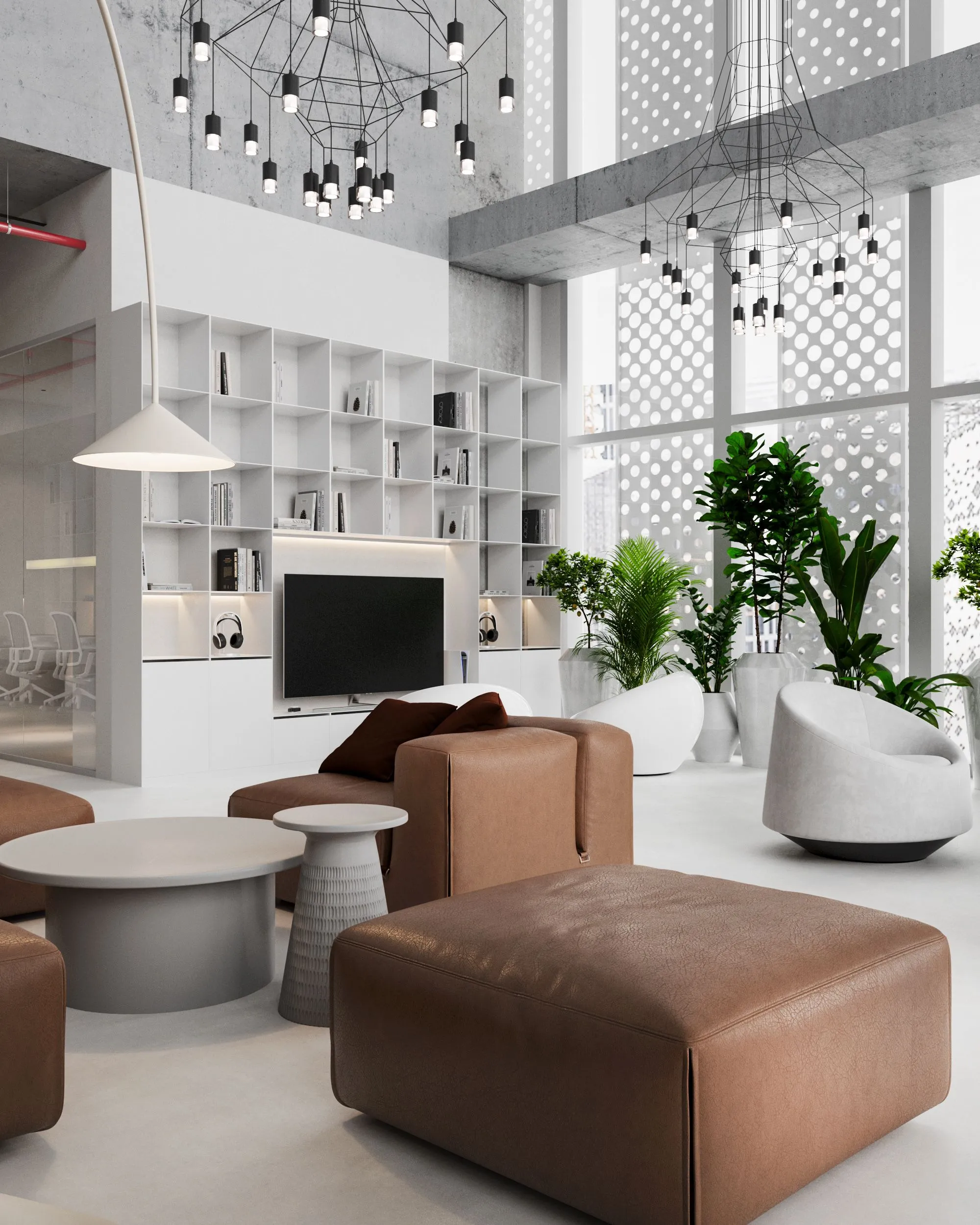 Важливу роль у композиції інтер’єру відіграє зелень. Рослини вводять біофільний елемент, що наповнює простір теплом і відчуттям гармонії. У поєднанні з нейтральною палітрою кольорів вони створюють ритм і додають офісу затишку, перетворюючи його не лише на місце роботи, а й на простір балансу, добробуту та натхнення.