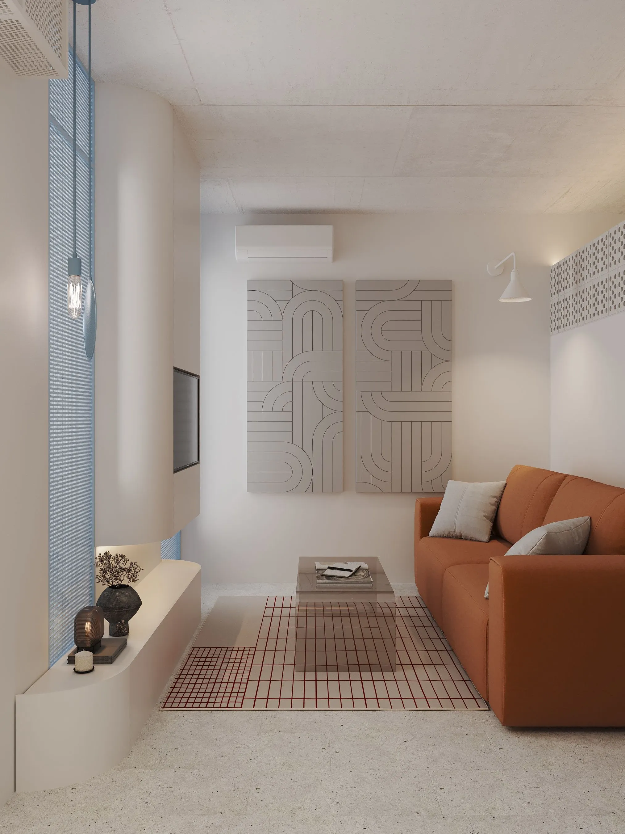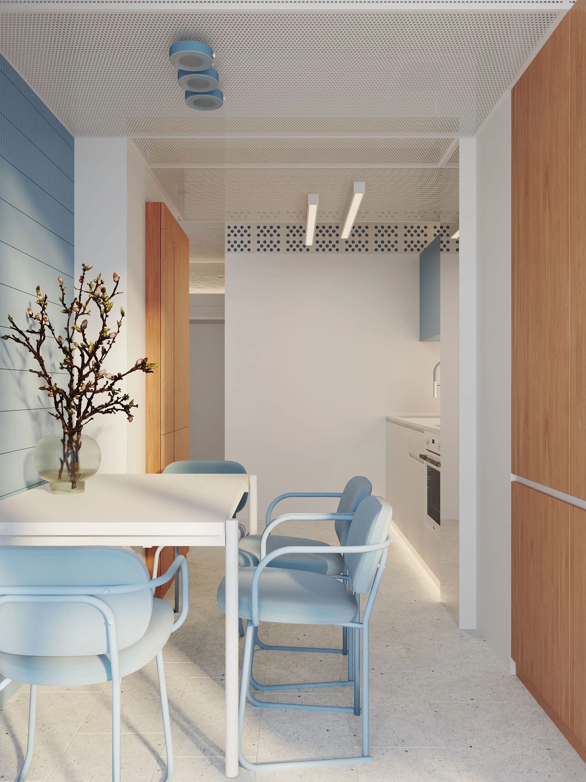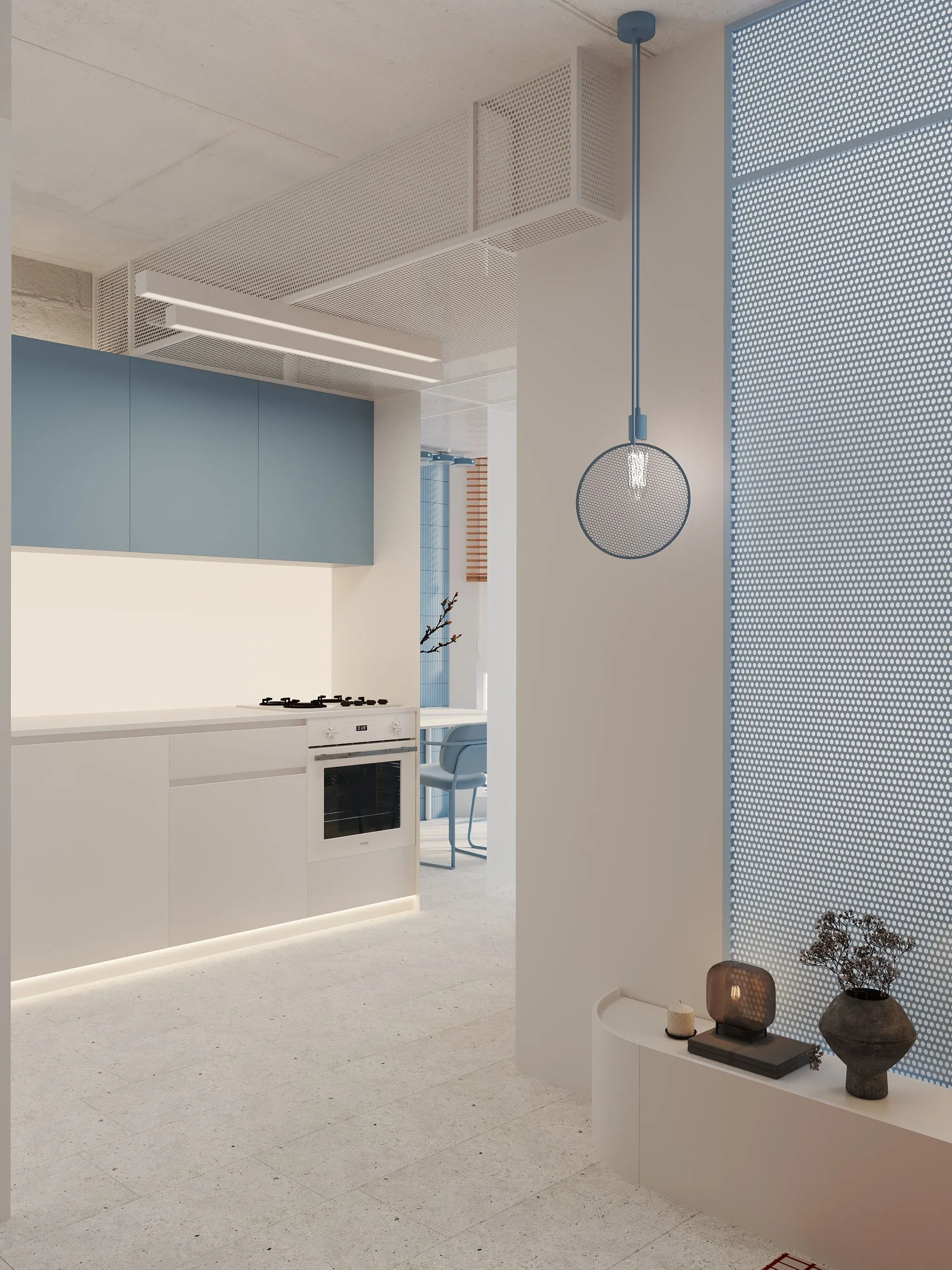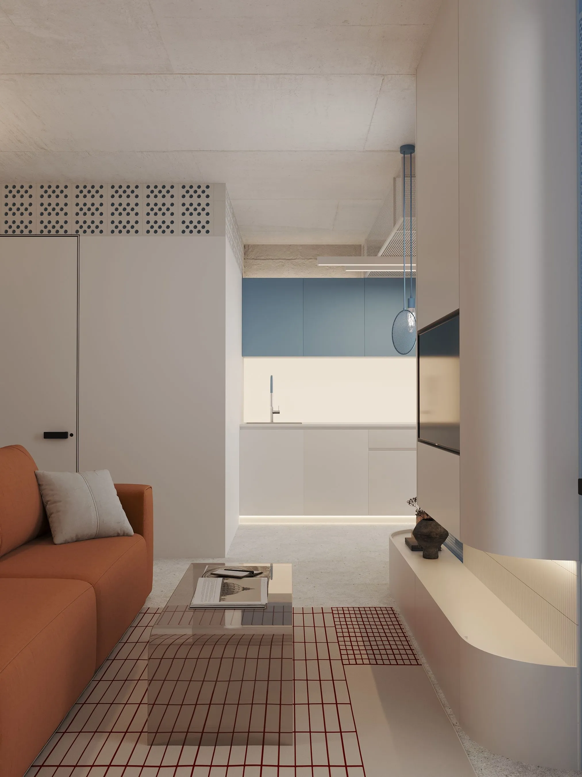Ключові елементи інтер’єру: • Кухня-їдальня: блакитні шафи без ручок створюють чисту геометрію. Сітчаста стеля, приховані світильники та дерев’яні панелі задають ритм і структуру. • Вітальня: компактна зона з яскравим акцентом — помаранчевим диваном, який виступає як емоційний центр простору. Перфорація на стінах та меблях повторює мотив сітки, об’єднуючи різні зони. • Спальня: затишна, мінімалістична, з м’яким текстилем і абстрактною графікою. Блакитні трубчасті світильники-підвісні консолі — нестандартне рішення, що поєднує форму і функцію. • Санвузол: контраст фактур — глянцевої плитки, перфорованих елементів і гладких поверхонь — створює візуальну глибину. Блакитний колір і тут виконує роль “свіжого повітря”, підсилюючи чистоту простору. • Робоча зона: невелике, але продумане робоче місце з видом на вікно та з фокусом на спокійну, нейтральну атмосферу.