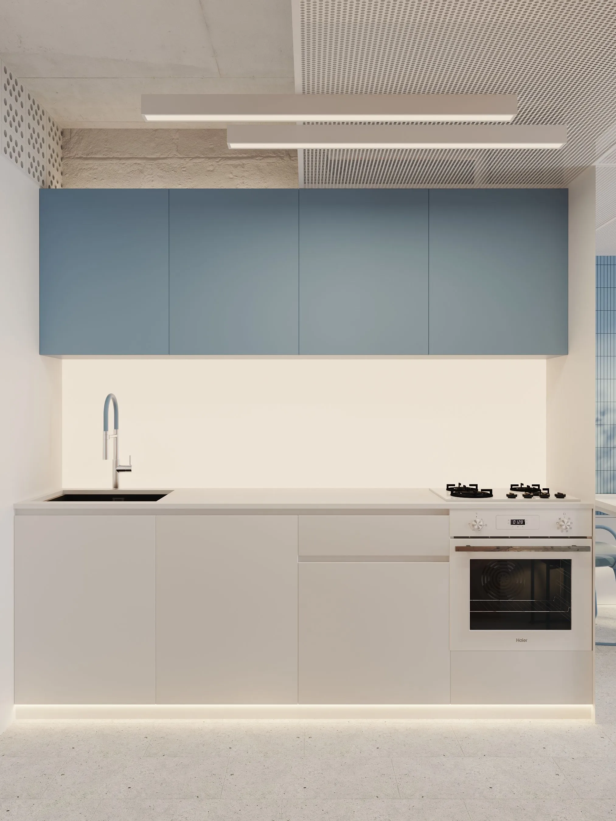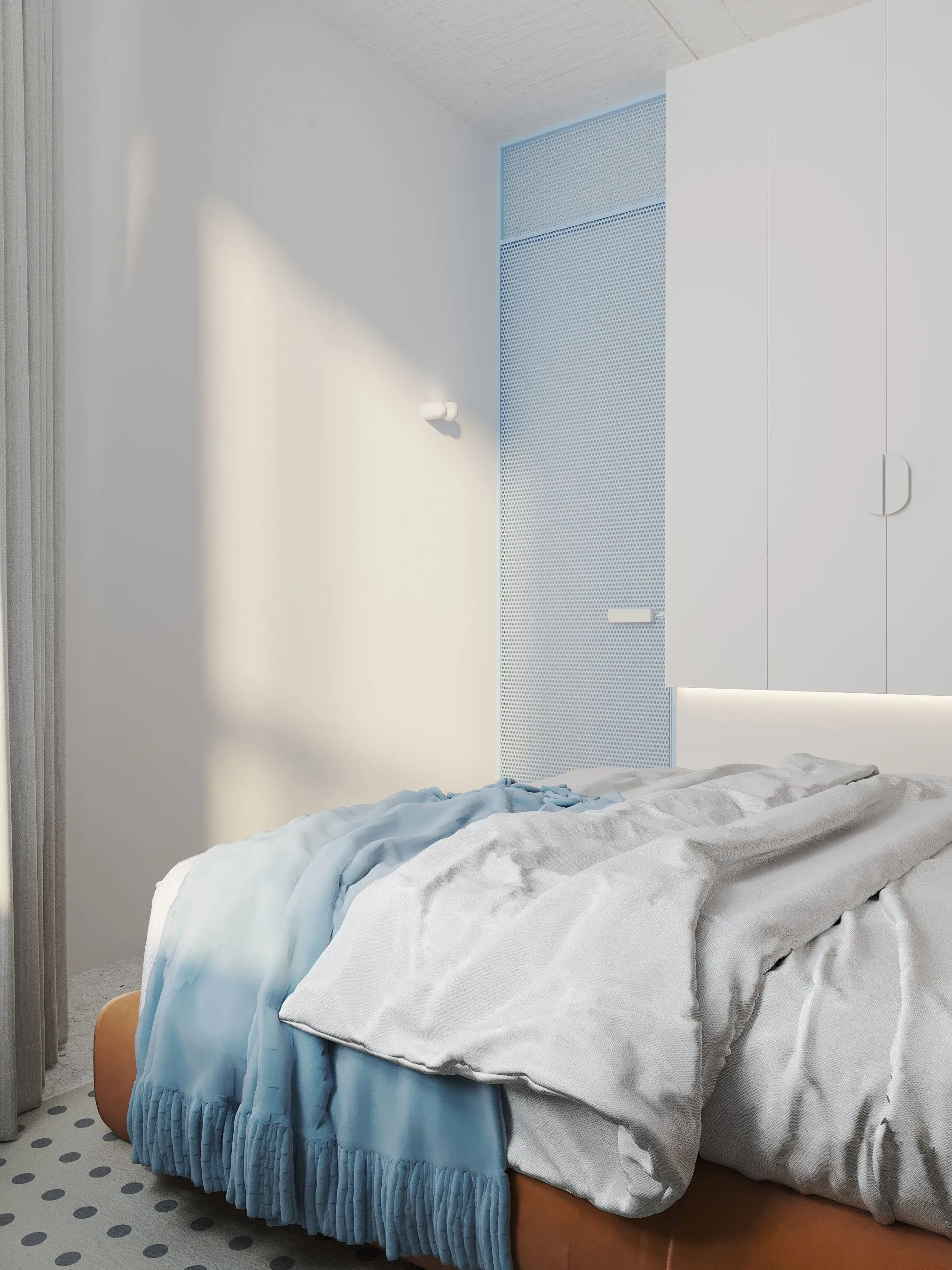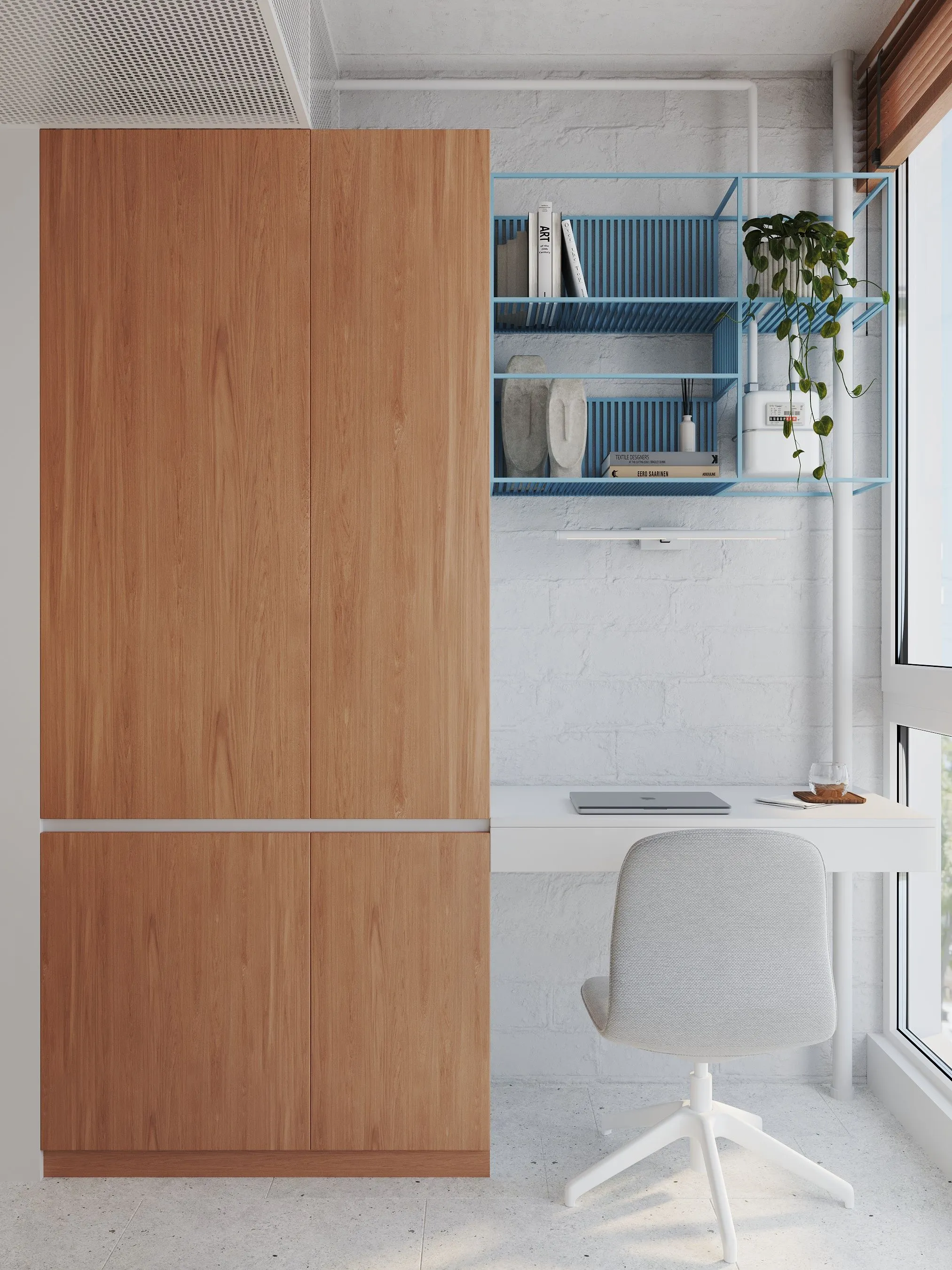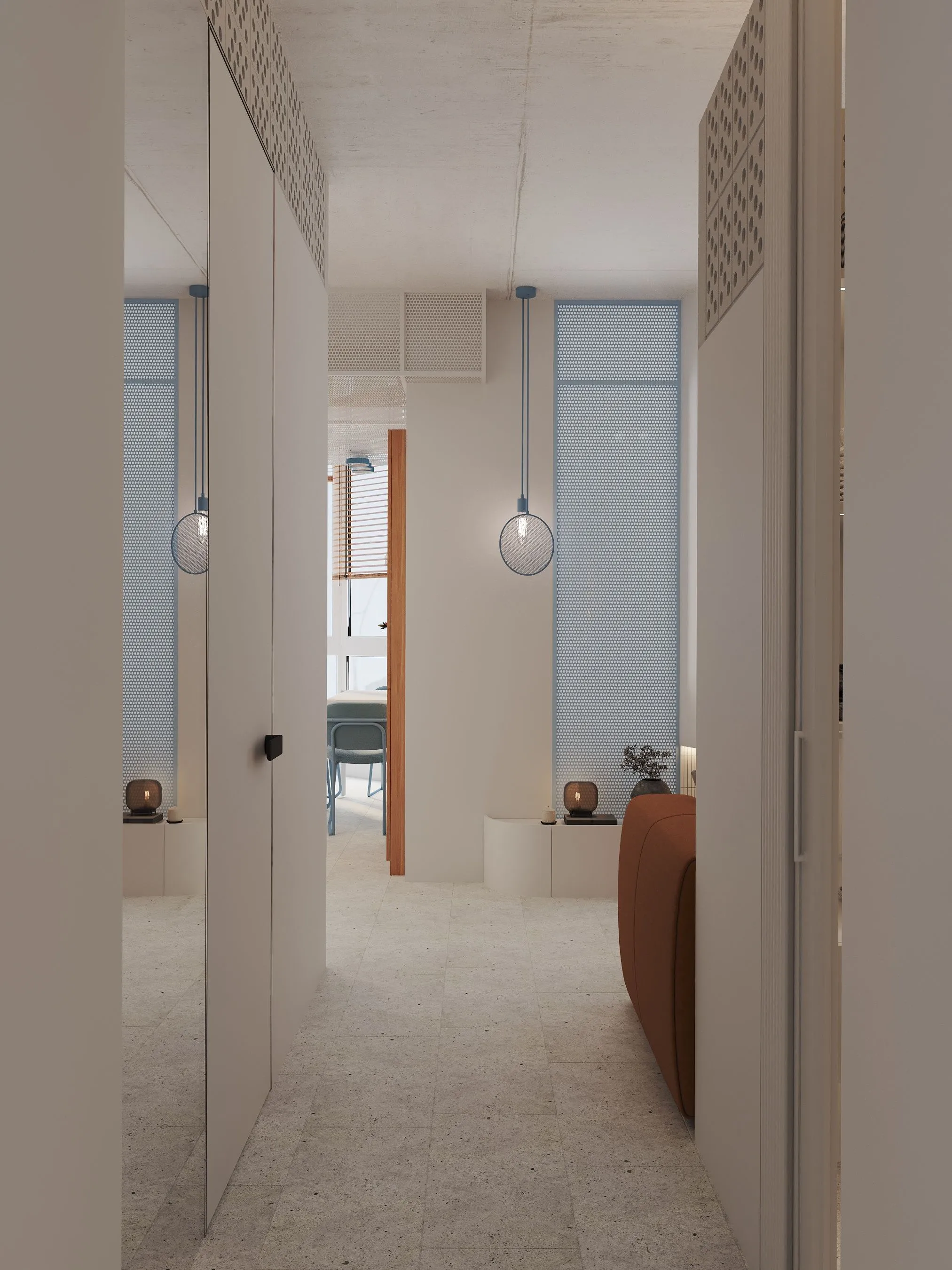 Ключові елементи інтер’єру: • Кухня-їдальня: блакитні шафи без ручок створюють чисту геометрію. Сітчаста стеля, приховані світильники та дерев’яні панелі задають ритм і структуру. • Вітальня: компактна зона з яскравим акцентом — помаранчевим диваном, який виступає як емоційний центр простору. Перфорація на стінах та меблях повторює мотив сітки, об’єднуючи різні зони. • Спальня: затишна, мінімалістична, з м’яким текстилем і абстрактною графікою. Блакитні трубчасті світильники-підвісні консолі — нестандартне рішення, що поєднує форму і функцію. • Санвузол: контраст фактур — глянцевої плитки, перфорованих елементів і гладких поверхонь — створює візуальну глибину. Блакитний колір і тут виконує роль “свіжого повітря”, підсилюючи чистоту простору. • Робоча зона: невелике, але продумане робоче місце з видом на вікно та з фокусом на спокійну, нейтральну атмосферу.
