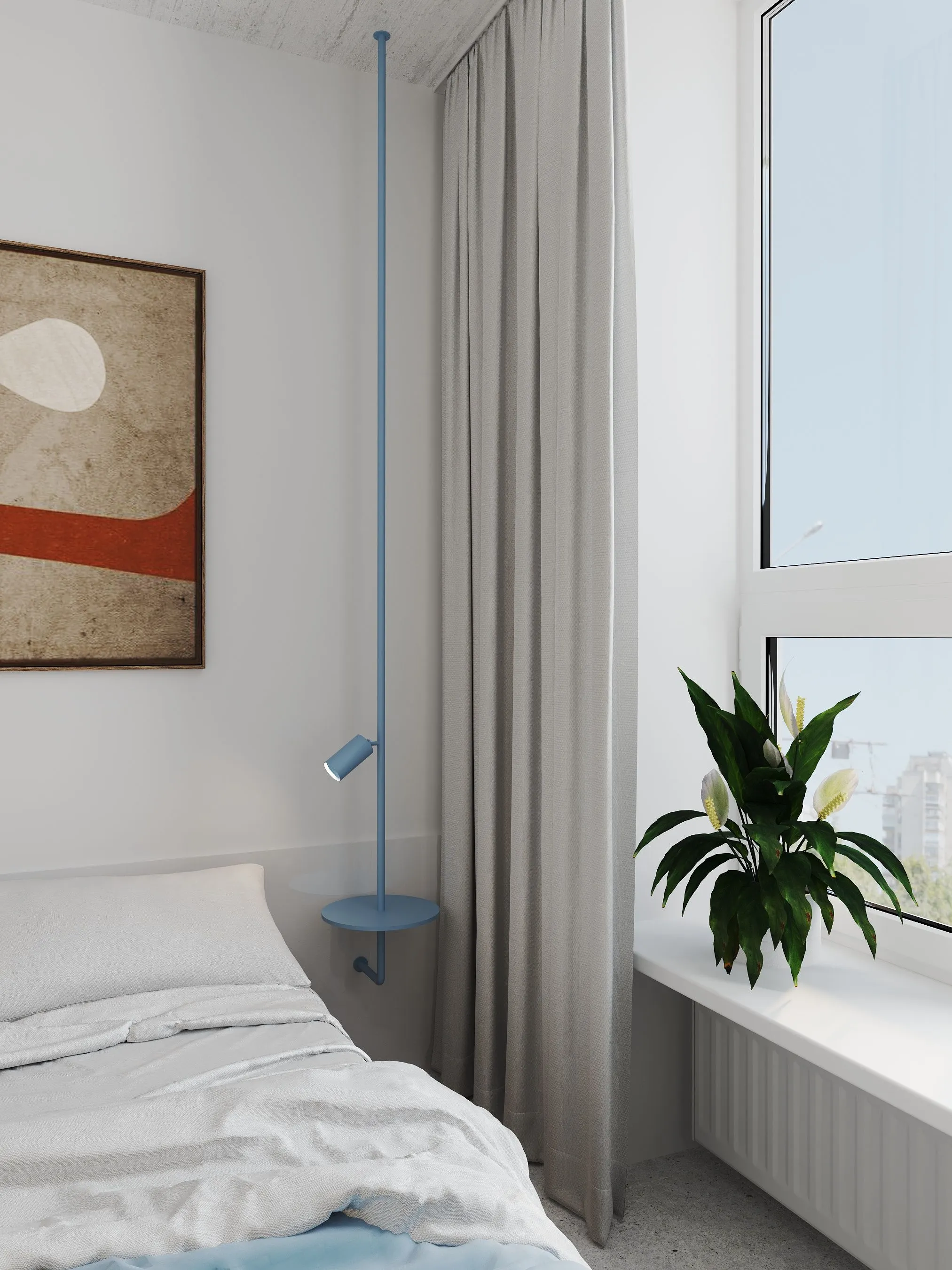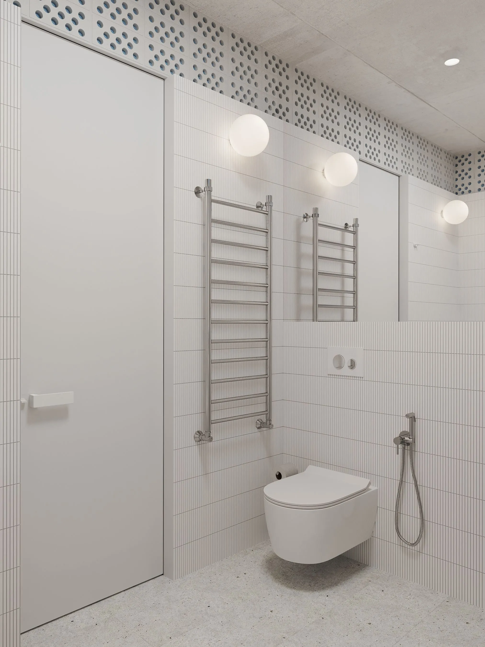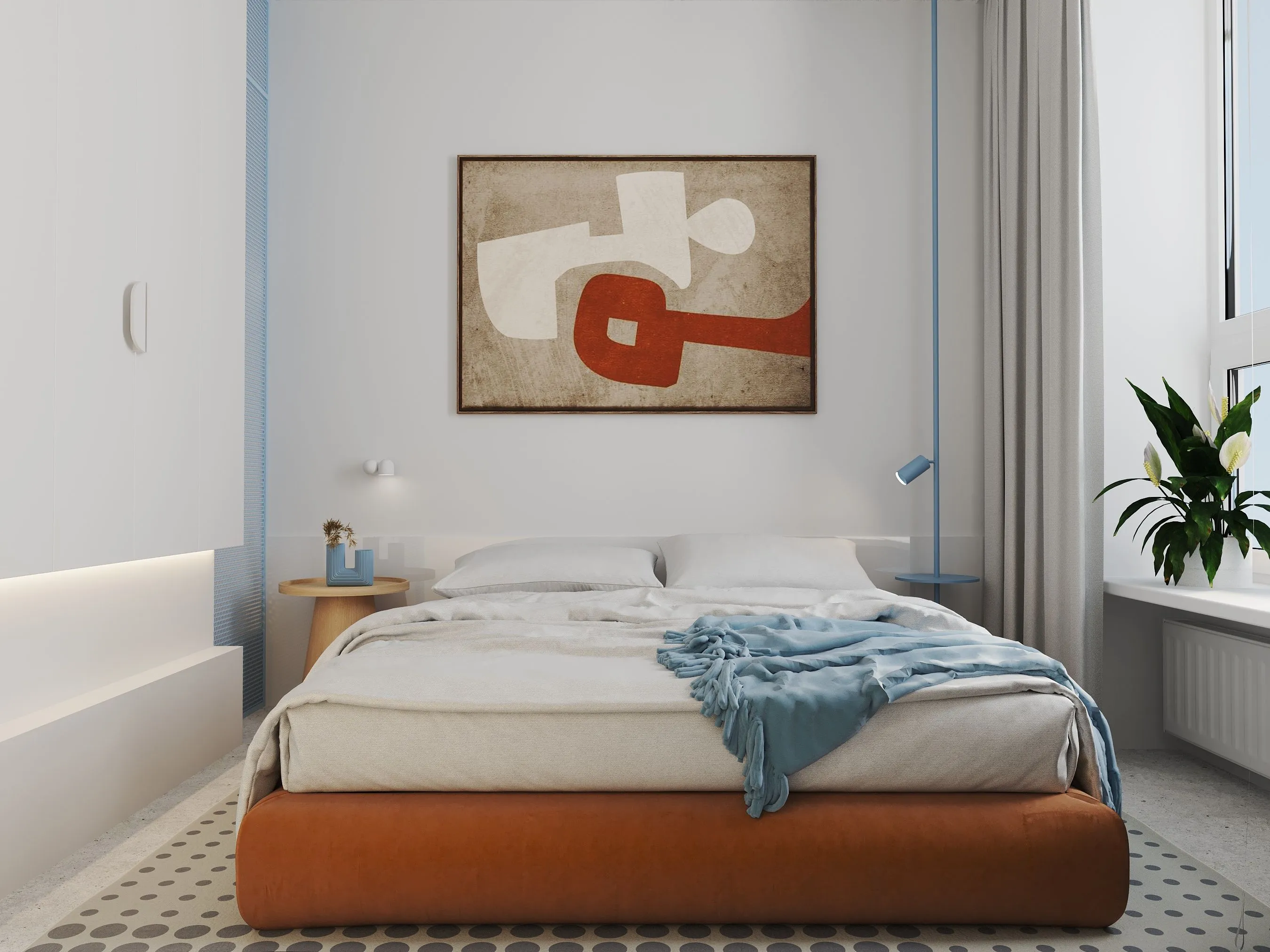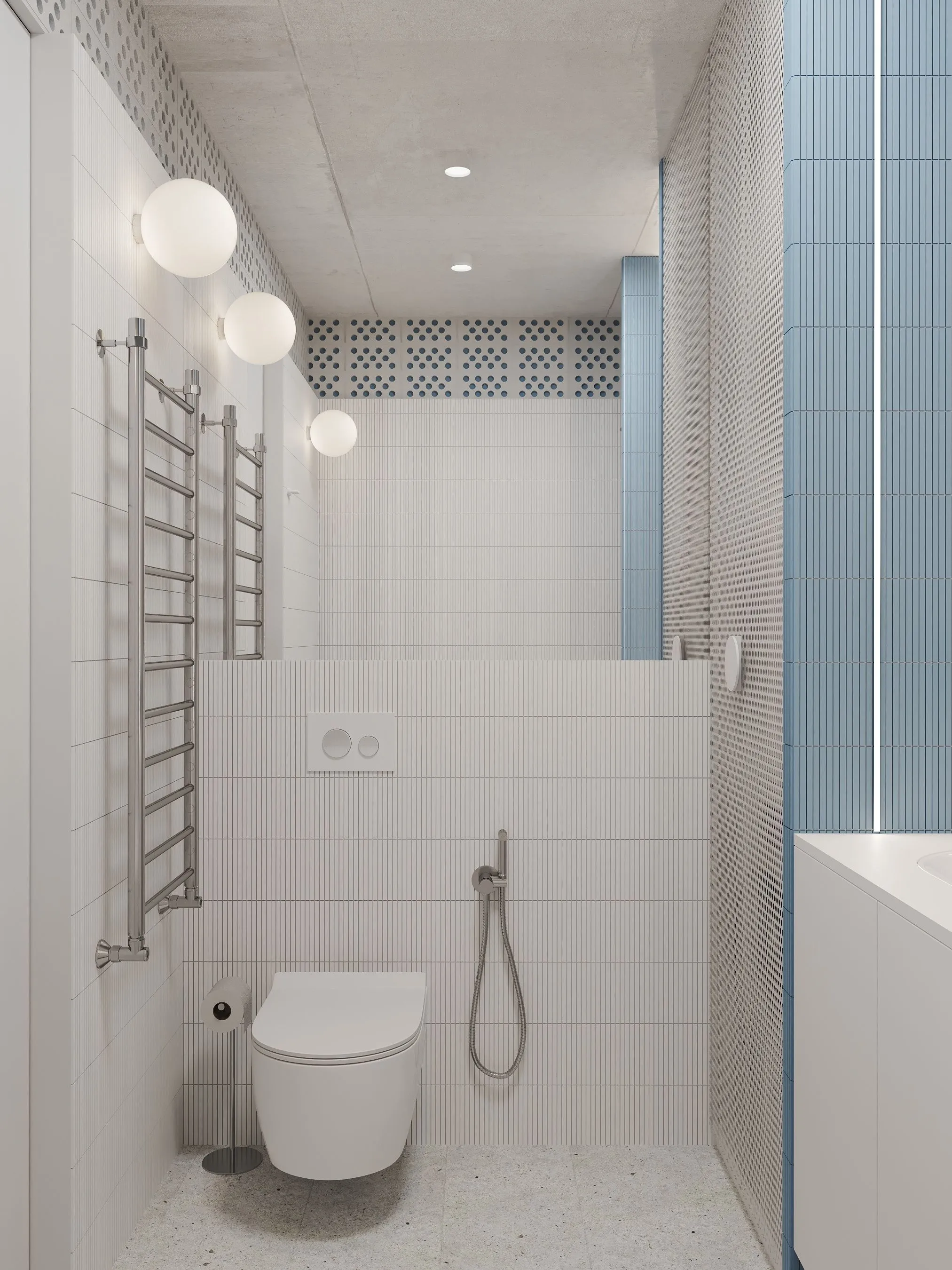 Ключові елементи інтер’єру: • Кухня-їдальня: блакитні шафи без ручок створюють чисту геометрію. Сітчаста стеля, приховані світильники та дерев’яні панелі задають ритм і структуру. • Вітальня: компактна зона з яскравим акцентом — помаранчевим диваном, який виступає як емоційний центр простору. Перфорація на стінах та меблях повторює мотив сітки, об’єднуючи різні зони. • Спальня: затишна, мінімалістична, з м’яким текстилем і абстрактною графікою. Блакитні трубчасті світильники-підвісні консолі — нестандартне рішення, що поєднує форму і функцію. • Санвузол: контраст фактур — глянцевої плитки, перфорованих елементів і гладких поверхонь — створює візуальну глибину. Блакитний колір і тут виконує роль “свіжого повітря”, підсилюючи чистоту простору. • Робоча зона: невелике, але продумане робоче місце з видом на вікно та з фокусом на спокійну, нейтральну атмосферу.