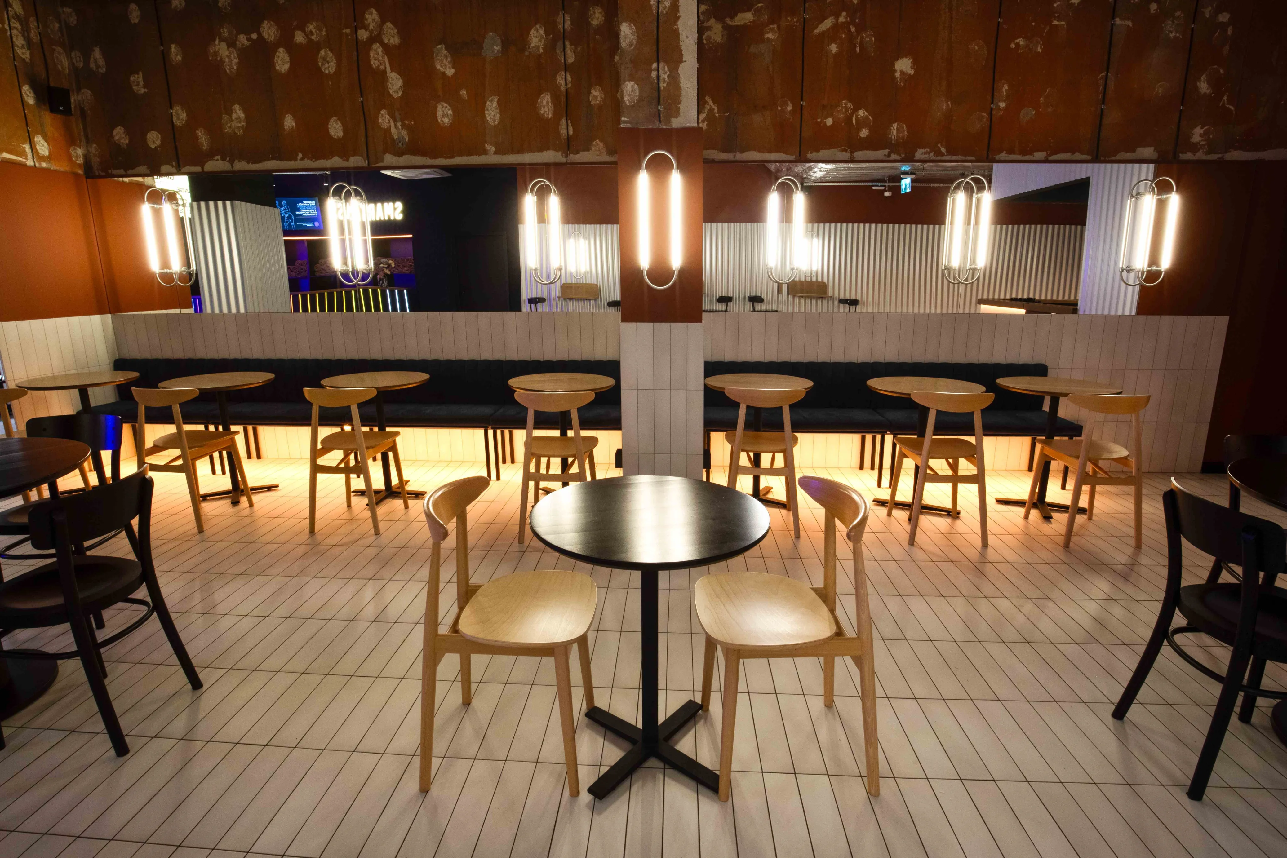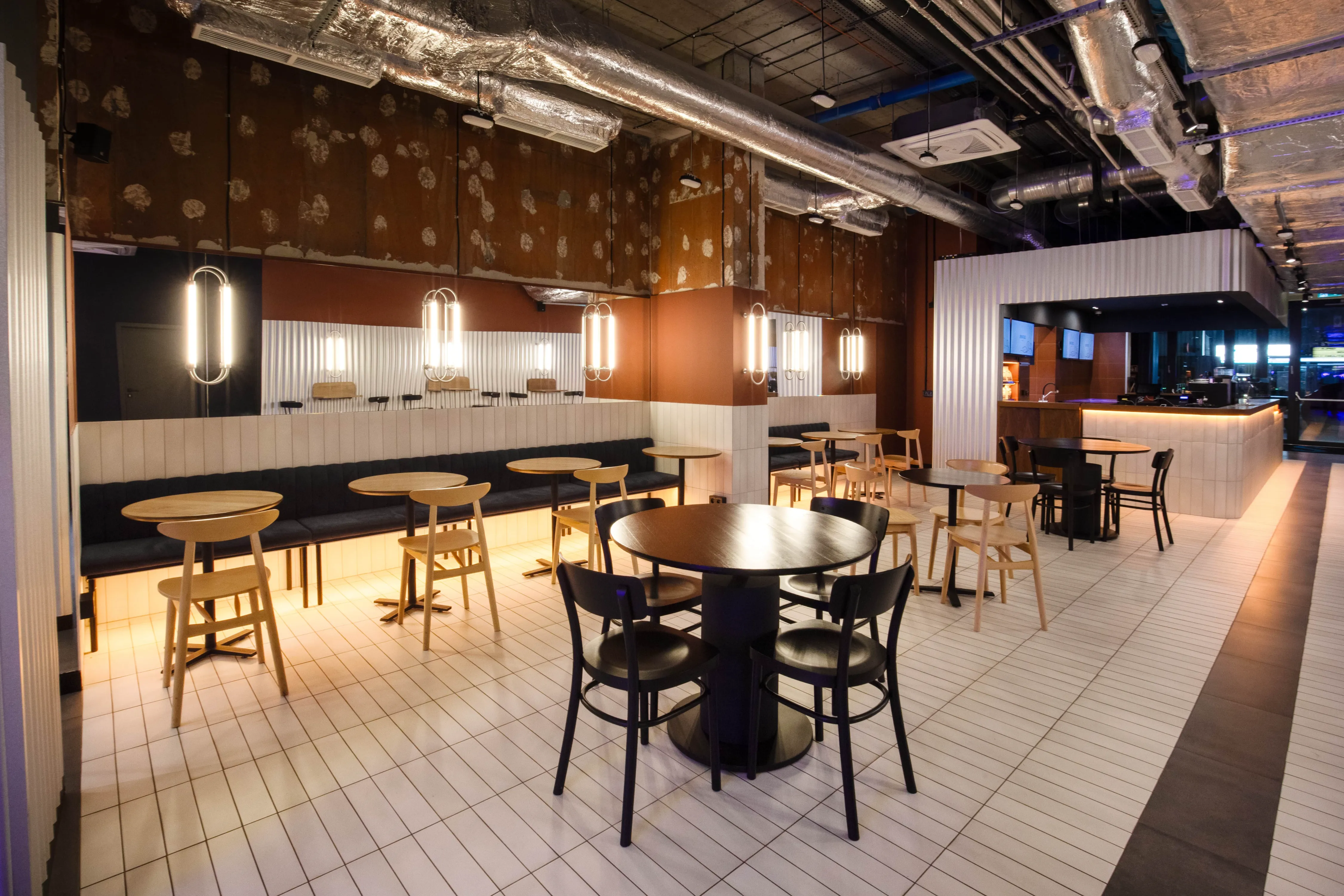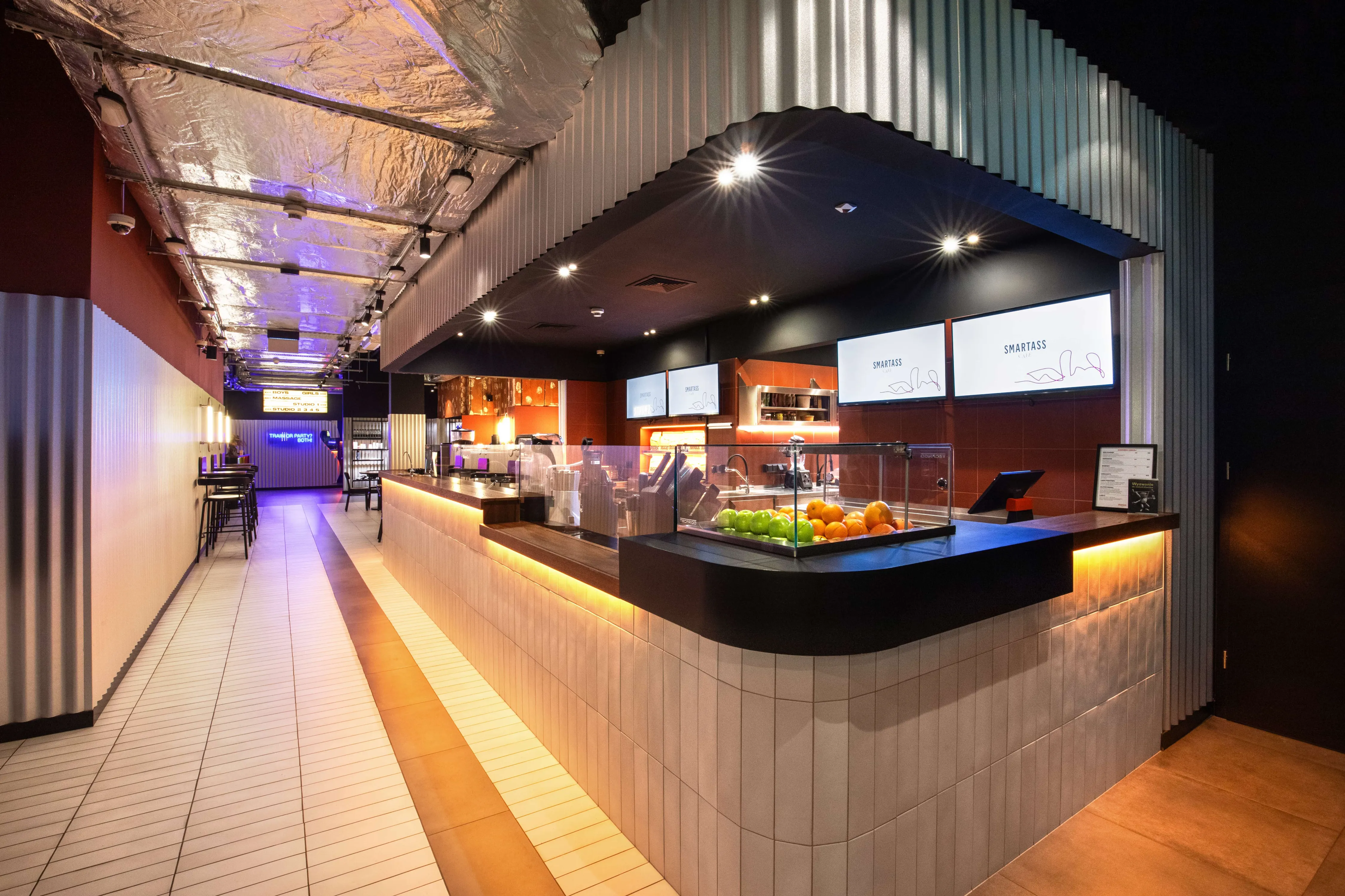 Smartass Cafe Warsaw — перший заклад здорового харчування мережі Smartass на польському ринку, розташований у сучасному центрі Варшави, на першому рівні престижного житлового комплексу Mennica Residence. Кафе має окремий вхід з вулиці та інтегроване в простір фітнес-клубу Smartass Warsaw.Проєктуючи цей простір, команда Smartass Design поставила за мету не лише створити клубну атмосферу спорту, а й познайомити польську аудиторію з унікальним підходом Smartass до здорового харчування. На жаль, у обраному приміщенні за нормами неможливо було зробити повноцінний ресторан, тому народився новий формат – Smartass Cafe. Smartass Cafe – це заклад зі збалансованими та здоровими швидкими стравами та напоями у форматі take-away. Кафе розташоване у фронтальній частині клубу, а барна стійка є першою точкою контакту для відвідувачів.Зона кафе має чотири основні частини: бар і зону видачі замовлень, барні столи, зону з диванами та класичну посадкову зону. Дизайн кафе виконано в поєднанні холодного відтінку металу та теплих відтінків теракоти. Хвилясті металеві панелі гармонійно поєднуються з керамогранітом кольору червоної глини на кухні та відкритими частинами стін, які збереглися від забудовника. Для посилення кольорової гармонії стіни кафе також пофарбовані у відтінках теракоти.Барна стійка, підлога в зоні кафе та стіни з диванами оформлені видовженою плиткою, що додає простору ритму й чітко відокремлює кафе від спортивної частини клубу. Окрема увага приділена освітленню: настінні бра з гнутого металу у поєднанні з вертикальними LED-трубками створюють теплу та затишну атмосферу.Team: Катерина Кузьменко, Алла Литвиненко, Валерія Дегтярьова