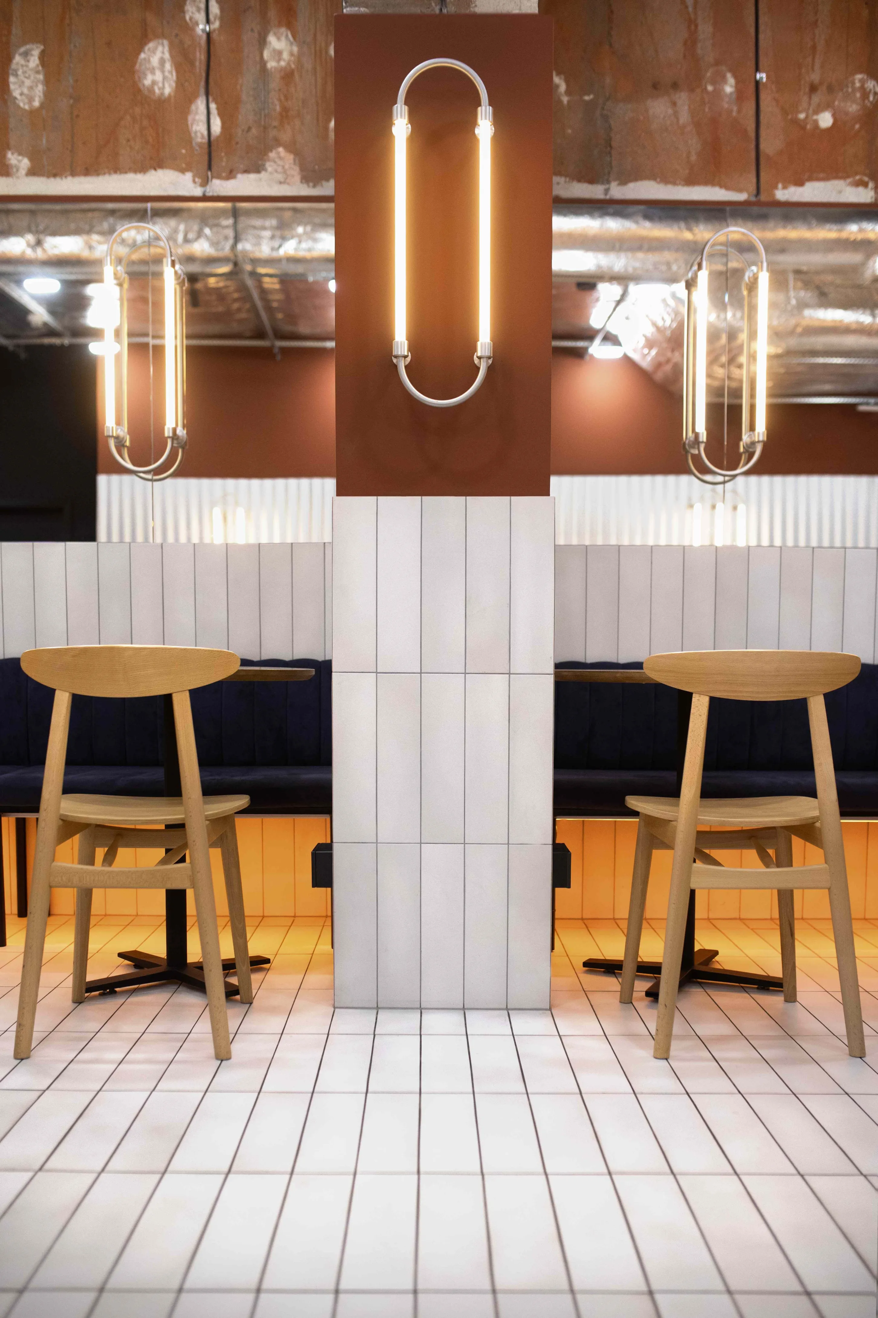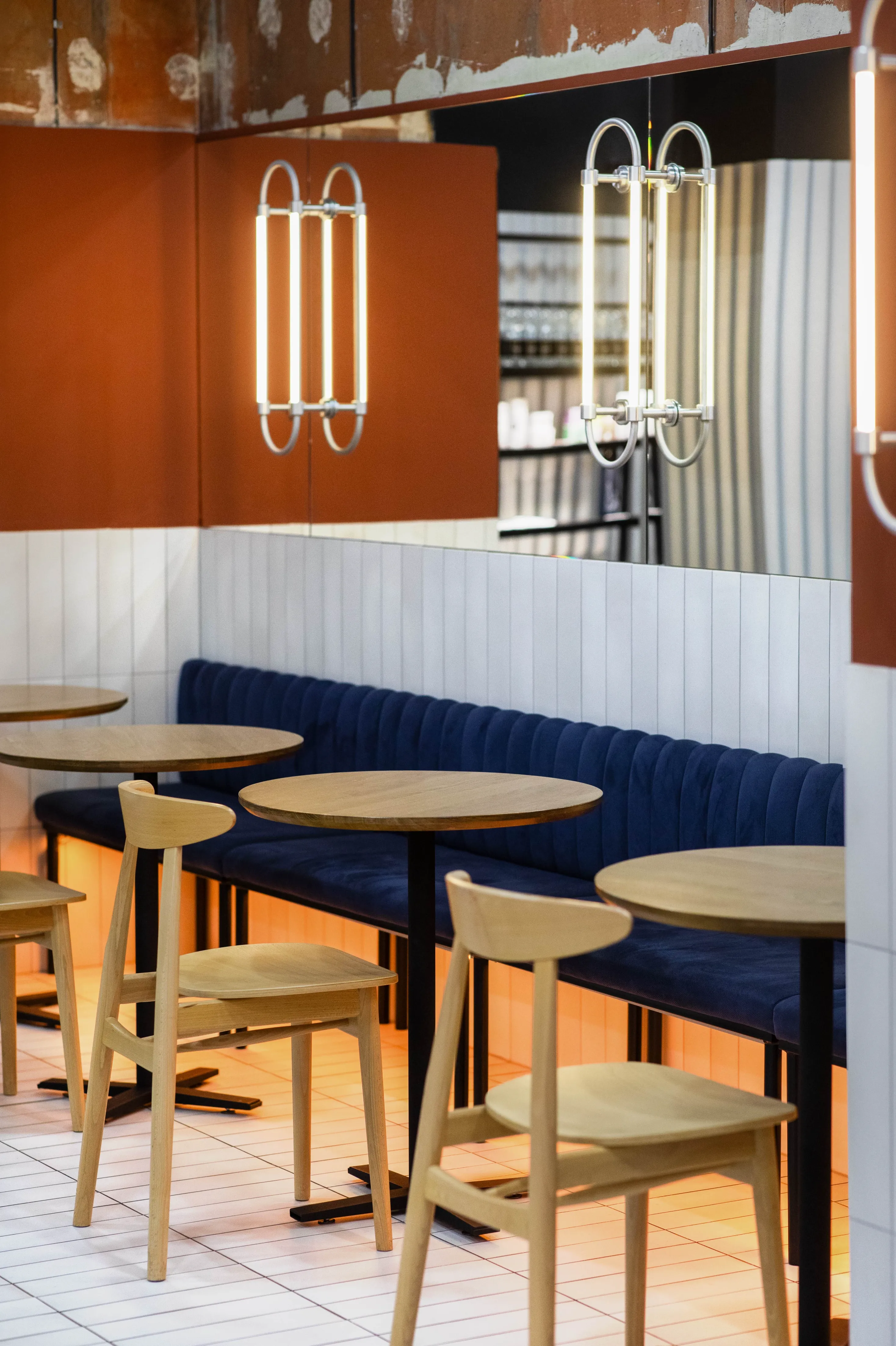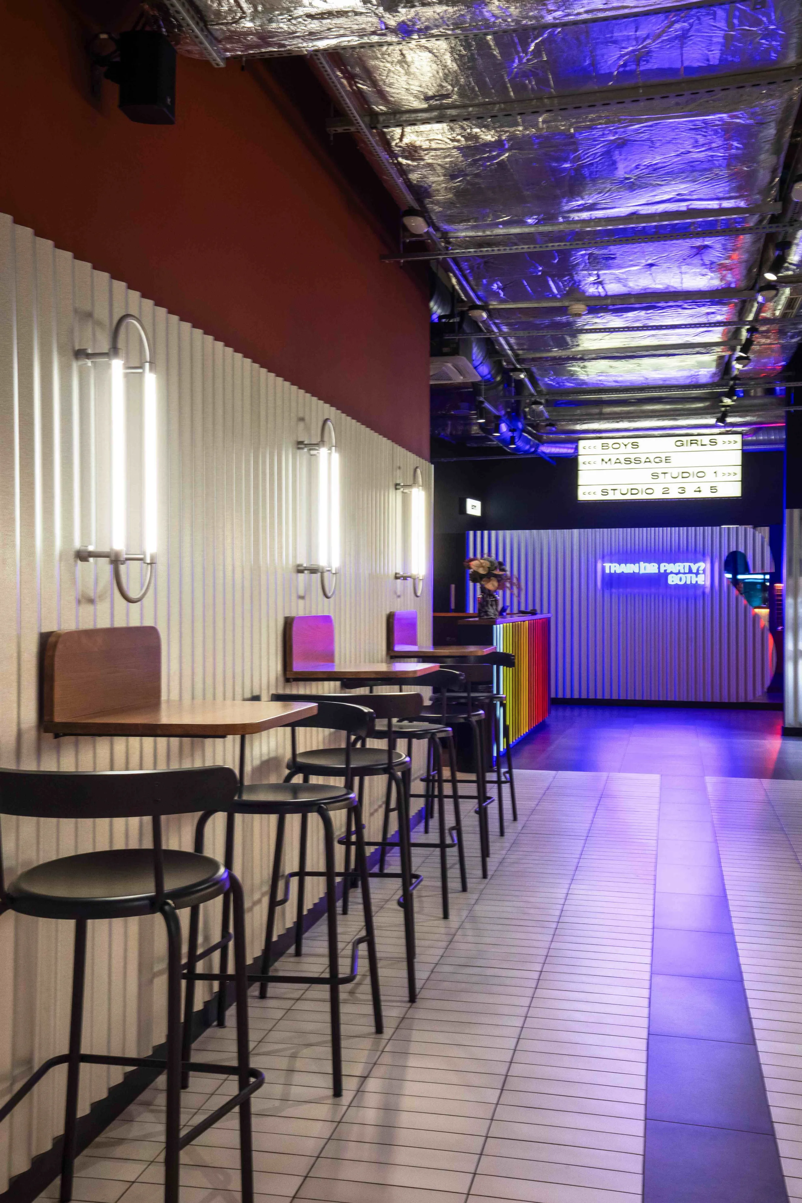 Smartass Cafe Warsaw — перший заклад здорового харчування мережі Smartass на польському ринку, розташований у сучасному центрі Варшави, на першому рівні престижного житлового комплексу Mennica Residence. Кафе має окремий вхід з вулиці та інтегроване в простір фітнес-клубу Smartass Warsaw.Проєктуючи цей простір, команда Smartass Design поставила за мету не лише створити клубну атмосферу спорту, а й познайомити польську аудиторію з унікальним підходом Smartass до здорового харчування. На жаль, у обраному приміщенні за нормами неможливо було зробити повноцінний ресторан, тому народився новий формат – Smartass Cafe. Smartass Cafe – це заклад зі збалансованими та здоровими швидкими стравами та напоями у форматі take-away. Кафе розташоване у фронтальній частині клубу, а барна стійка є першою точкою контакту для відвідувачів.Зона кафе має чотири основні частини: бар і зону видачі замовлень, барні столи, зону з диванами та класичну посадкову зону. Дизайн кафе виконано в поєднанні холодного відтінку металу та теплих відтінків теракоти. Хвилясті металеві панелі гармонійно поєднуються з керамогранітом кольору червоної глини на кухні та відкритими частинами стін, які збереглися від забудовника. Для посилення кольорової гармонії стіни кафе також пофарбовані у відтінках теракоти.Барна стійка, підлога в зоні кафе та стіни з диванами оформлені видовженою плиткою, що додає простору ритму й чітко відокремлює кафе від спортивної частини клубу. Окрема увага приділена освітленню: настінні бра з гнутого металу у поєднанні з вертикальними LED-трубками створюють теплу та затишну атмосферу.Team: Катерина Кузьменко, Алла Литвиненко, Валерія Дегтярьова