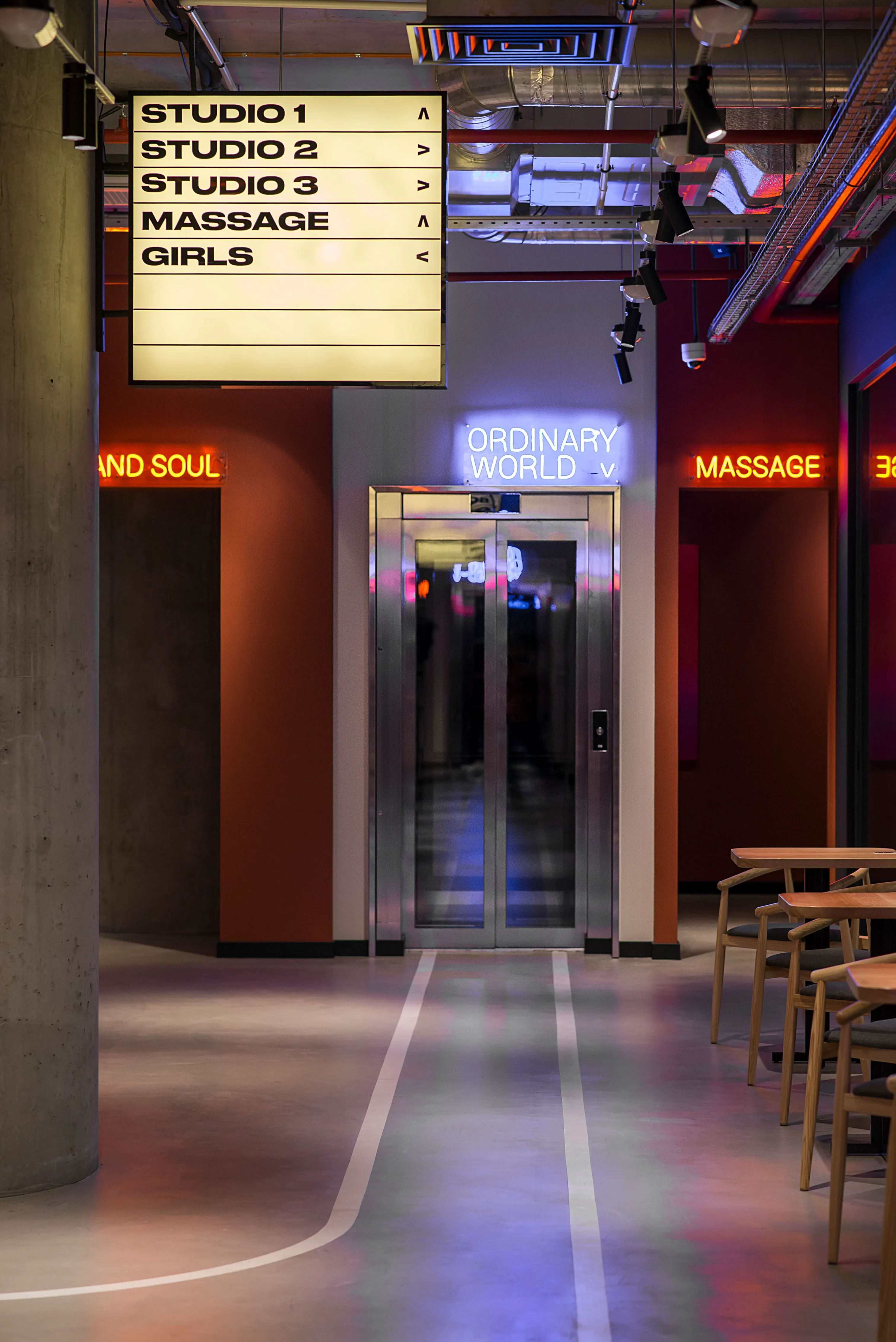 Окремої уваги заслуговують жартівливі неонові написи навігації. Наприклад, окрім утилітарного позначення Gym та Soul над дверними прорізами, над лифтами знаходяться Ordinary world зі стрілкою вниз,