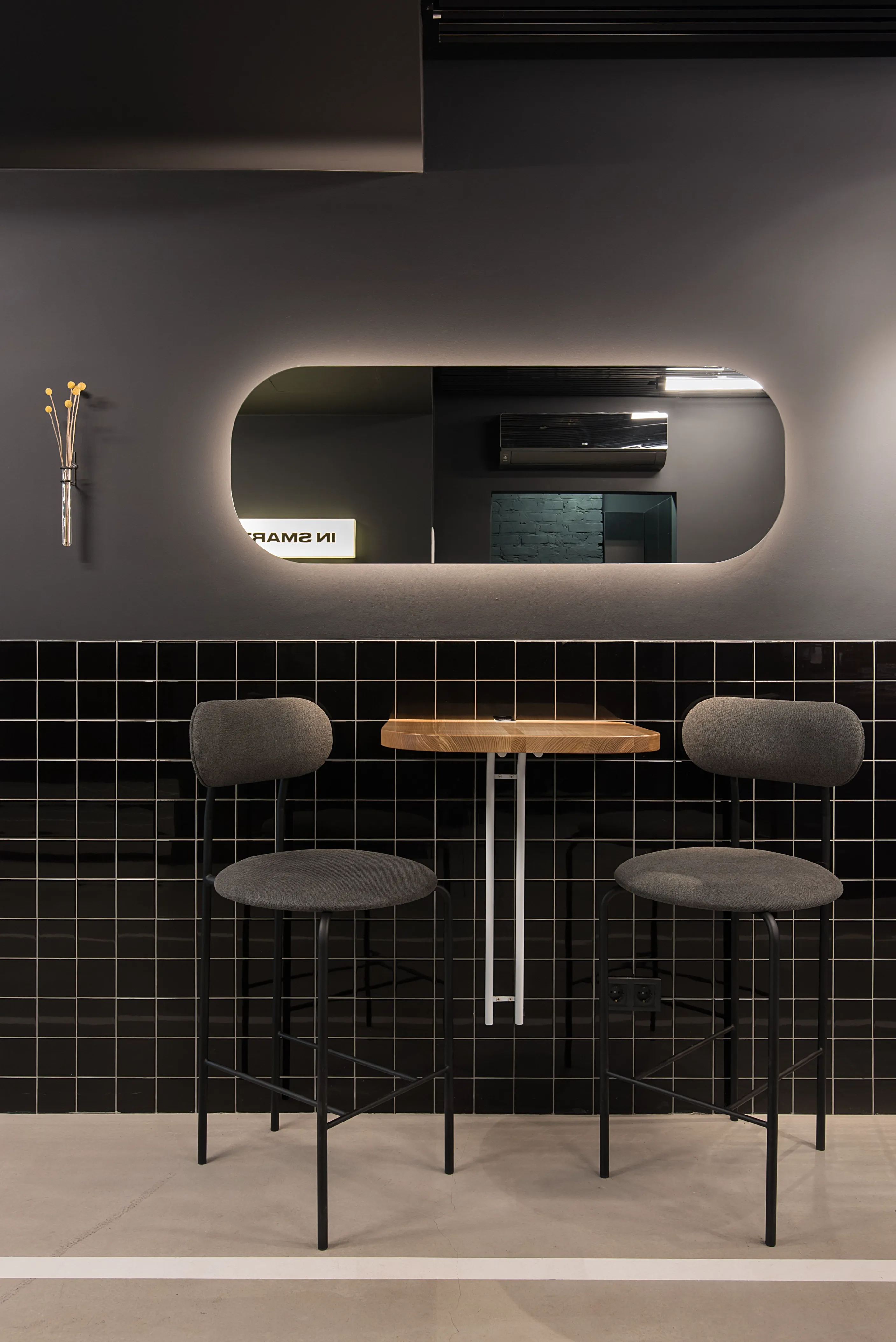 Окремим focal point є невеличка зона з мерчем, яка оточує існуючу колону мінімалістичними полицями з підсвіткою та стильним гнутими неоновими написами.