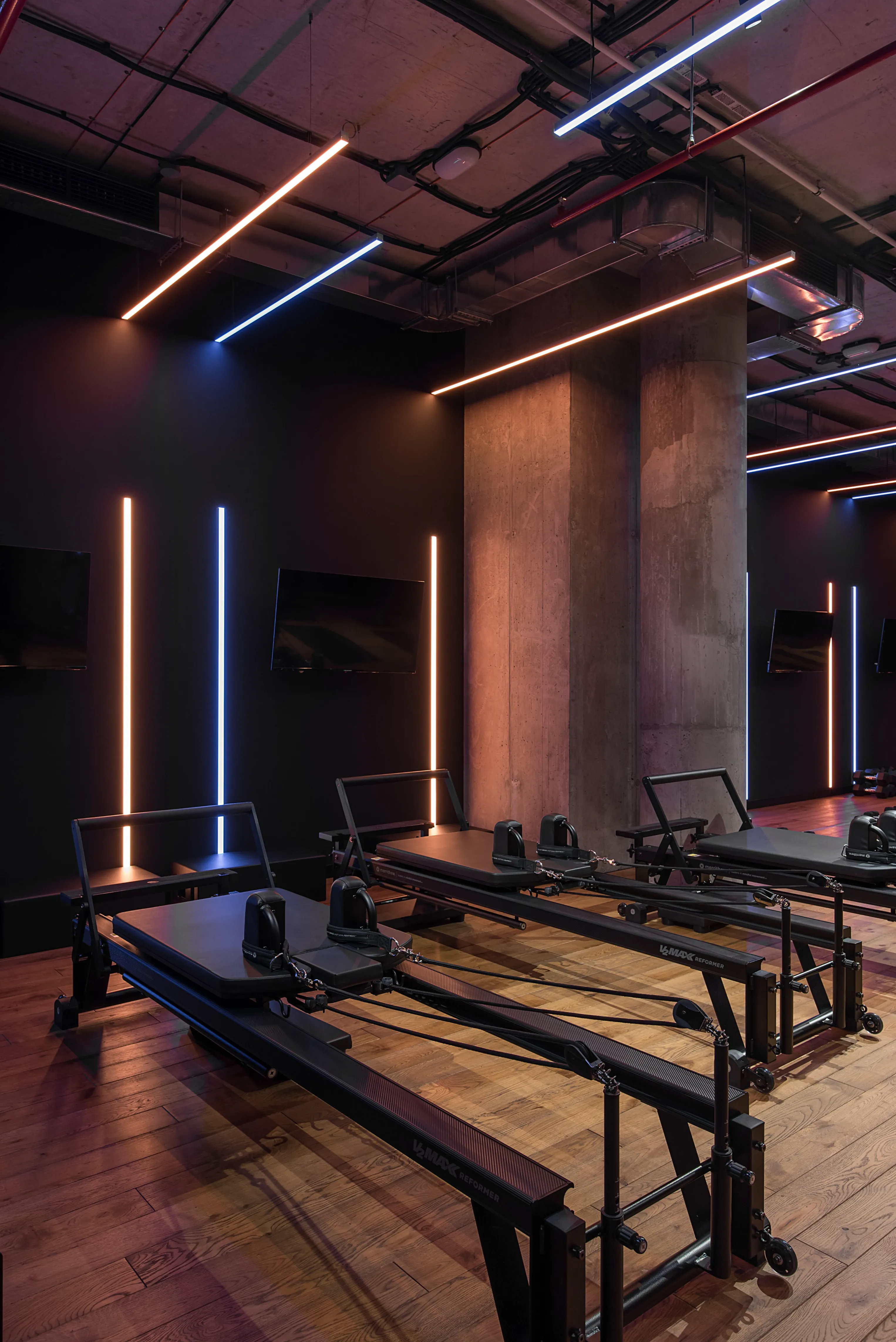В залі з реформерами основна увага приділена тренувальним станціям. Світло налаштовано таким чином, щоб бути компліментарним, а не основним елементом простору.
