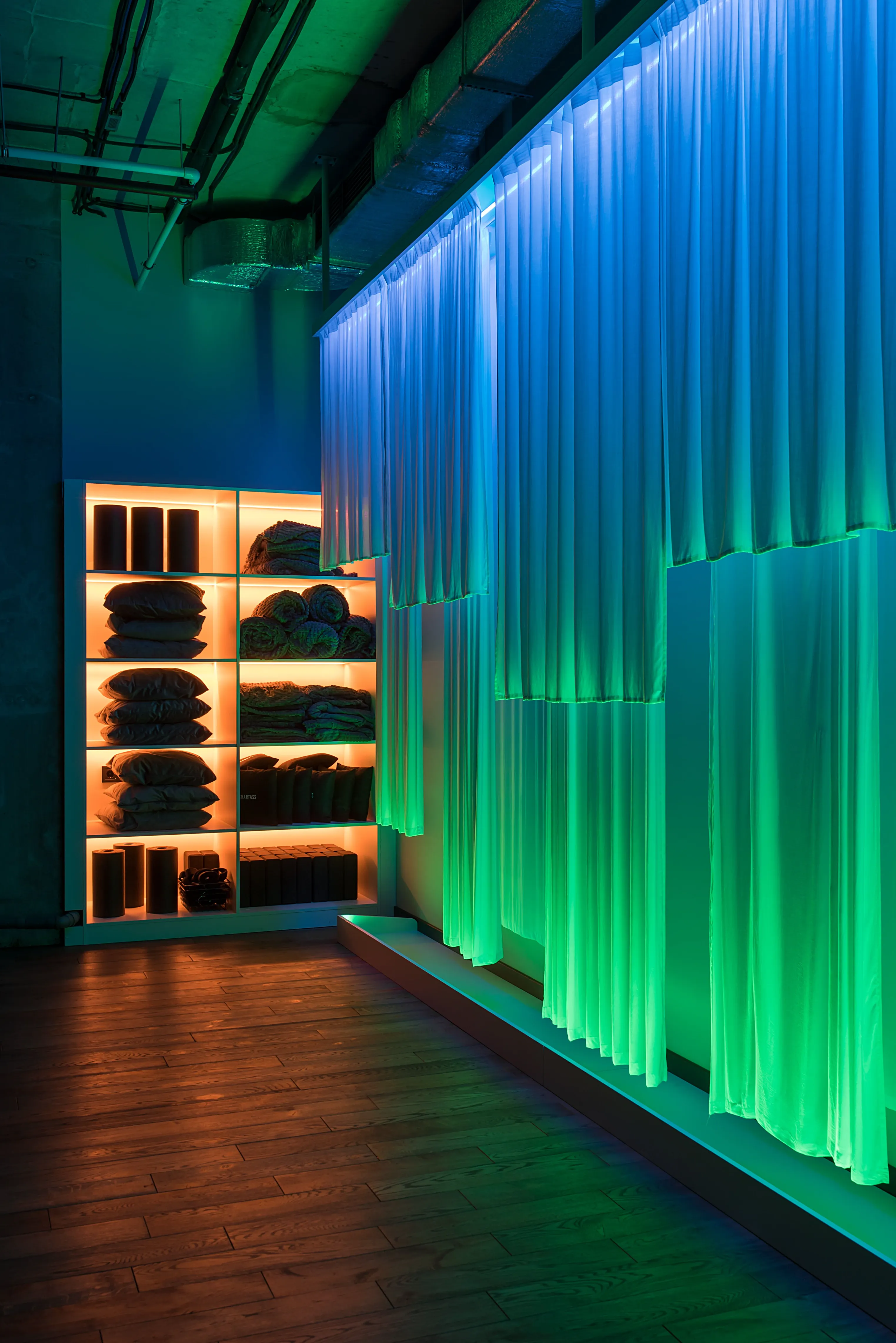 В залі для йоги на одній з стін присутня велика інсталяція з динамично відрізаними полосами тканини різної довжини, вздовж якої струїться верхнє та нижнє кольорове світло. Тренер має змогу змінювати кольори інсталяції згідно заданих сценаріїв: години сонцестояння (світанок, полудень, вечір, захід сонця), заспокійливі кольорові комбінації та моно кольори.
