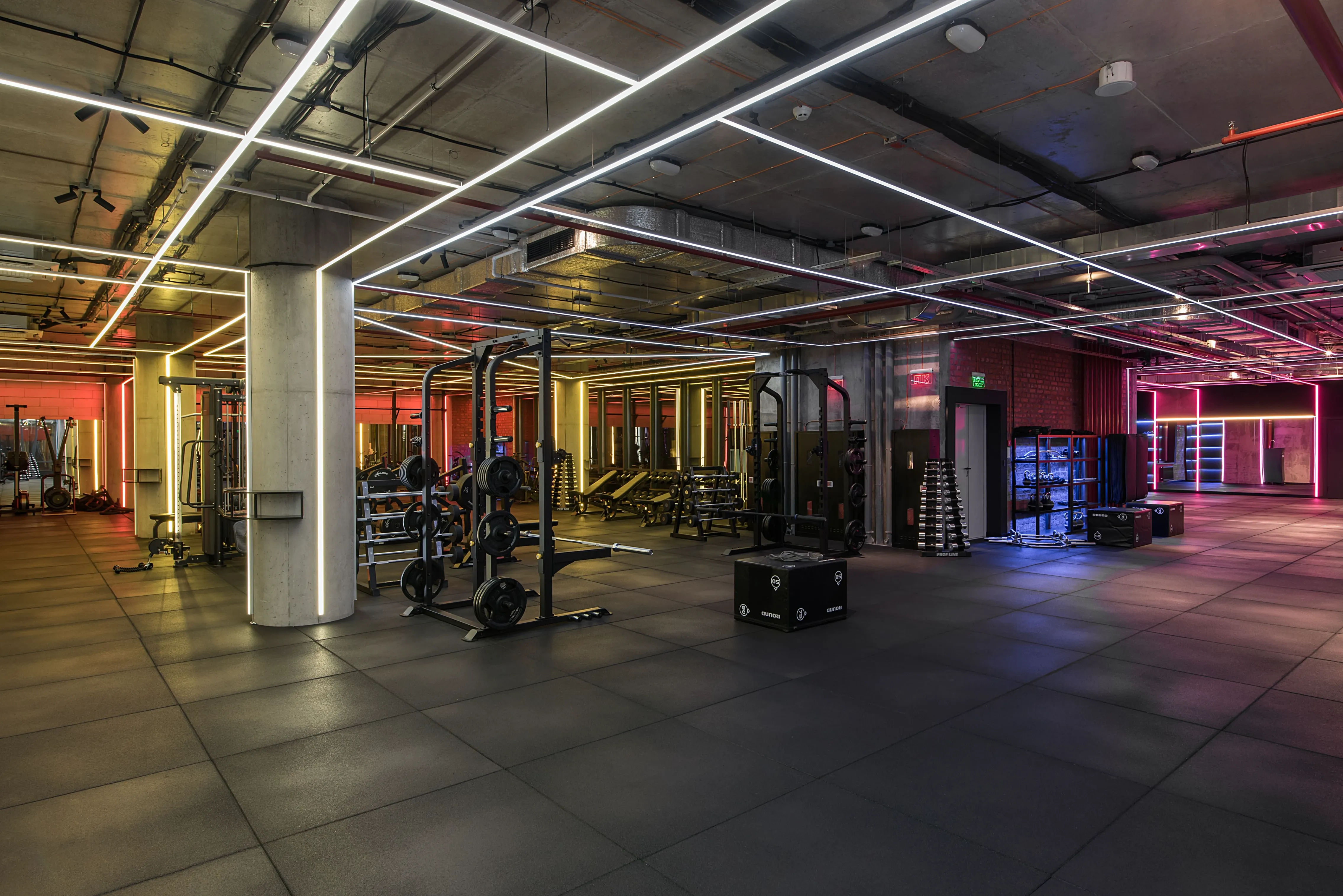 Сама робоча тренажерна зона починається з набірної блокової гумової підлоги чорного кольору та ефектною інсталяцією на стелі, яка імітує градієнтний перехід від світанку до заходу сонця. По ходу вашого руху вздовж різних тренувальних зон, змінюється настрій та інтенсивність світла за рахунок інсталяції. Дизайнерська група Smartass буде використовувати цей зв’язок з природою та екстер’єрною середою ще в деяких зонах клубу.