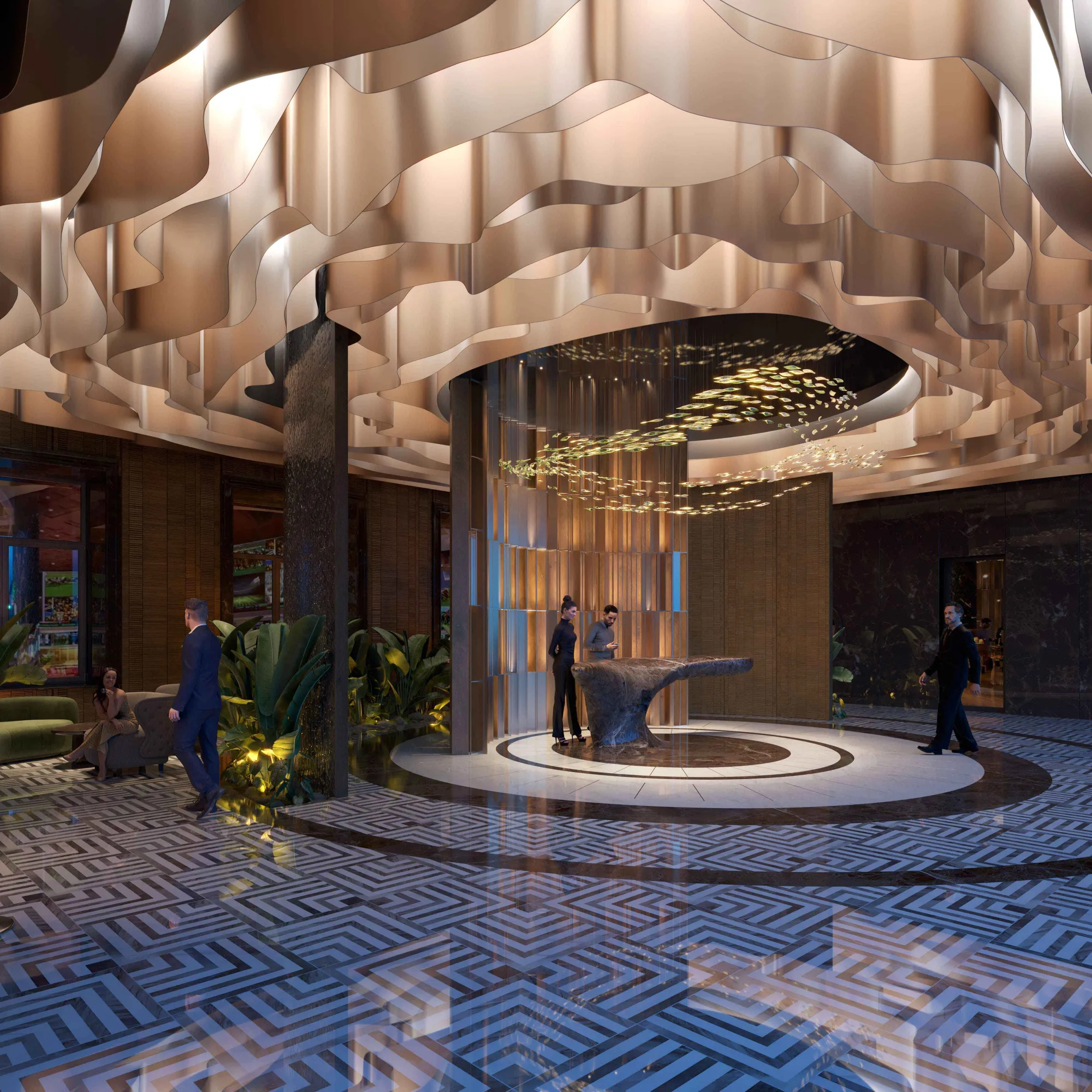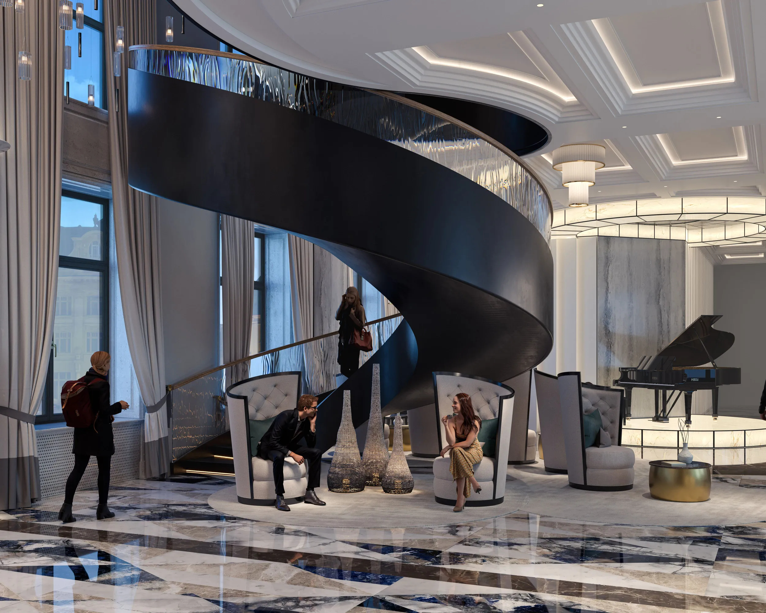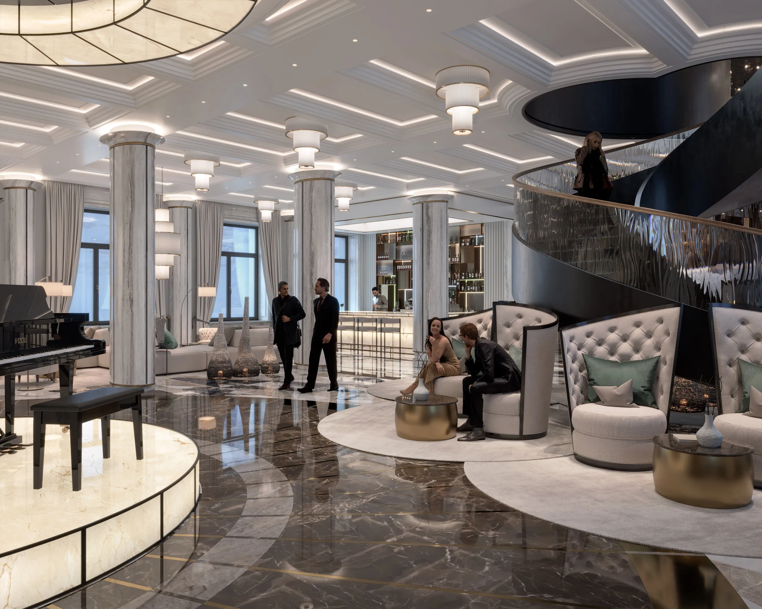 Sophia Hotel вражає гармонійним поєднанням розкоші та сучасного стилю. Лобі оформлене у світлих тонах із використанням мармуру, латуні та м’яких текстур. Центральною композицією зали є гвинтоподібні сходи з темним обрамленням і прозорими поручнями, які додають простору динаміки та елегантності. Поруч розташована зона відпочинку з м’якими кріслами з високими спинками, що створюють атмосферу приватності. Казино зустрічає рецепцією з каменю природної форми, над якою нависає світлова інсталяція у вигляді золотого вихору. Дерево, метал, мармур і тропічні рослини гармонійно переплітаються. Ресторан поєднує індустріальний стиль зі справжньою природністю. Жива зелень, дерев’яні панелі, бірюзова плитка й м’які меблі створюють атмосферу затишку, яка надихає та запрошує до неспішного відпочинку.