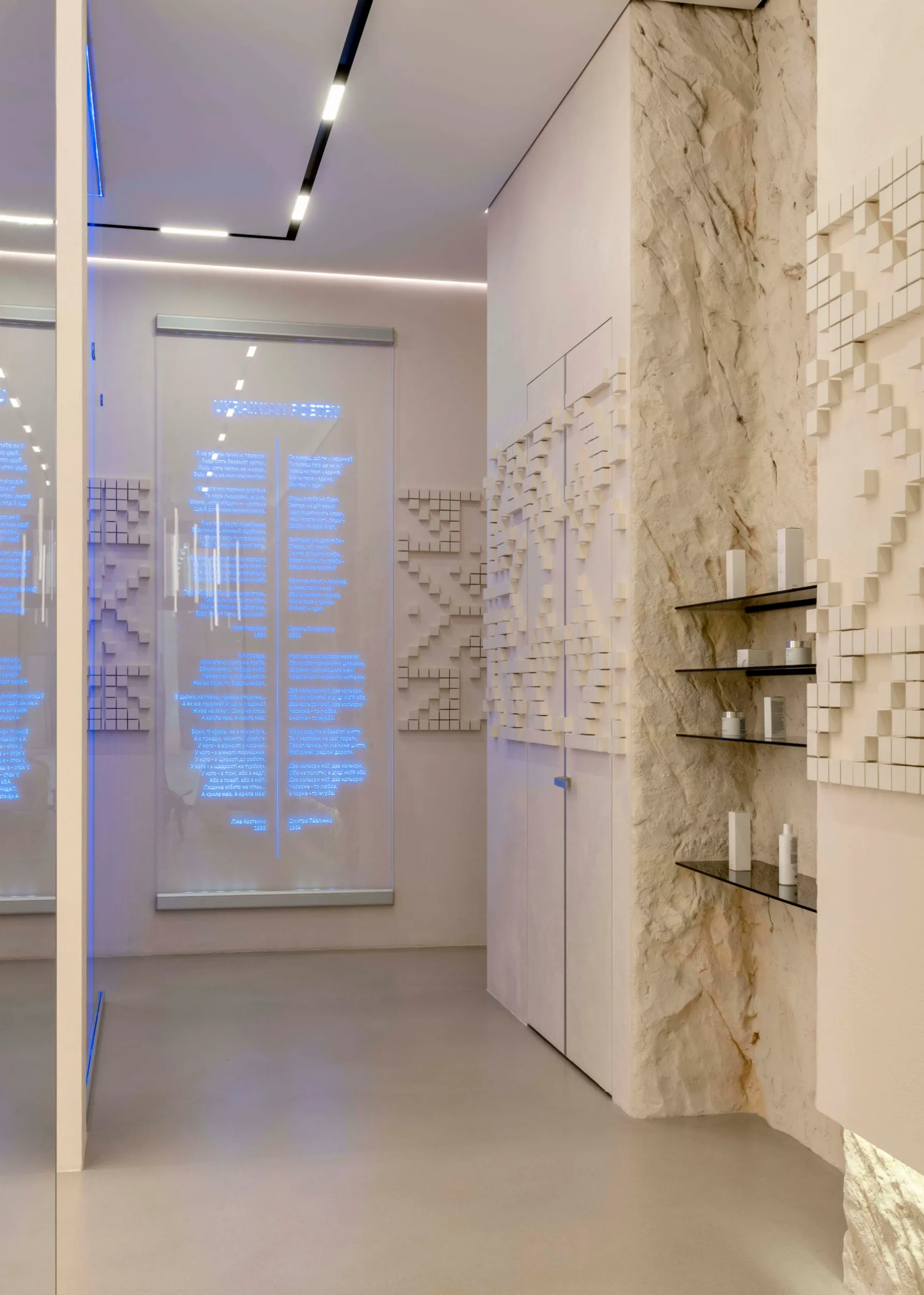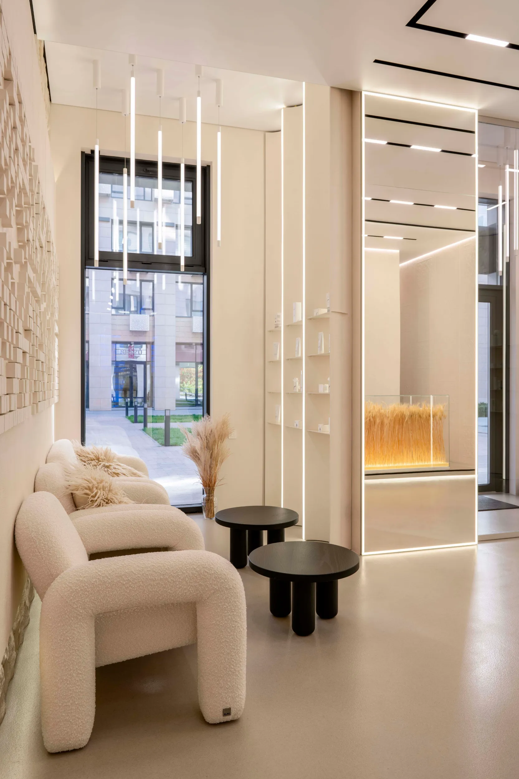 Ми надихались українською вишивкою: використали орнаменти на стінах, імітація вишитих рушників з підсвіткою. Багатством нашого народу завжди була земля і пшениця, тому в зоні ресепшну гостей клініки зустрічає інсталяція під склом з пшениці, яка символізує достаток і благополуччя.