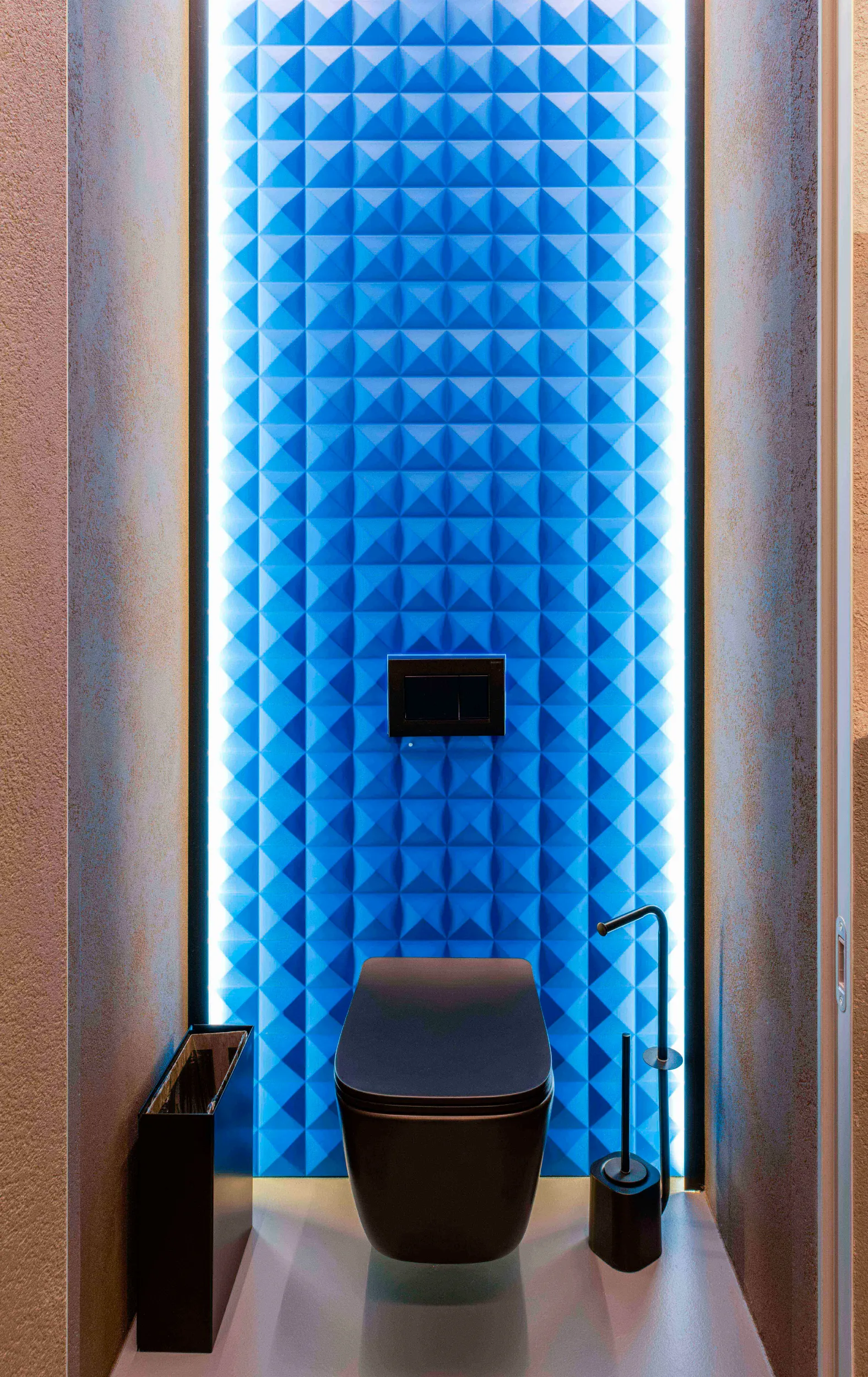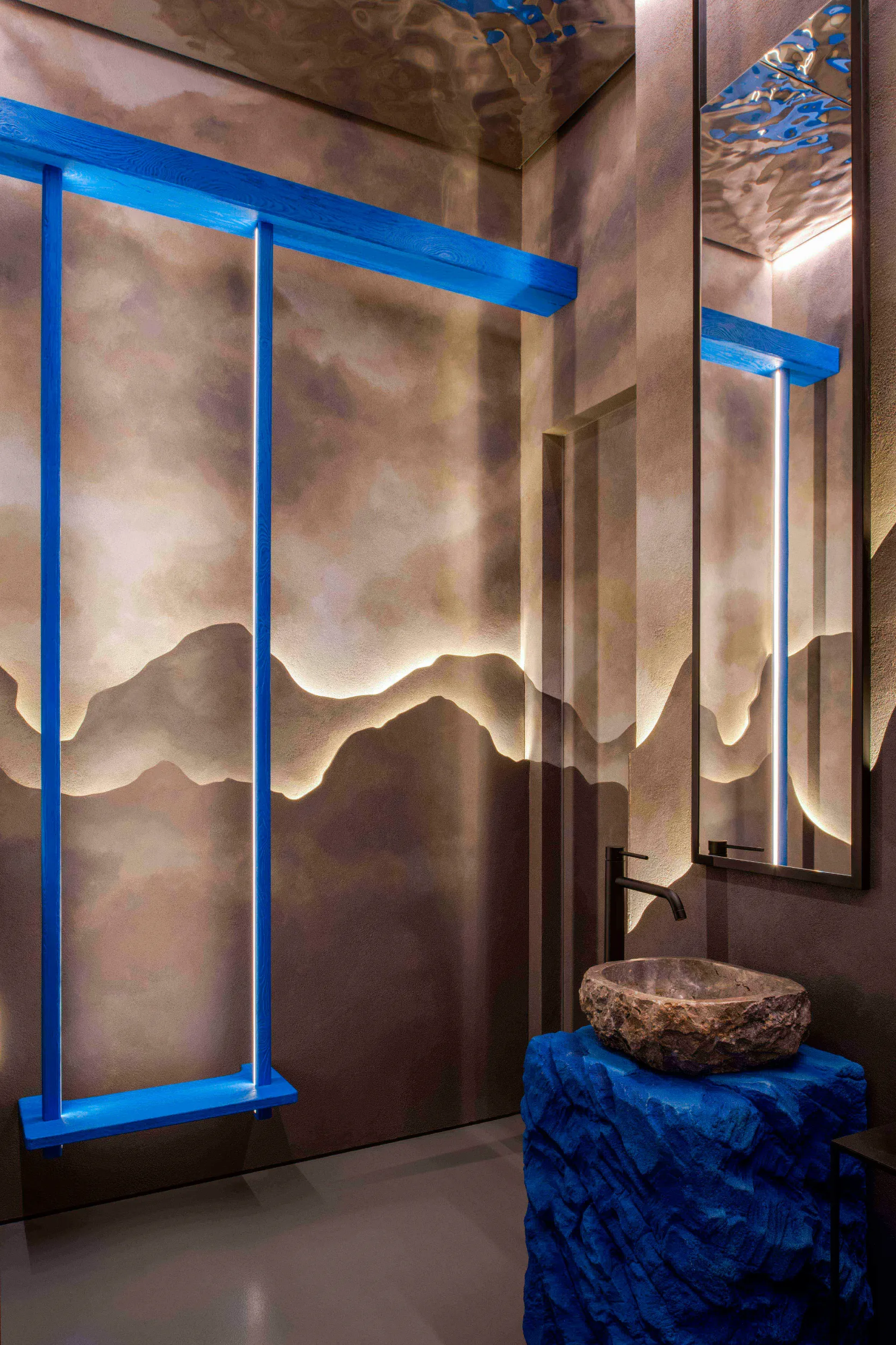 Обриси гір які підсвічуються, легкість хмар та віддзеркалення джерельної води лягли в основу дизайну санвузлу. Яскраво-синій колір, що нагадує чисті гірські озера, текстура каменю на тумбах для раковин, створюють відчуття монументальності та сили, синя гойдалка яка парує над горами - покликана передати відчуття свободи !