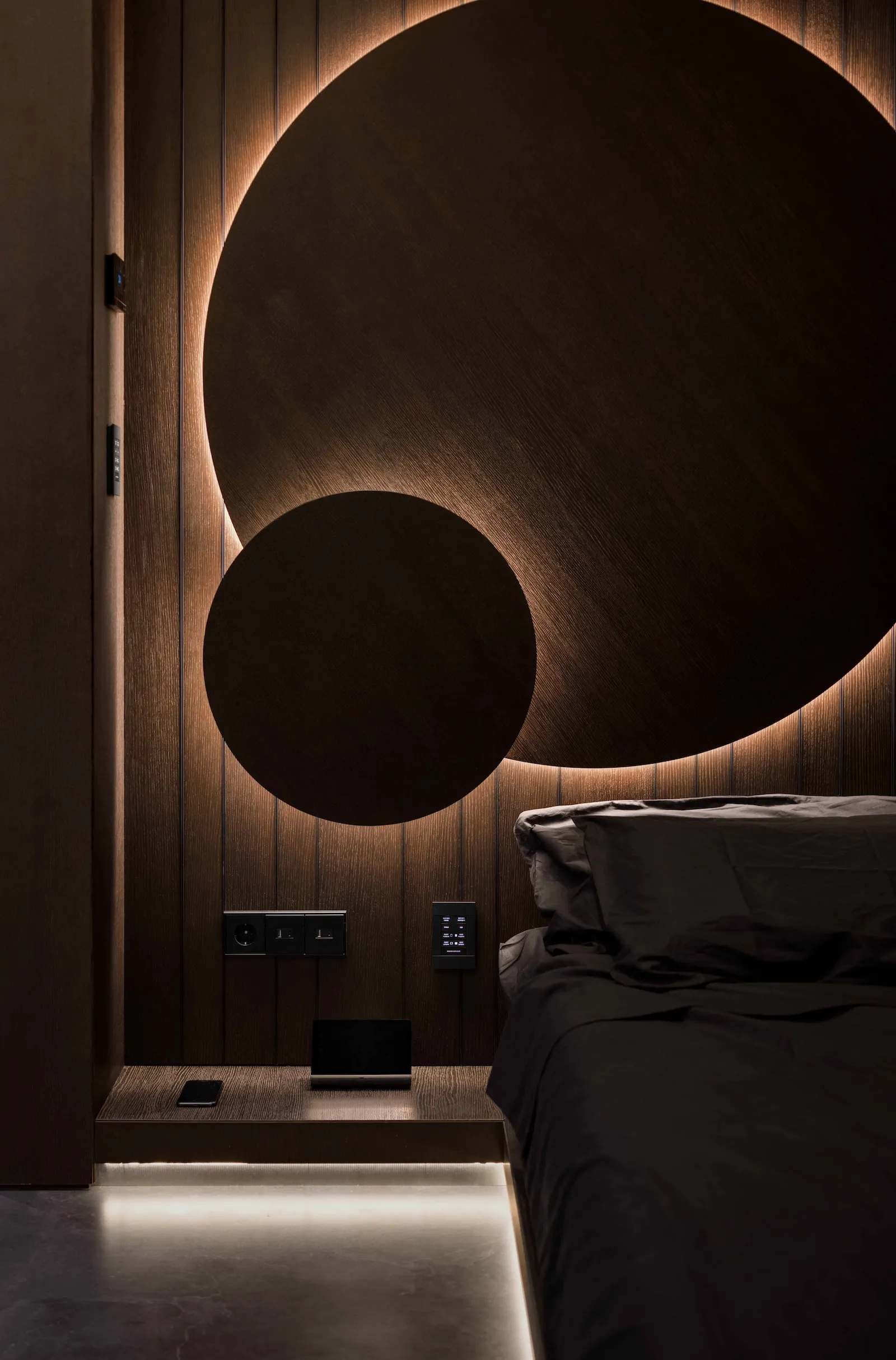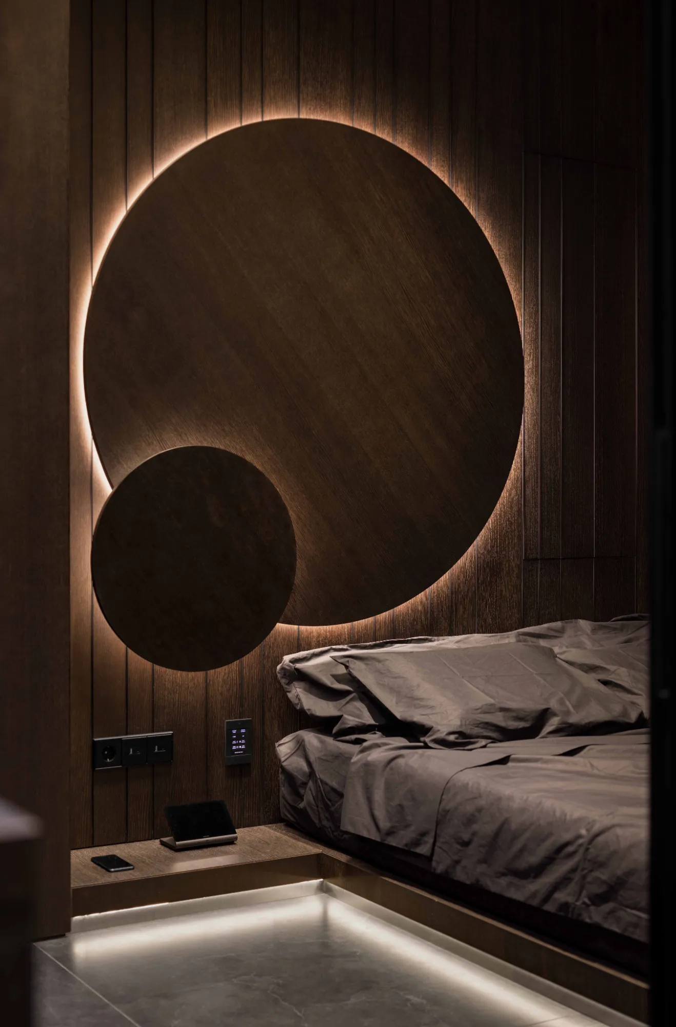 Приватна зона продовжує первісний образ квартири та має незвичайну конфігурацію, так як об’єднує в одному просторі спальну зону, гардеробну та зону для прийняття душу. Спальну кімнату та зону з гардеробом та душем ми розділили розсувною, скляною перегородкою.В спальні ліжко, як і диван у вітальні, ми розташували на подіумі з підсвіткою. Стіни покриті МДФ панелями поєднанні із декоративною штукатуркою.