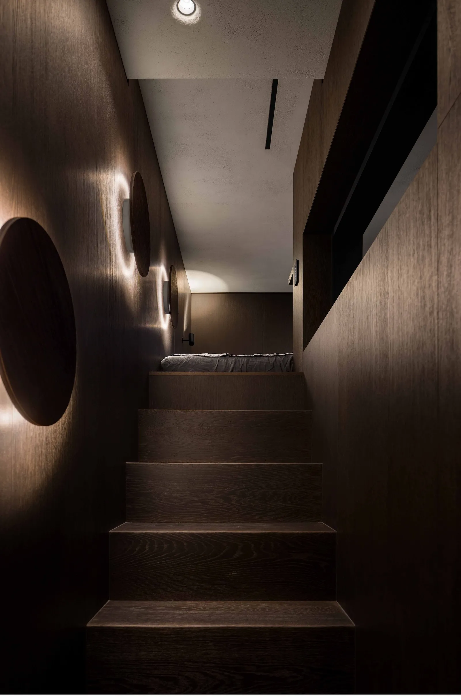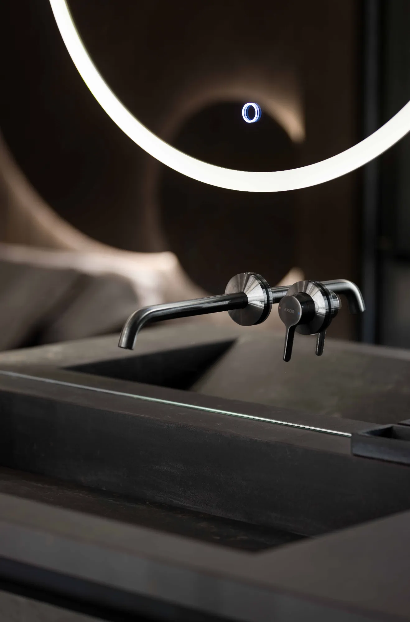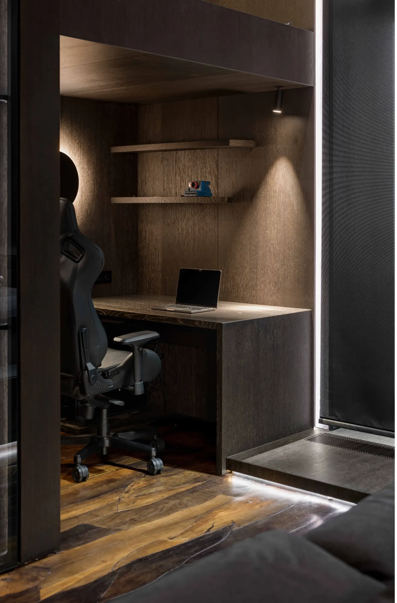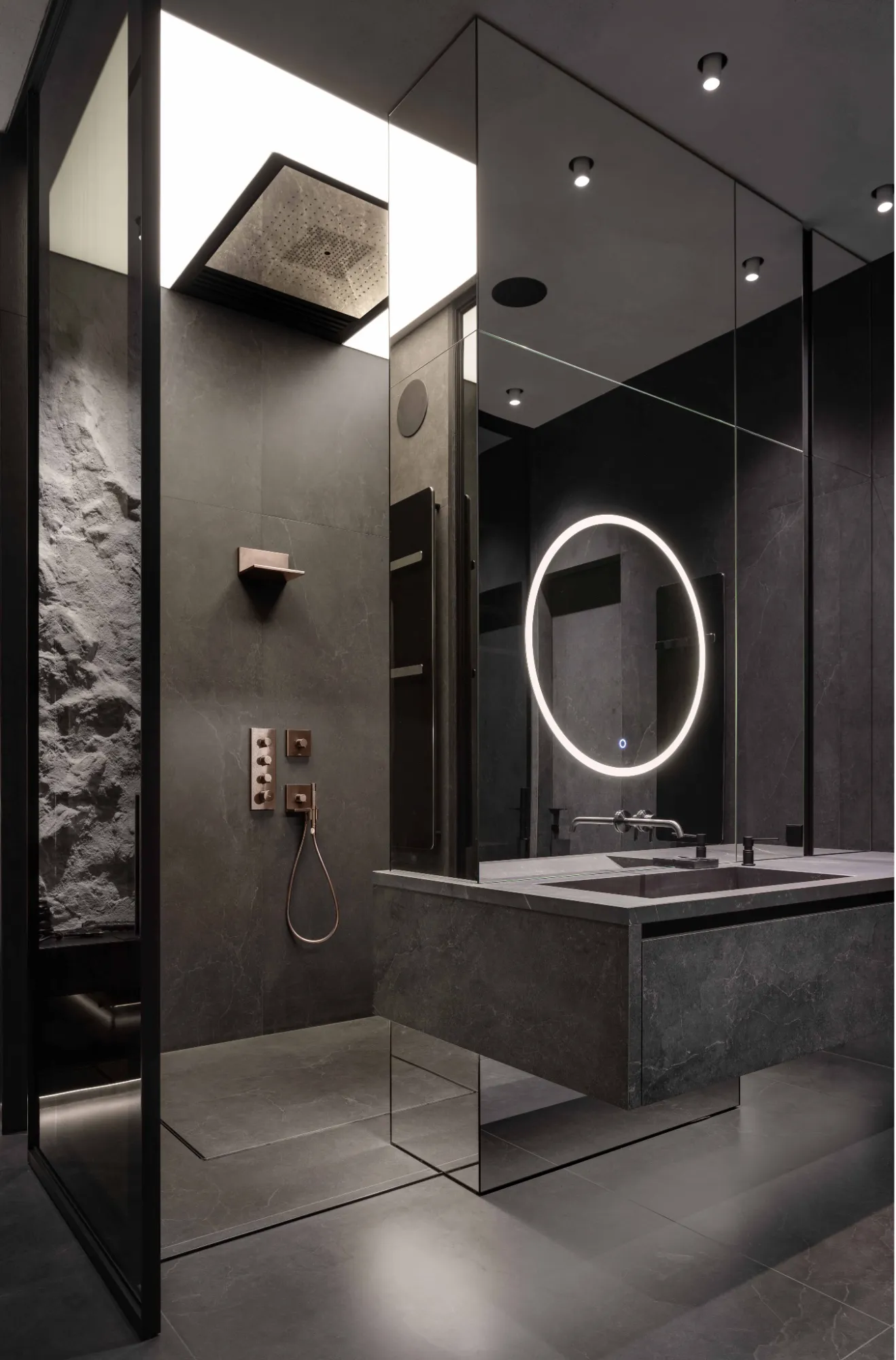 Коли ми заходимо в приватний простір, ми одразу можемо бачити консольний умивальник який виготовлений з широкоформатної кераміки товщиною 6 міліметрів. Над умивальником розташоване дзеркало з фронтальною підсвіткою та скриті полиці для зберігання речей. Під умивальником розташовані видвижні ящики, які виготовлені з мдф панелей, покритих керамічними плитами.Навпроти - розташована шафа для одягу. Фасади виготовлені зі скла, а полиці виготовлені з мдф, яке покрито шпоном та шкірою. Стіни повністью опоряджені керамогранітом графітового кольору із текстурою каменю.