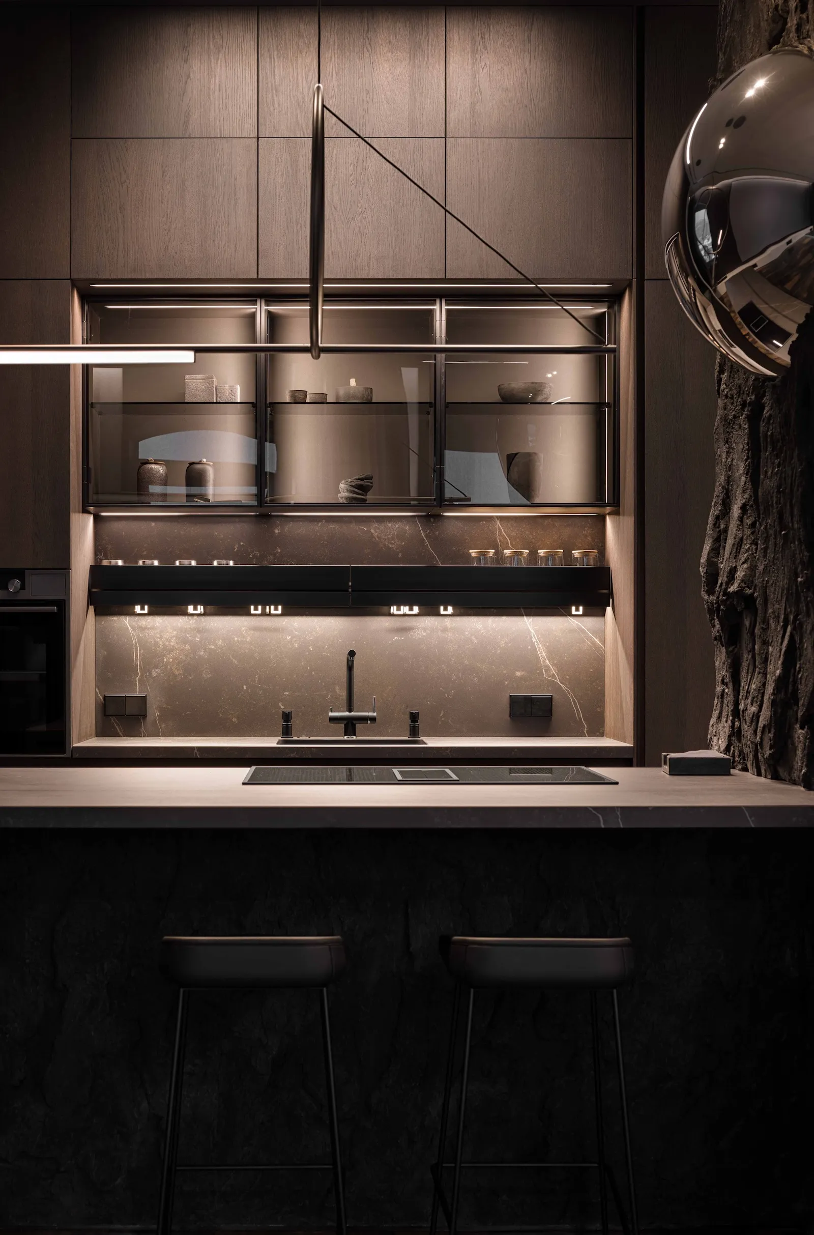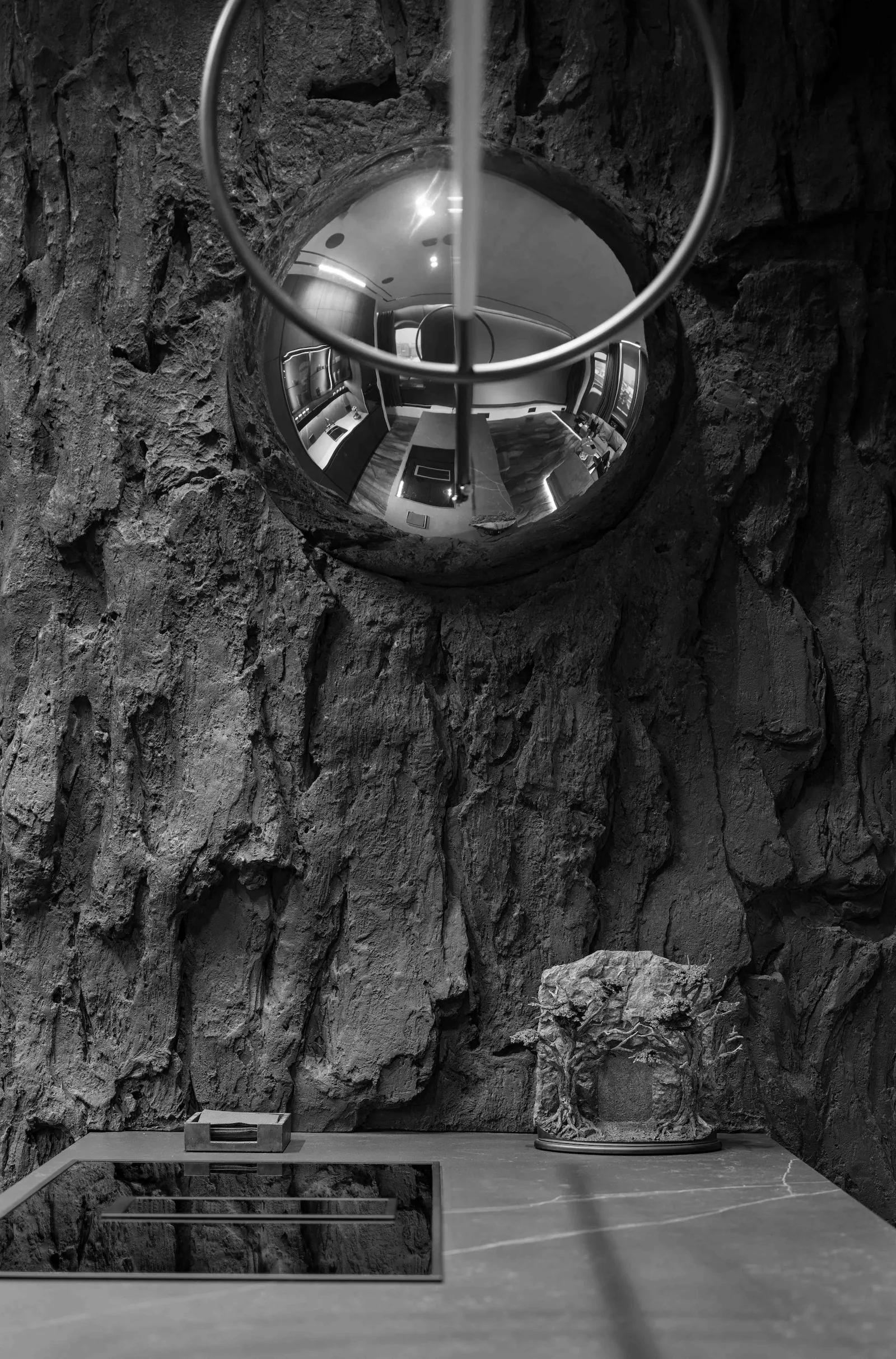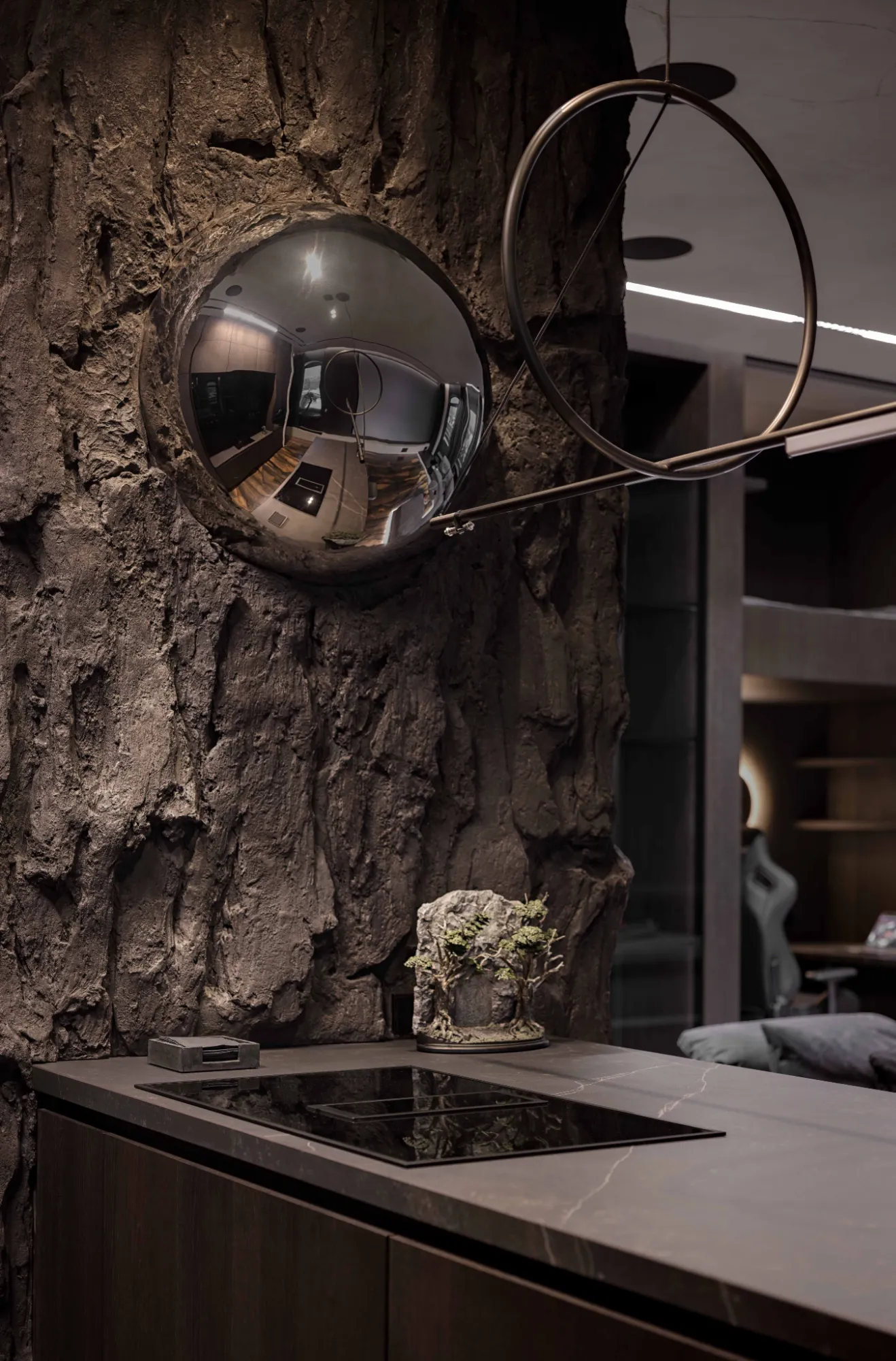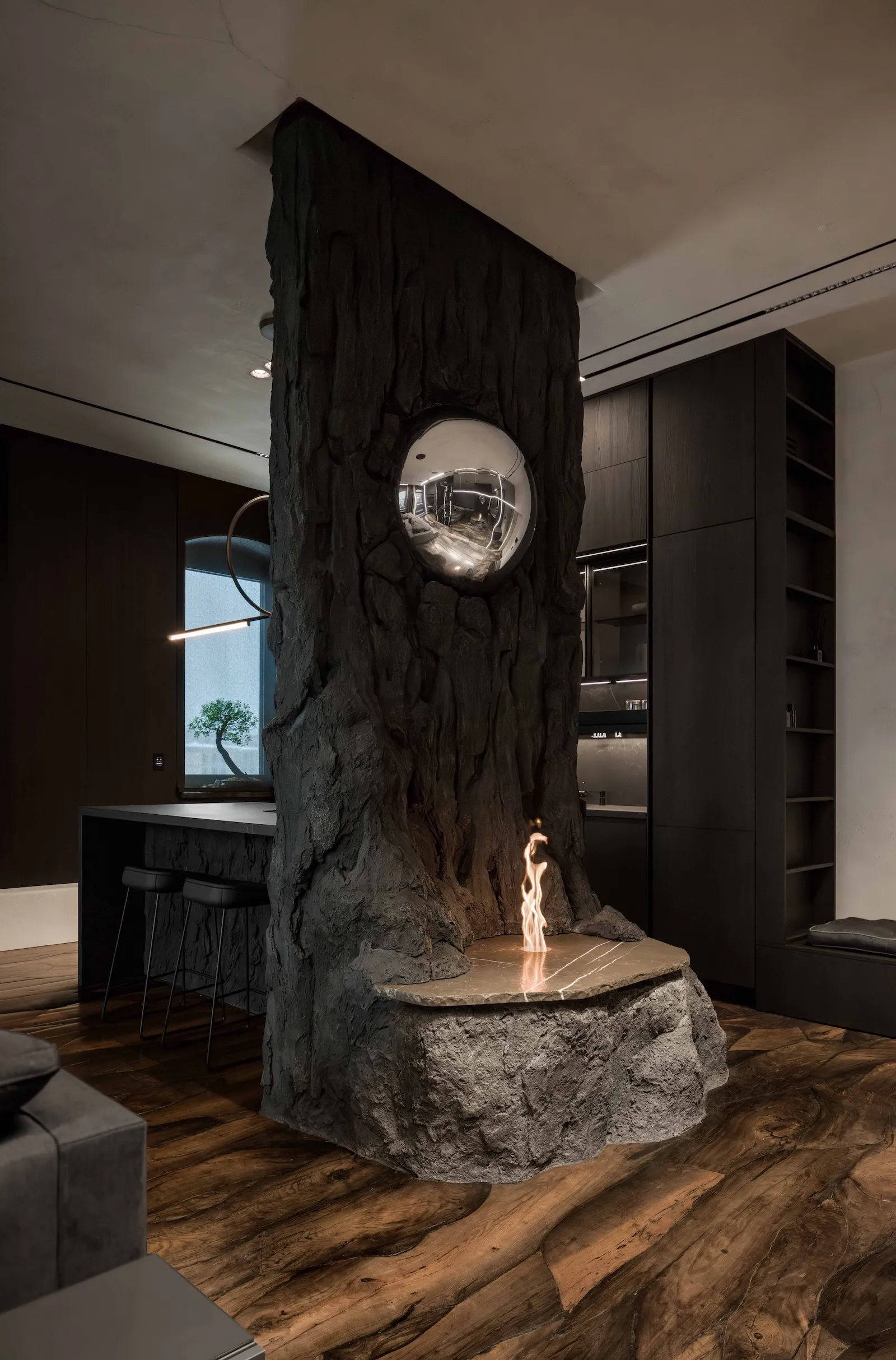 Скелю пронизує металева, дзеркальна куля, яка, створює неймовірні рефлекси від палаючого вогнища в просторі квартири.Ми інтегрували в підлогу справжнє мистецтво, що створила природа України, а саме деревина, яку добувають в болотах Карпат до 300 кв. м2 на рік. Це морений дуб, якому, за експертизою, від 800 до 3000 років! Це справжнє мистецтво, створене природою! Таким чином ми доповнили самобутній та печерний образ квартири.