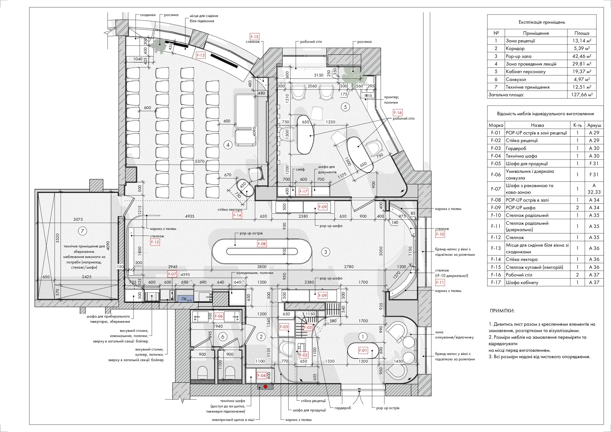 Планувальне рішення побудоване як сценарій: від моменту входу відвідувач потрапляє у заздалегідь продуманий потік руху. Рецепція з зоною очікування плавно веде до лекторію на 30 місць, звідти — до демонстраційної зони. Ніяких затримок чи скупчень при заповненості простору людьми.