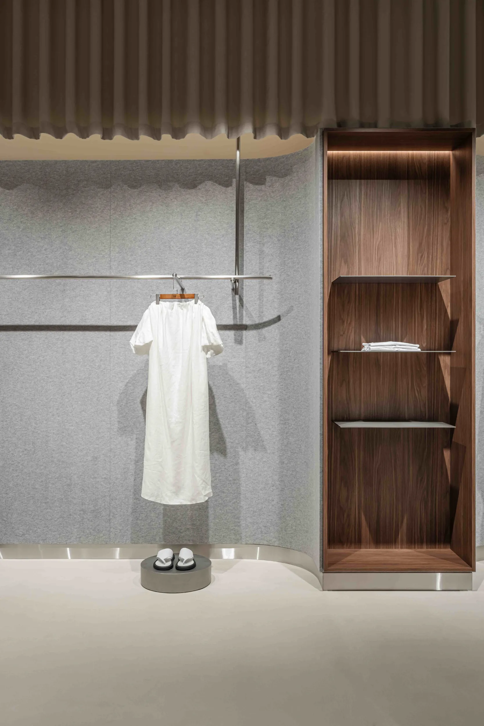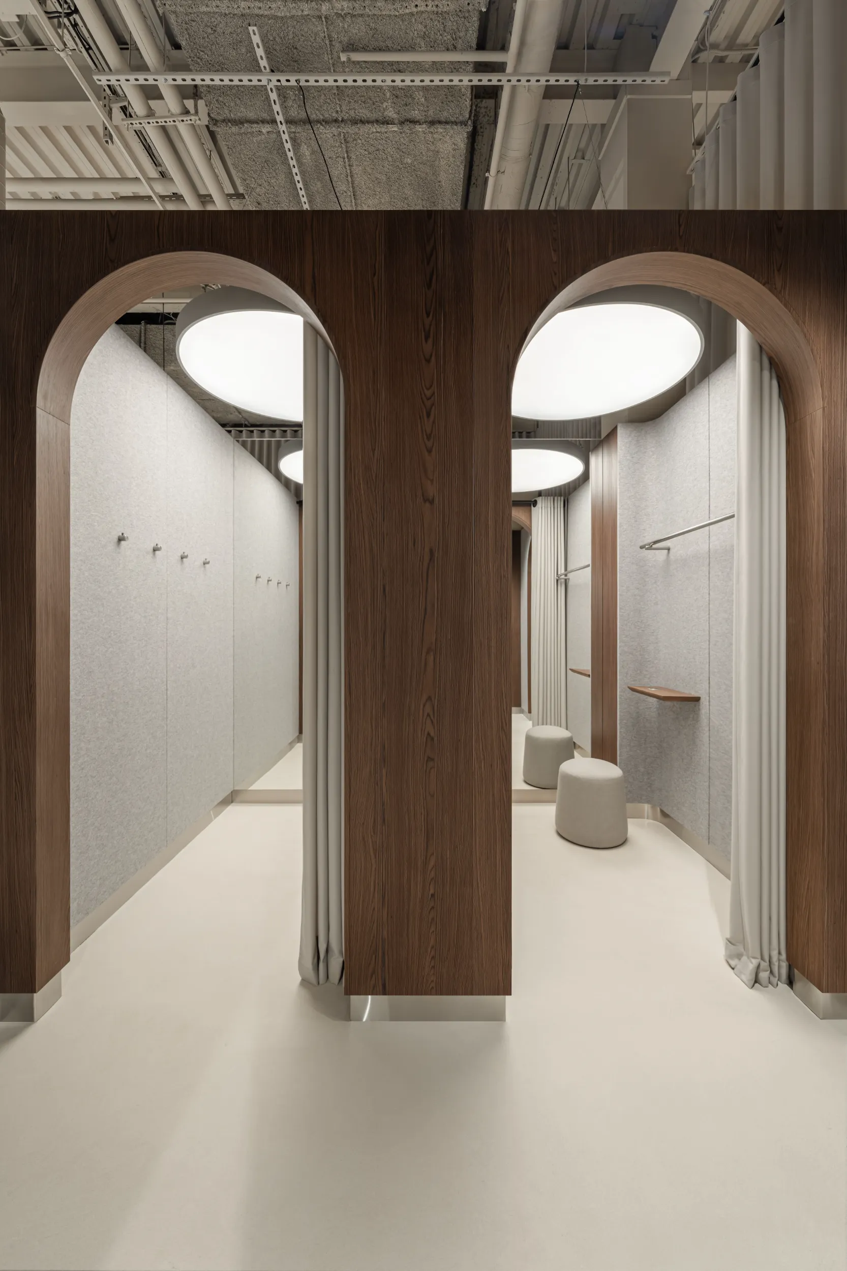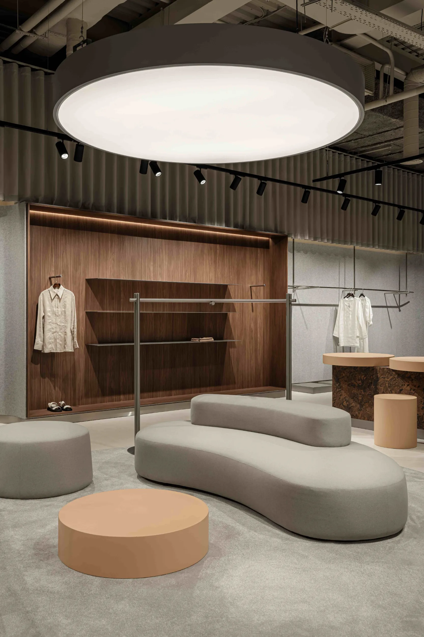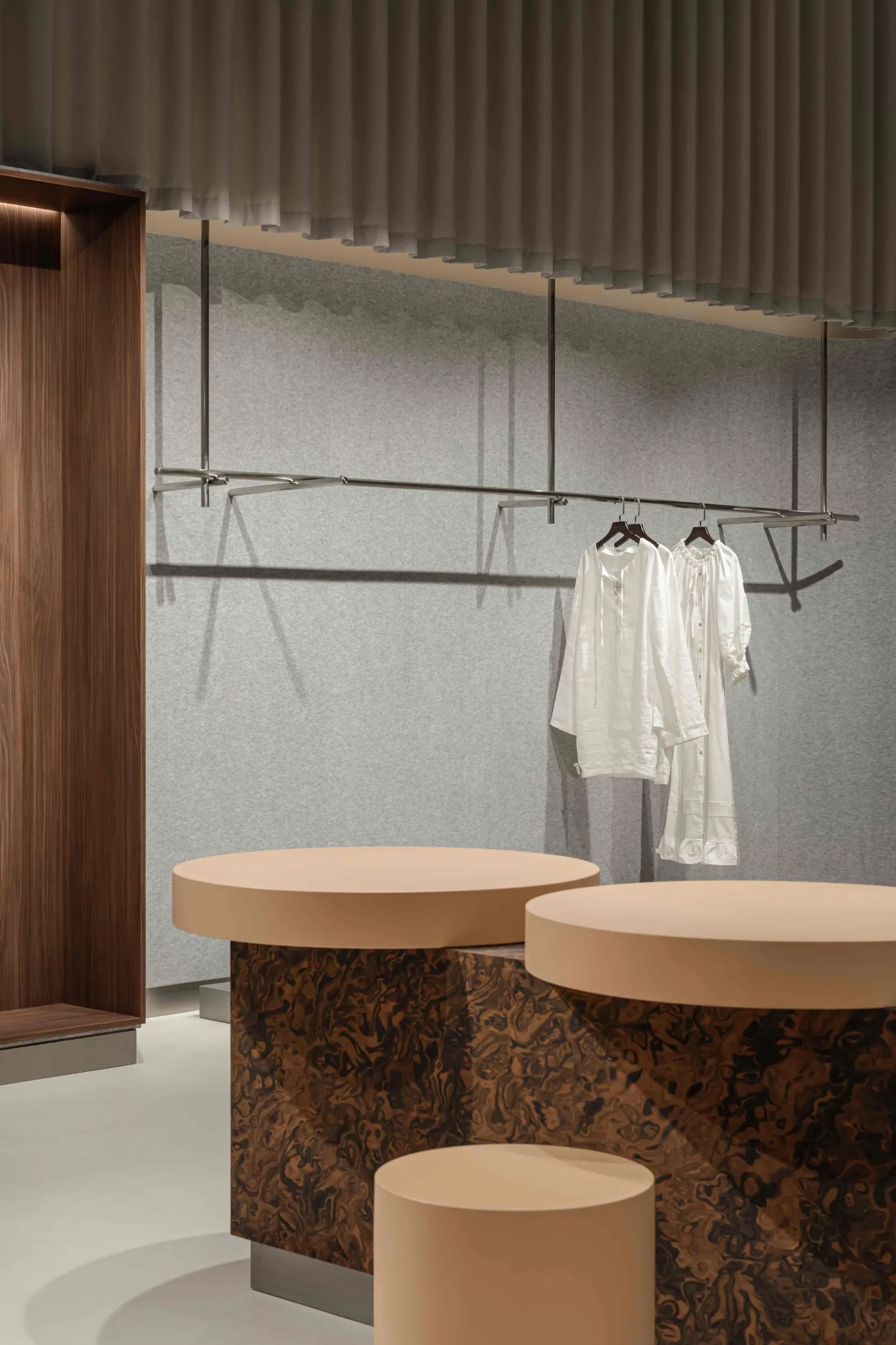 Відвідувачів зустрічає стильний дерев’яний стіл, оздоблений шпоном кореня, де представлені аксесуари та одяг. Це розділяє потік людей і створює тепле враження з перших секунд перебування в магазині.