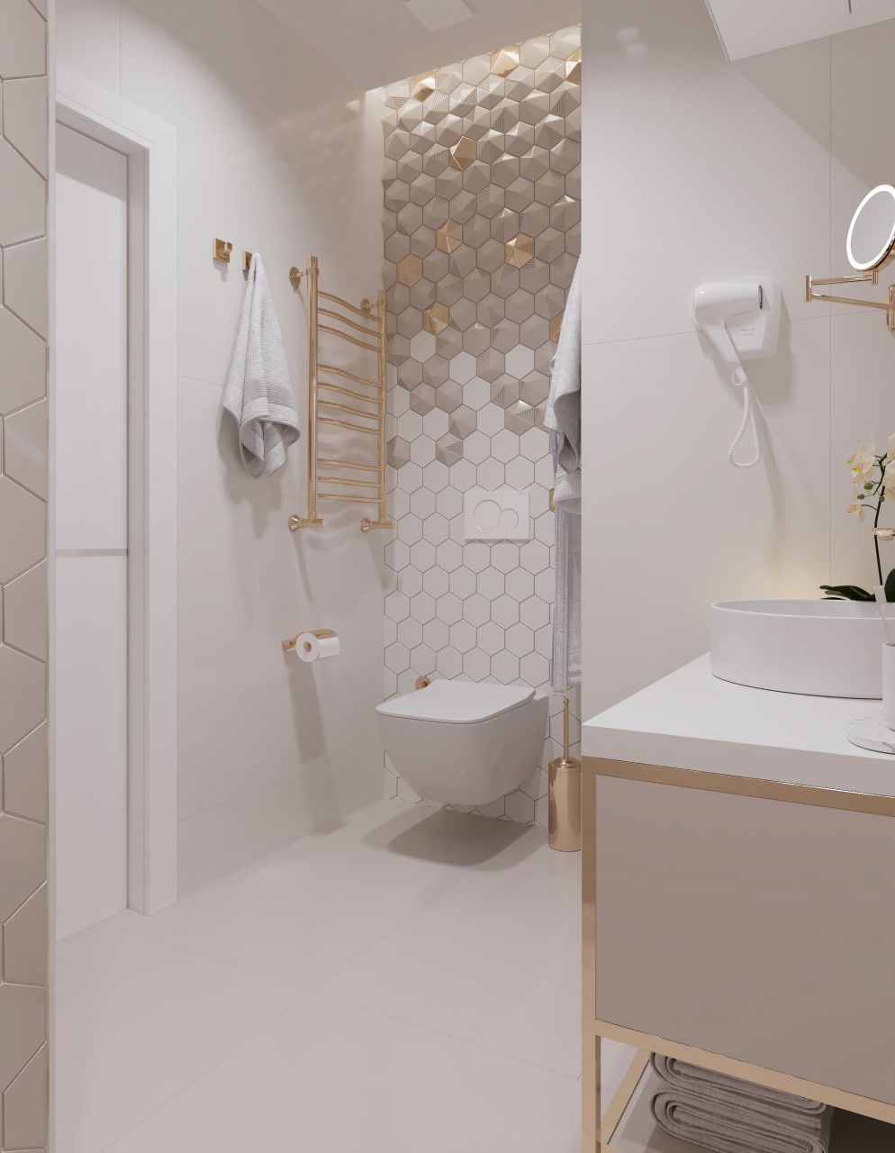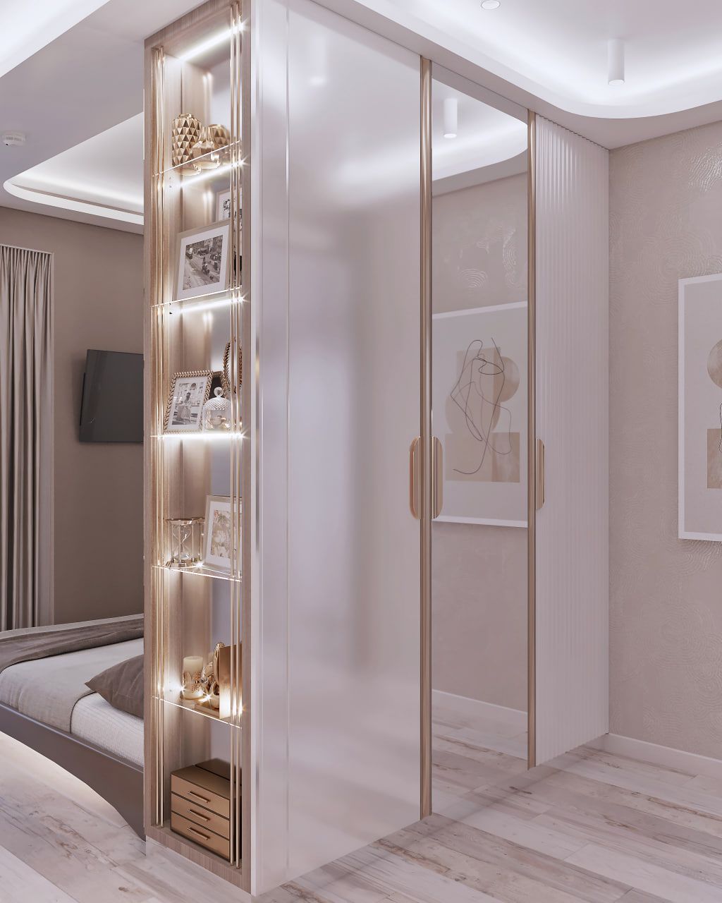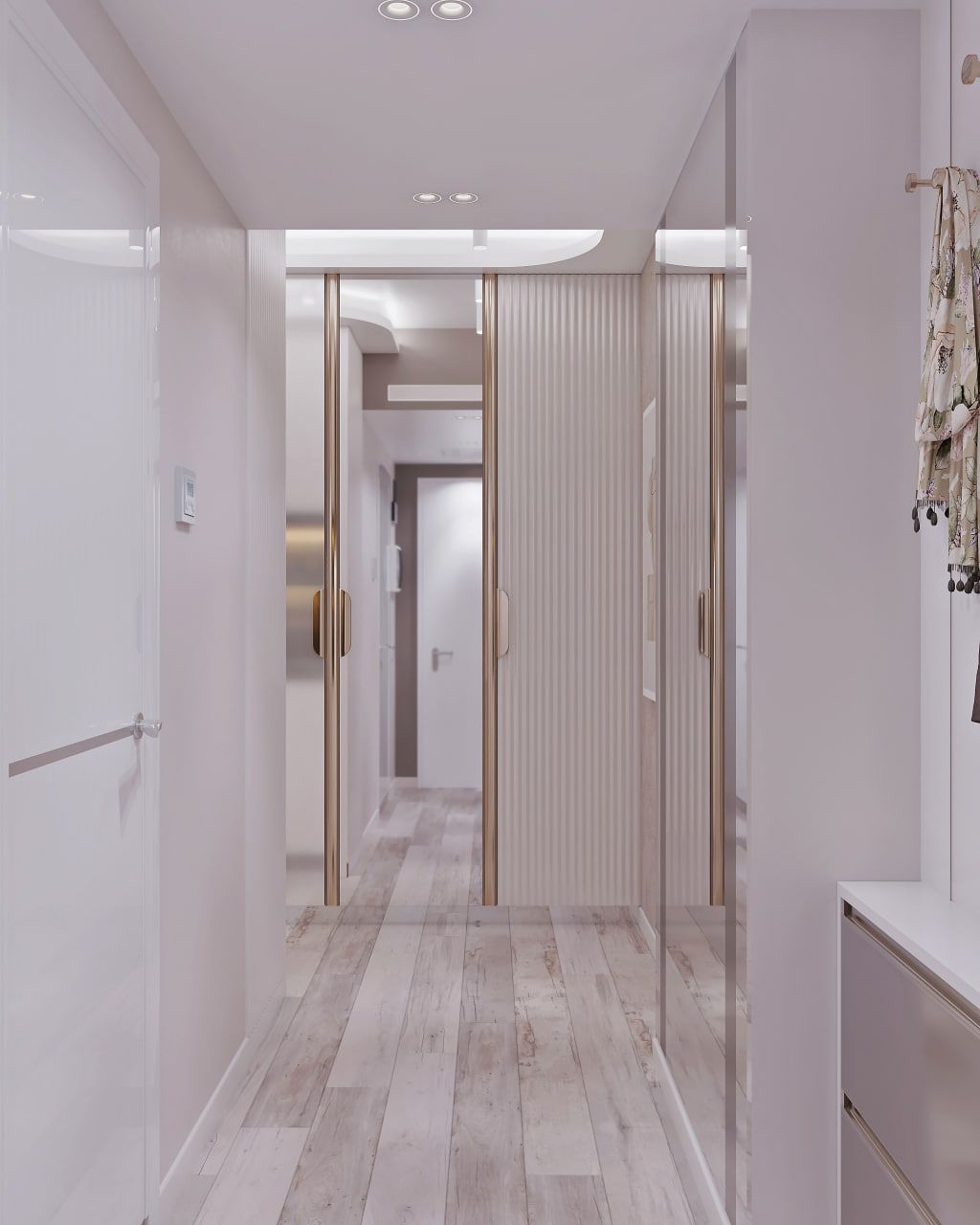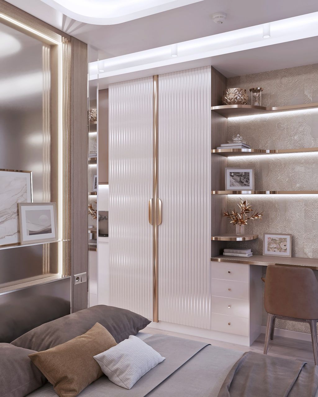 Світла палітра з золотими акцентами, глянцеві поверхні та вбудоване освітлення створюють ефект відкритого простору, який «розширює» межі квартири. Закруглені деталі меблів і делікатна підсвітка полиць нагадують відблиски сонця на воді, додаючи простору динаміки та особливого шарму.