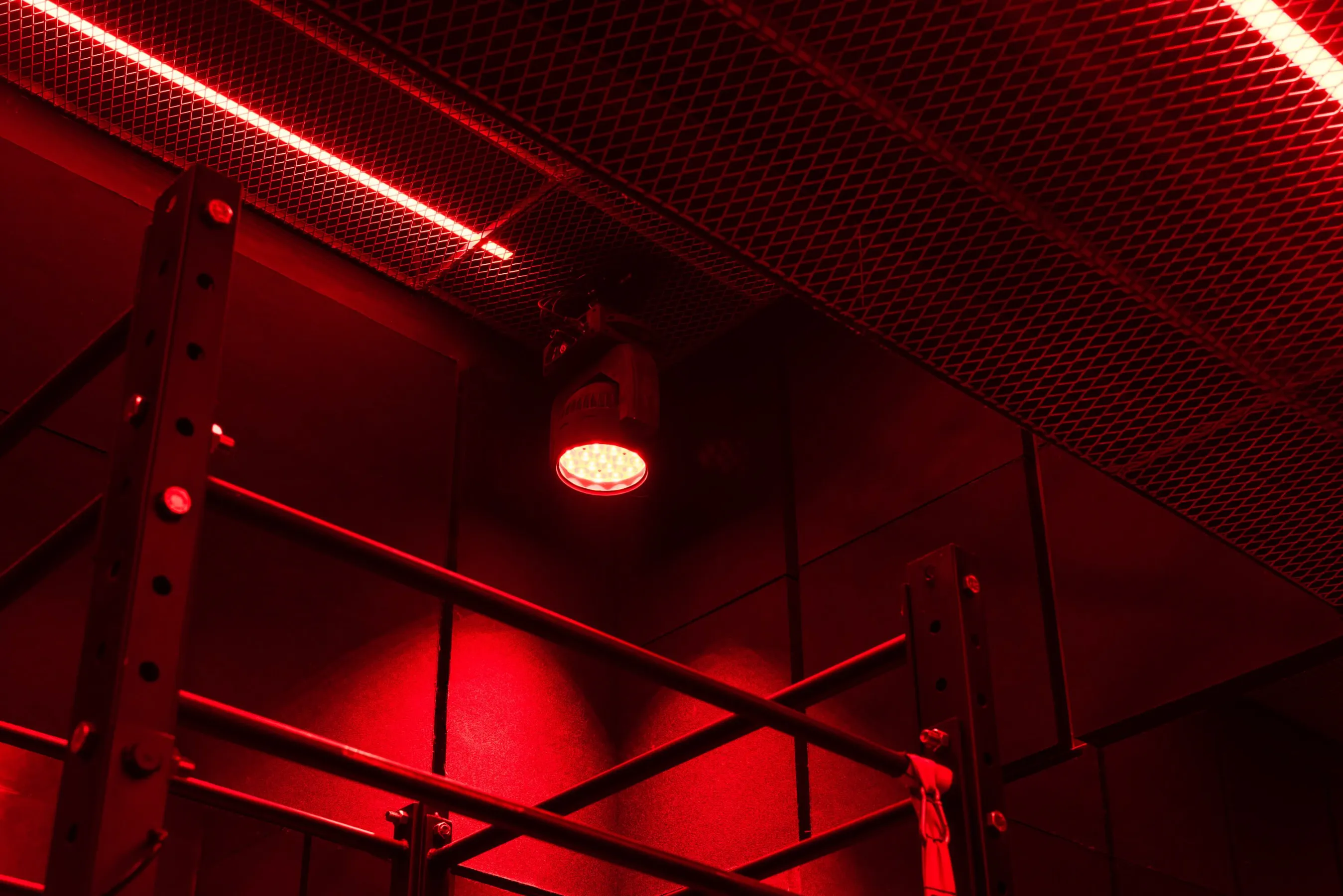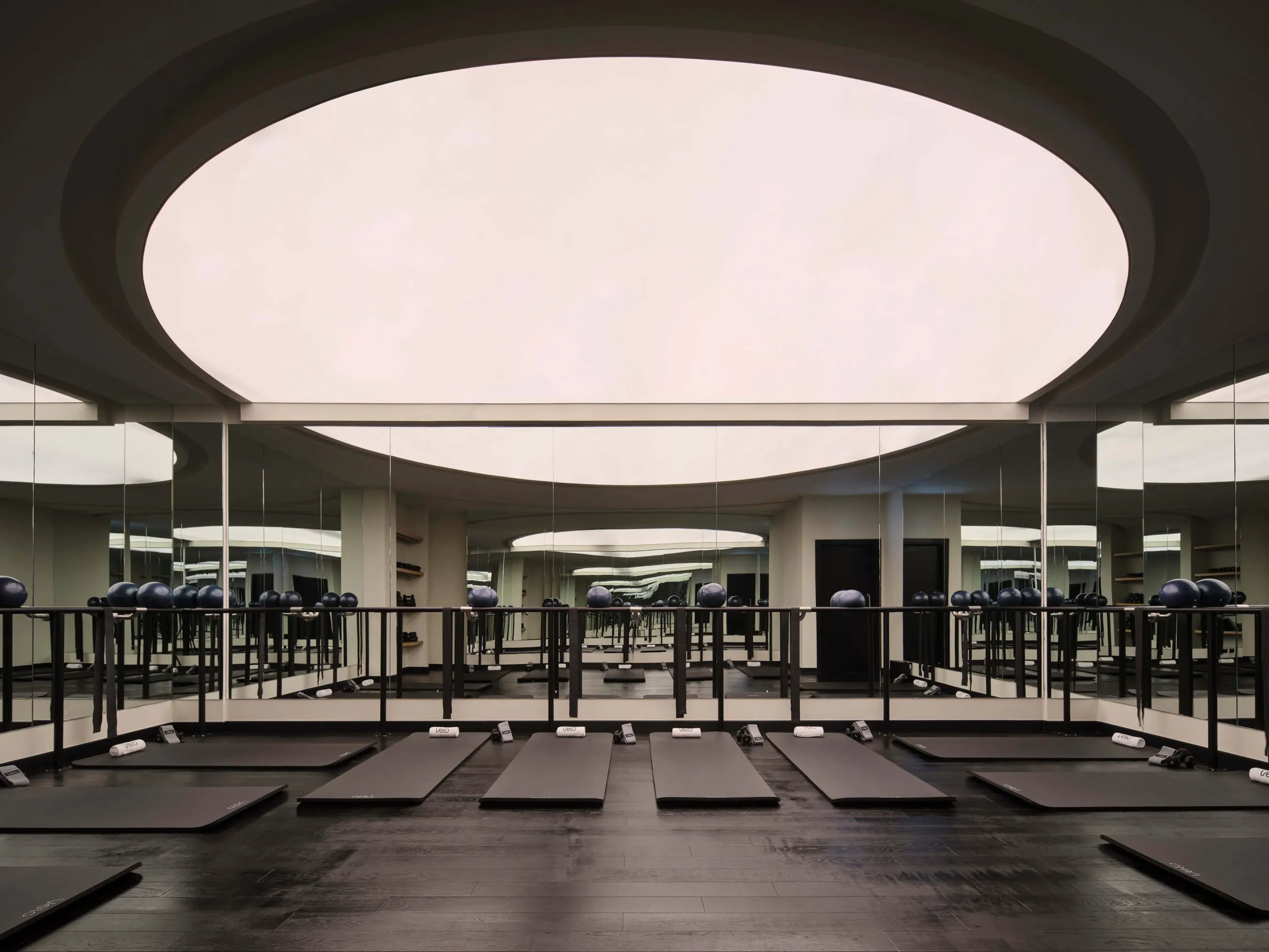 Кожен зал має власну атмосферу. Сайклінг — повністю затемнений, з дзеркалами та неоном, що множать ритм і створюють відчуття занурення; RACK — структурний і чіткий, з металевими рамами, сітчастими стелями та виразною симетрією; FORM — світлий і спокійний, із м’яким розсіяним світлом і теплими матеріалами, які знімають напругу. Контраст між залами працює як чергування навантаження й відновлення, формуючи цілісну архітектурну драматургію.