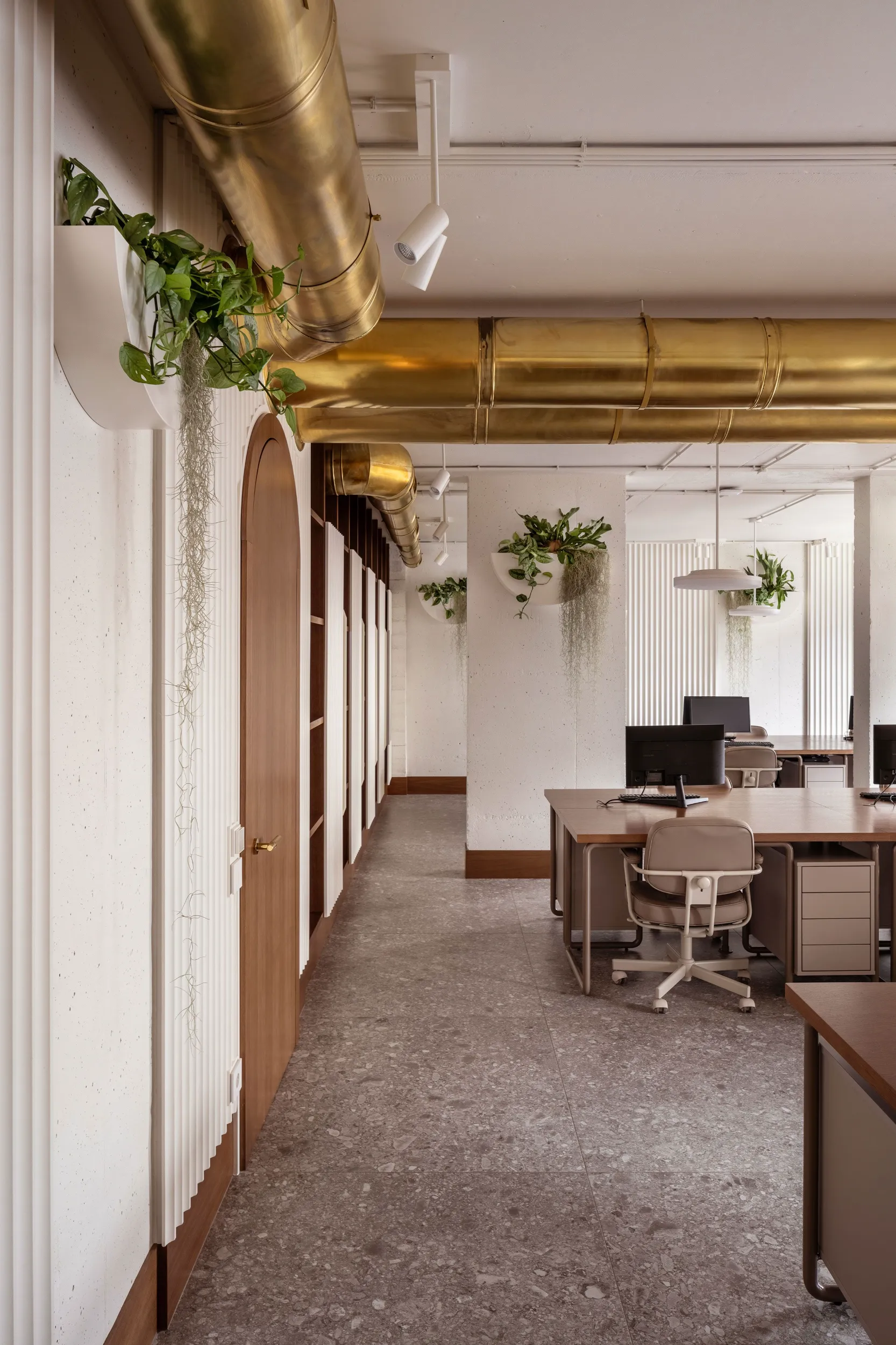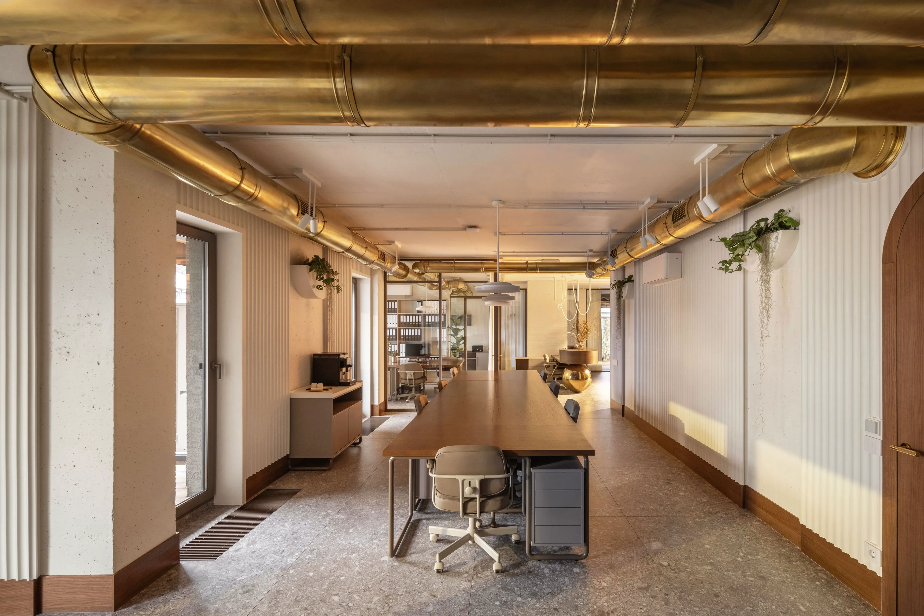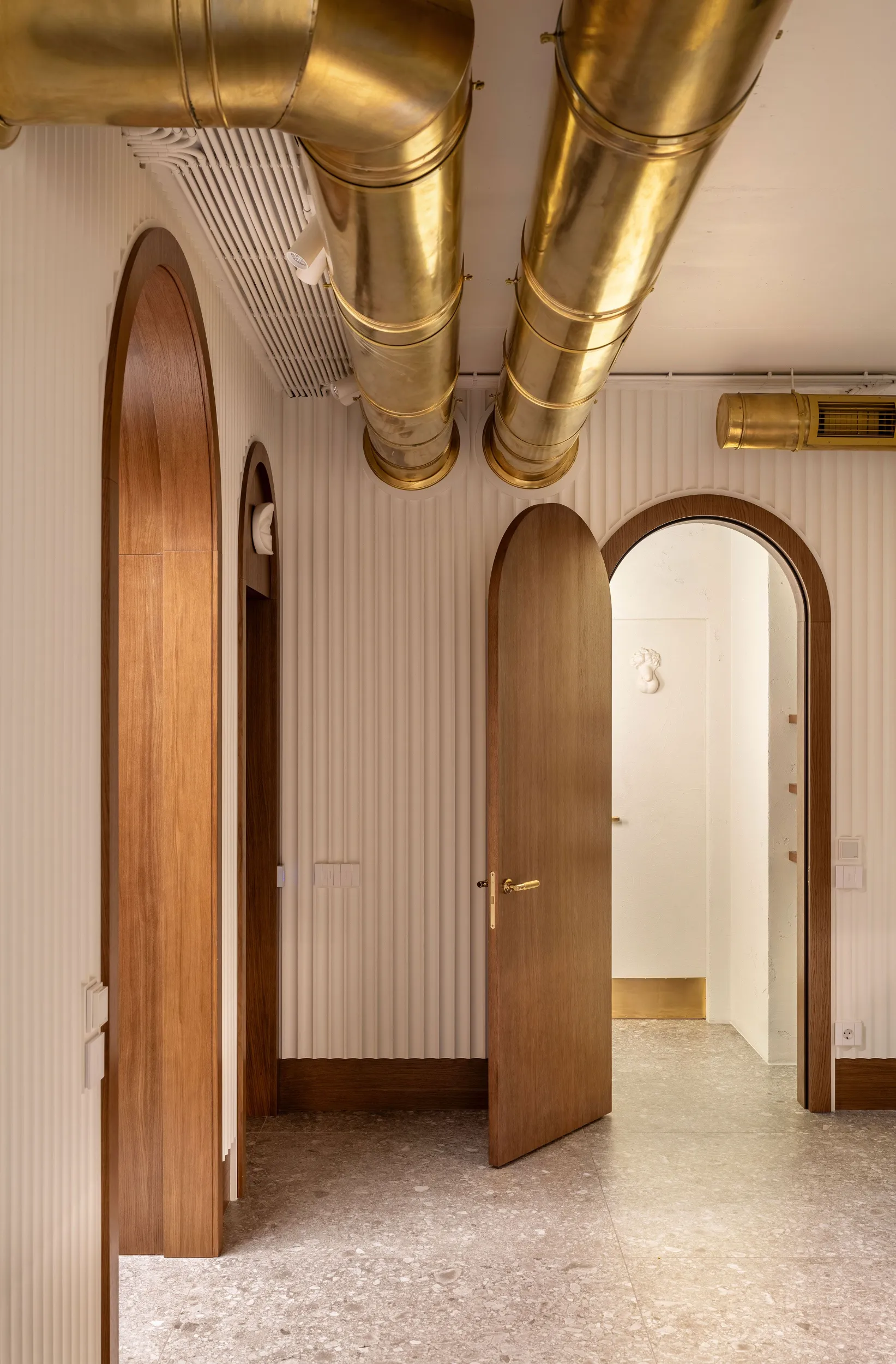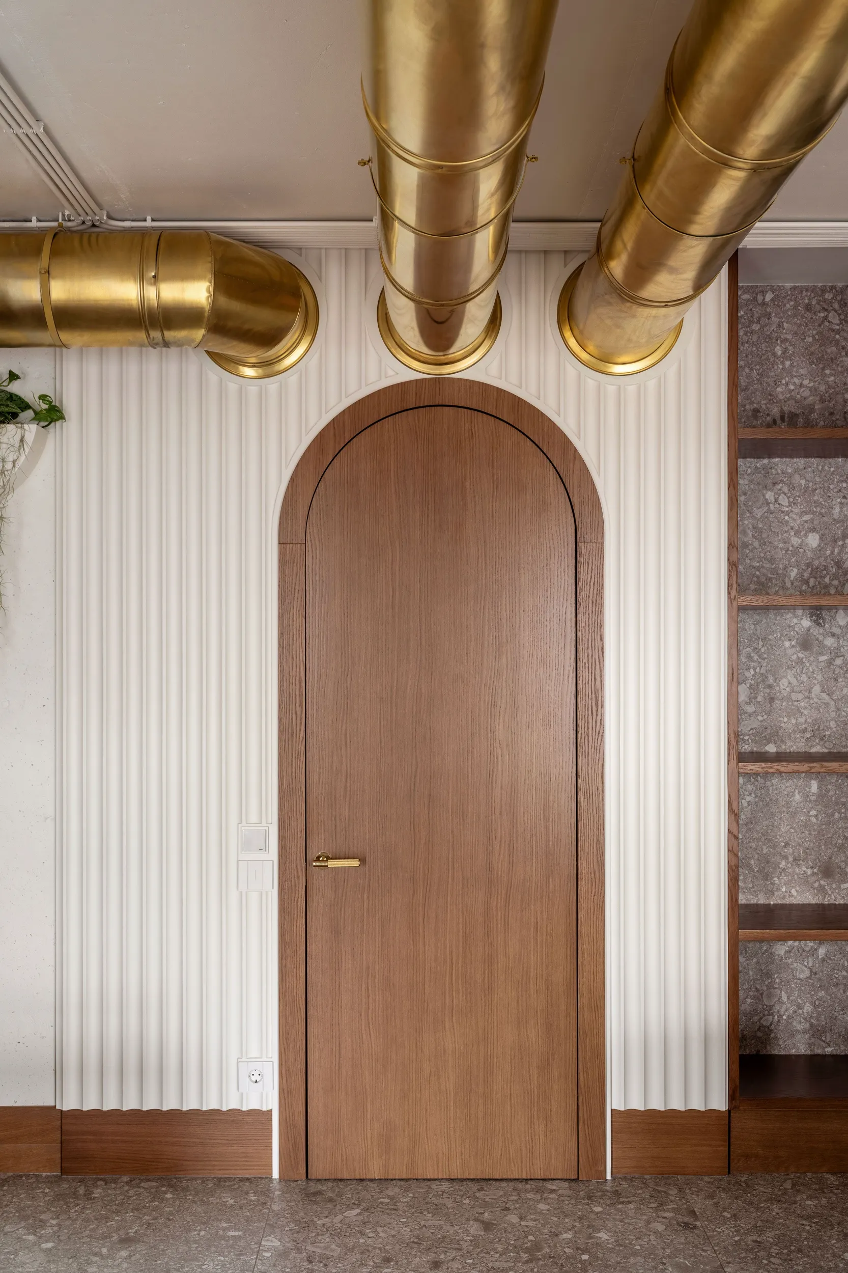 Ключовим рішенням стала відкрита система вентиляції з цільної латуні. Живий метал, що змінює колір і фактуру з часом, став центральним акцентом та задав характер усьому простору. Поєднання бетону, латуні, дерева, гіпсу та світла створило середовище, де матеріали працюють не лише естетично, а й символічно.