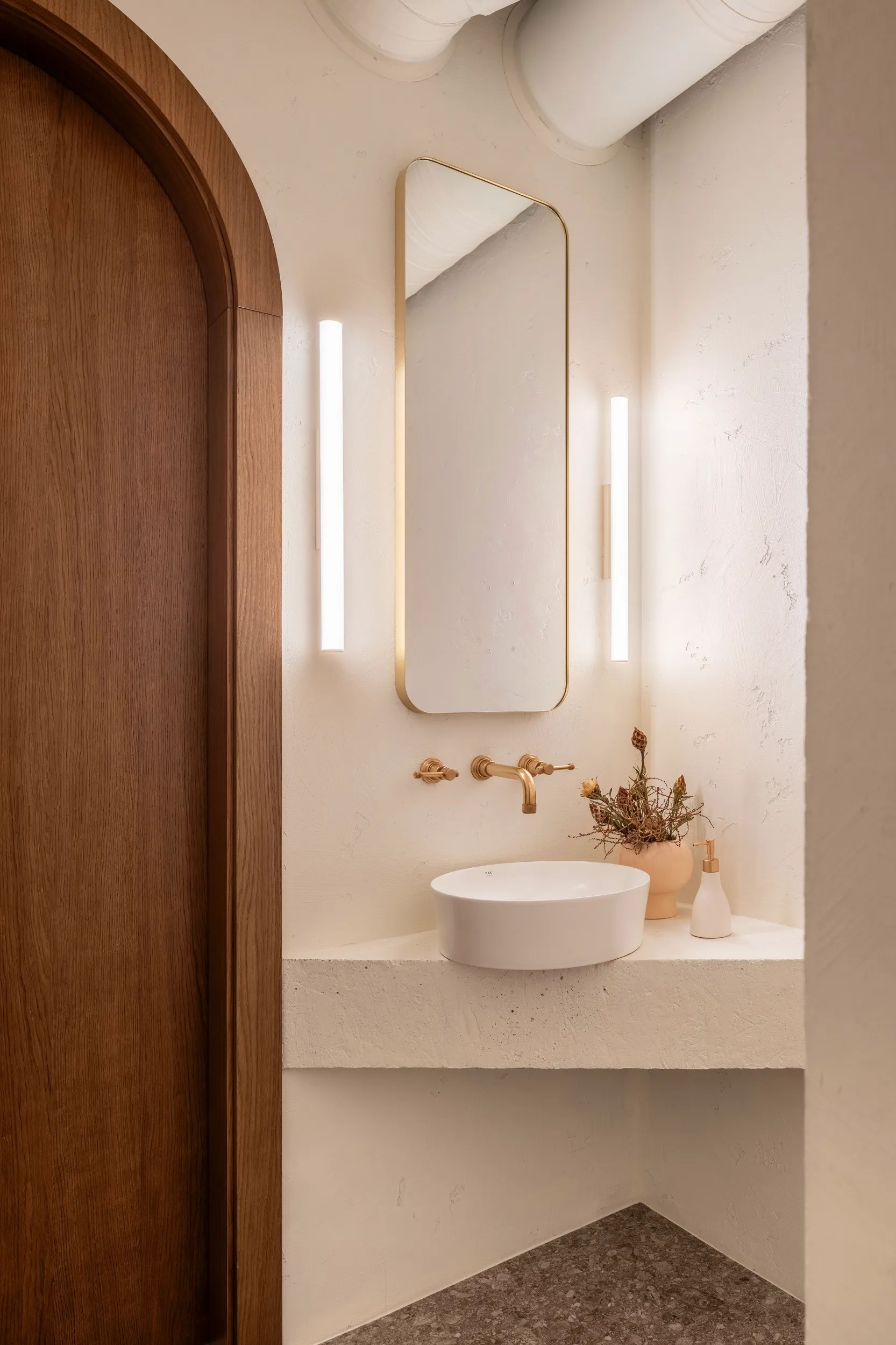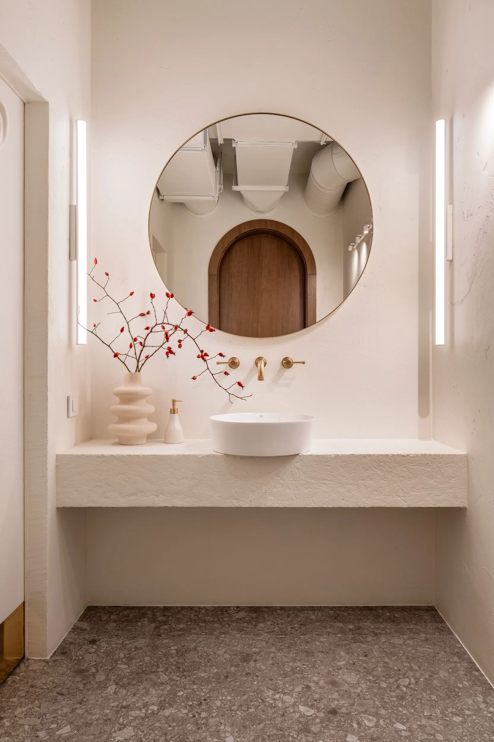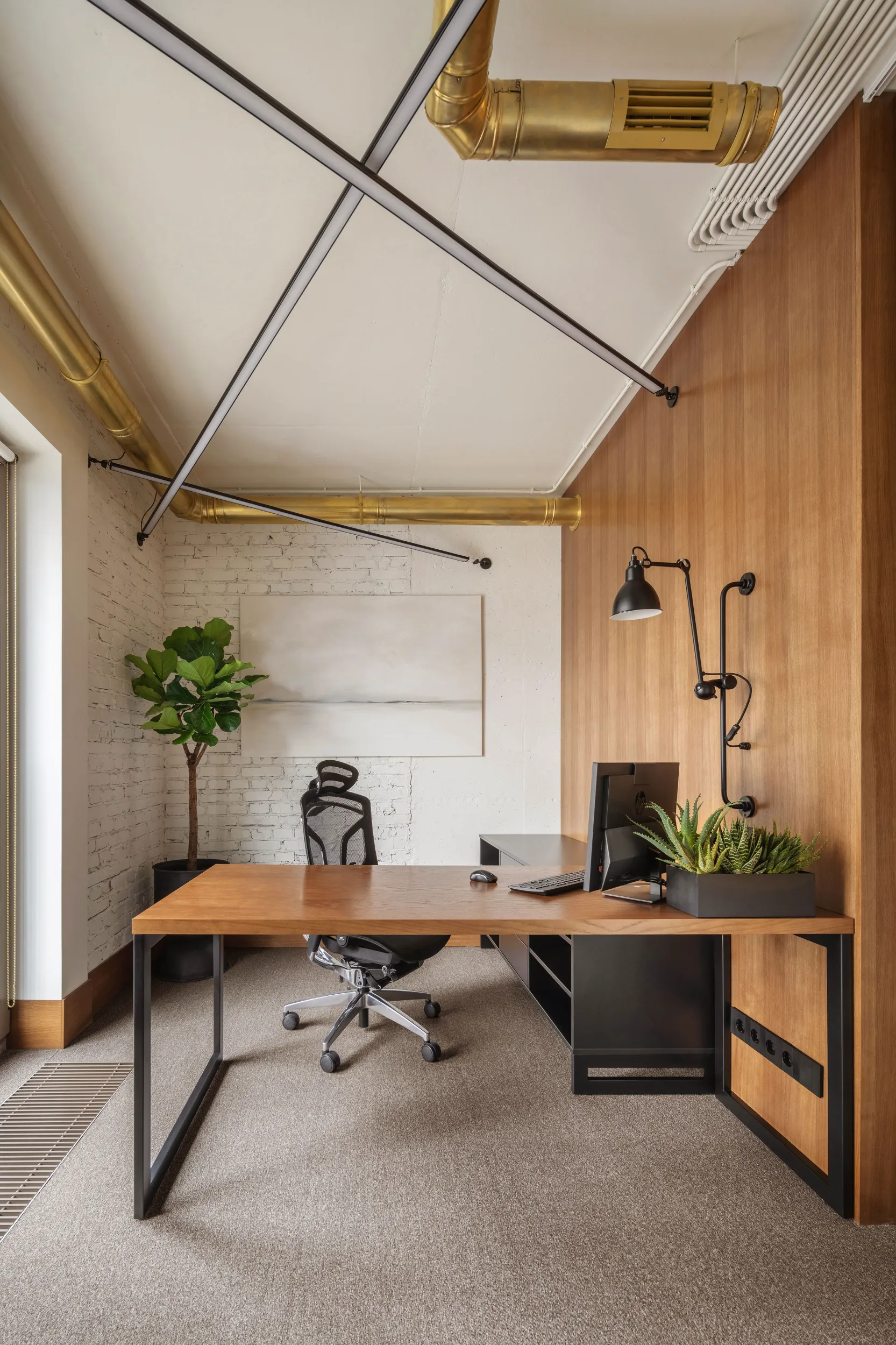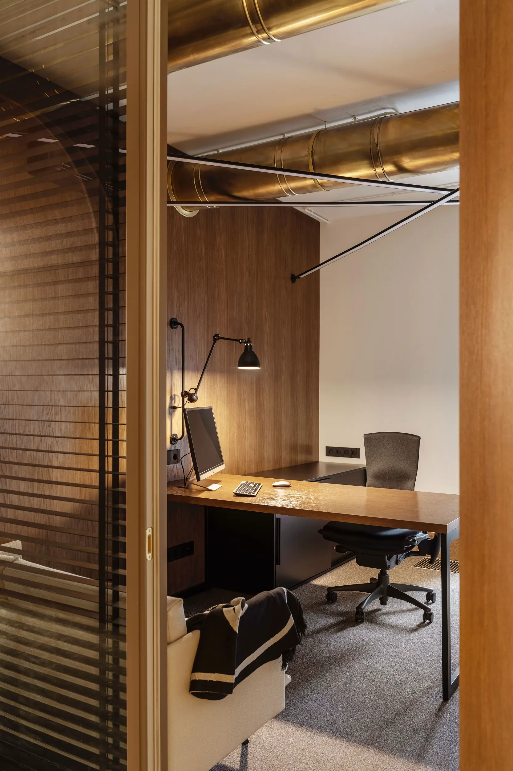 Ключовим рішенням стала відкрита система вентиляції з цільної латуні. Живий метал, що змінює колір і фактуру з часом, став центральним акцентом та задав характер усьому простору. Поєднання бетону, латуні, дерева, гіпсу та світла створило середовище, де матеріали працюють не лише естетично, а й символічно.